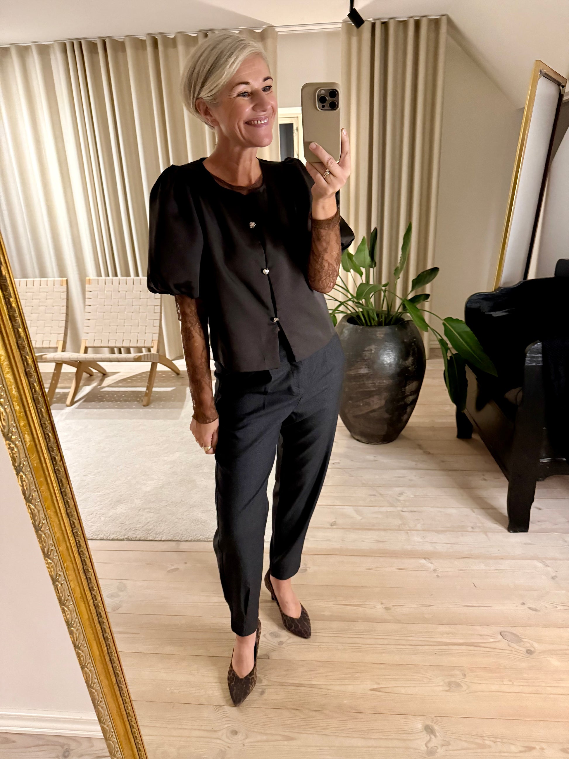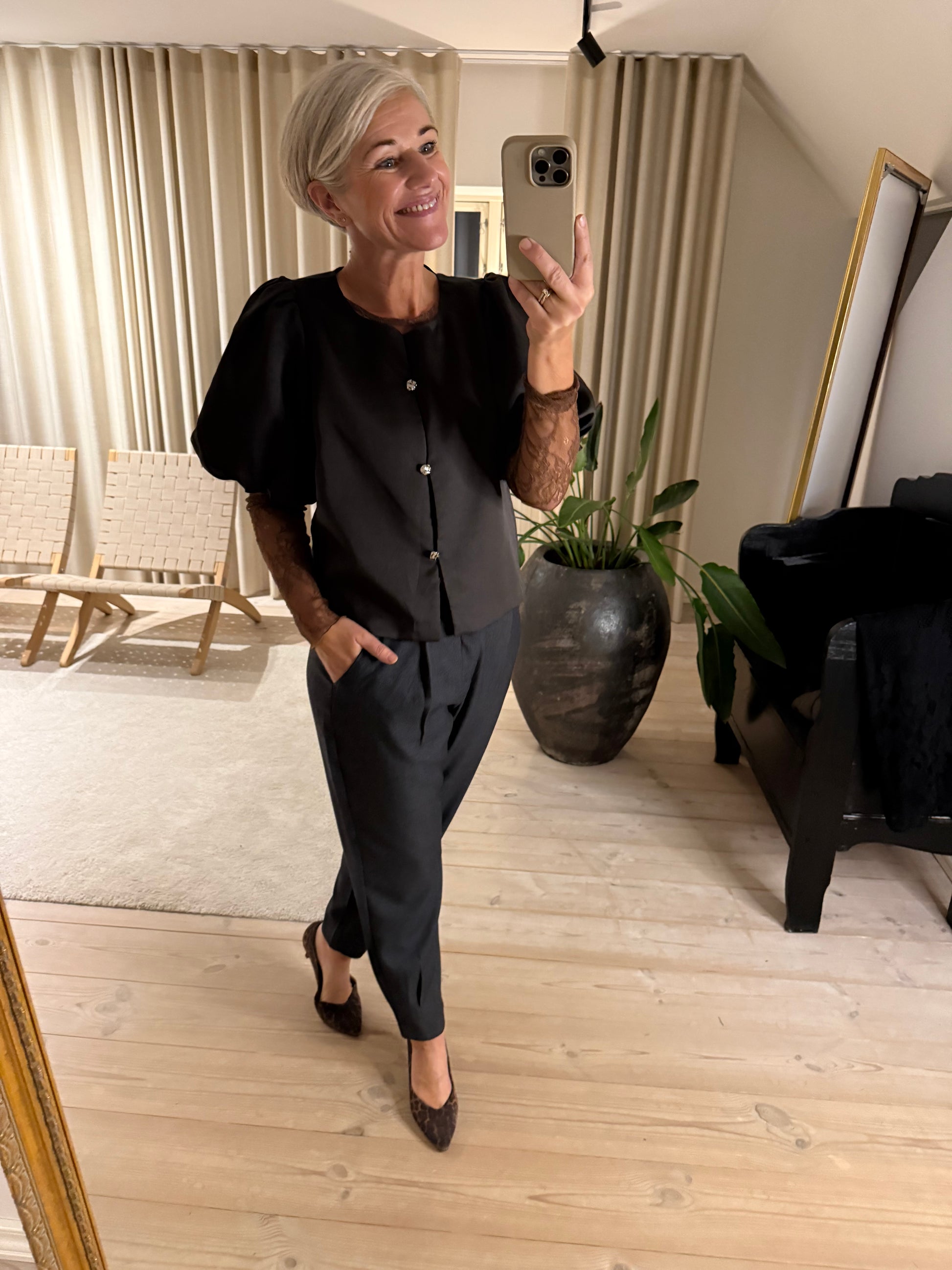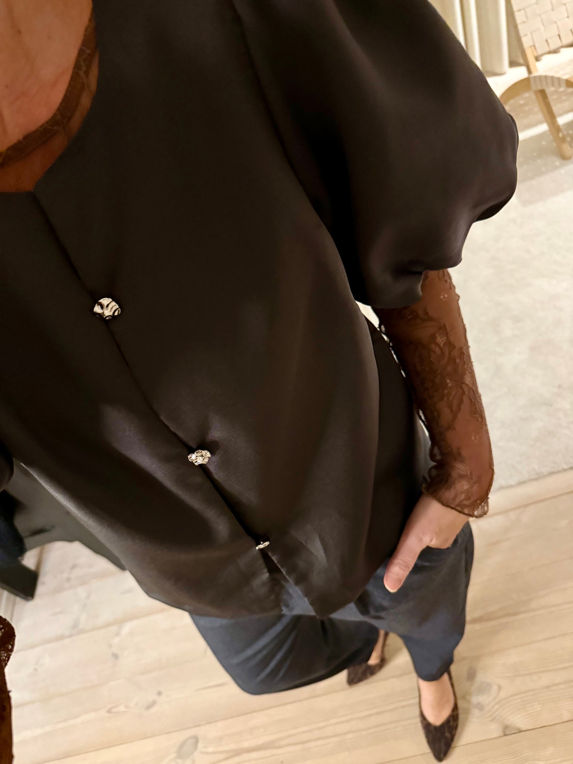 Fin bluse med pufærmer og knappelukning foran til, kan også blivebrugt som en lille jakke. Modellen er 176cm og bærer en størrelse 36.