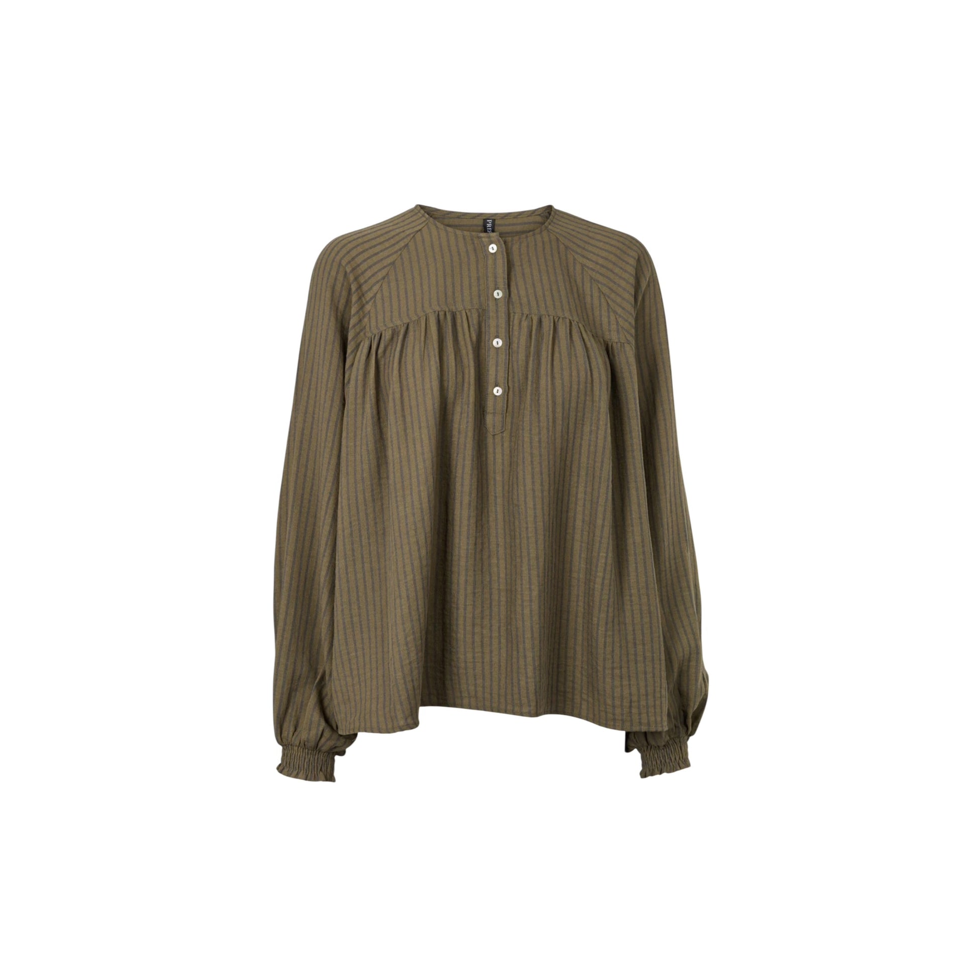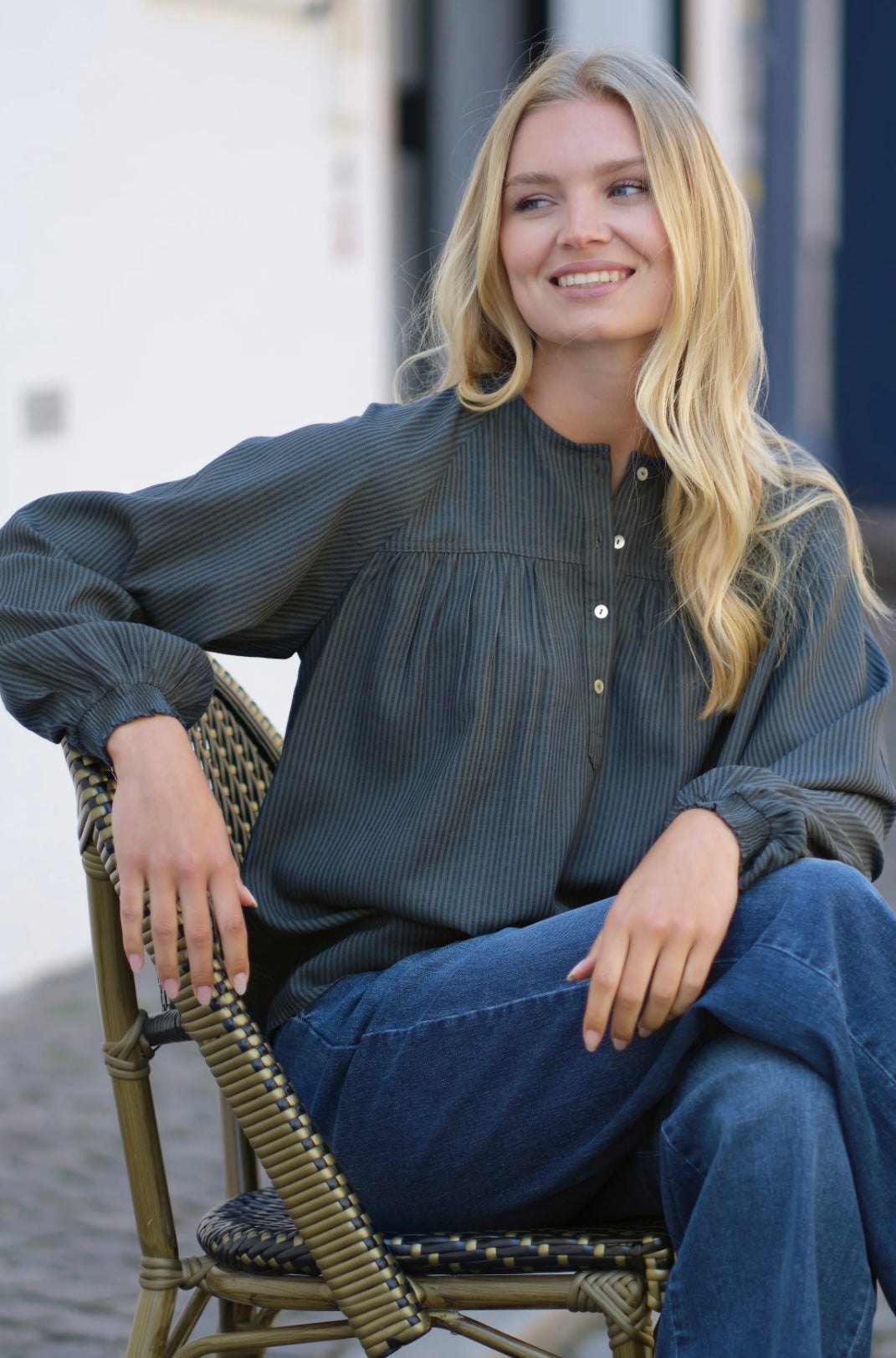 Nella blusen har et afslappet og boheme-inspireret design med fine, lodrette striber i grønne og mørke nuancer. Den har en løs pasform med rynkede detaljer over brystet, knaplukning foran og lange ærmer med elastik ved håndleddene.