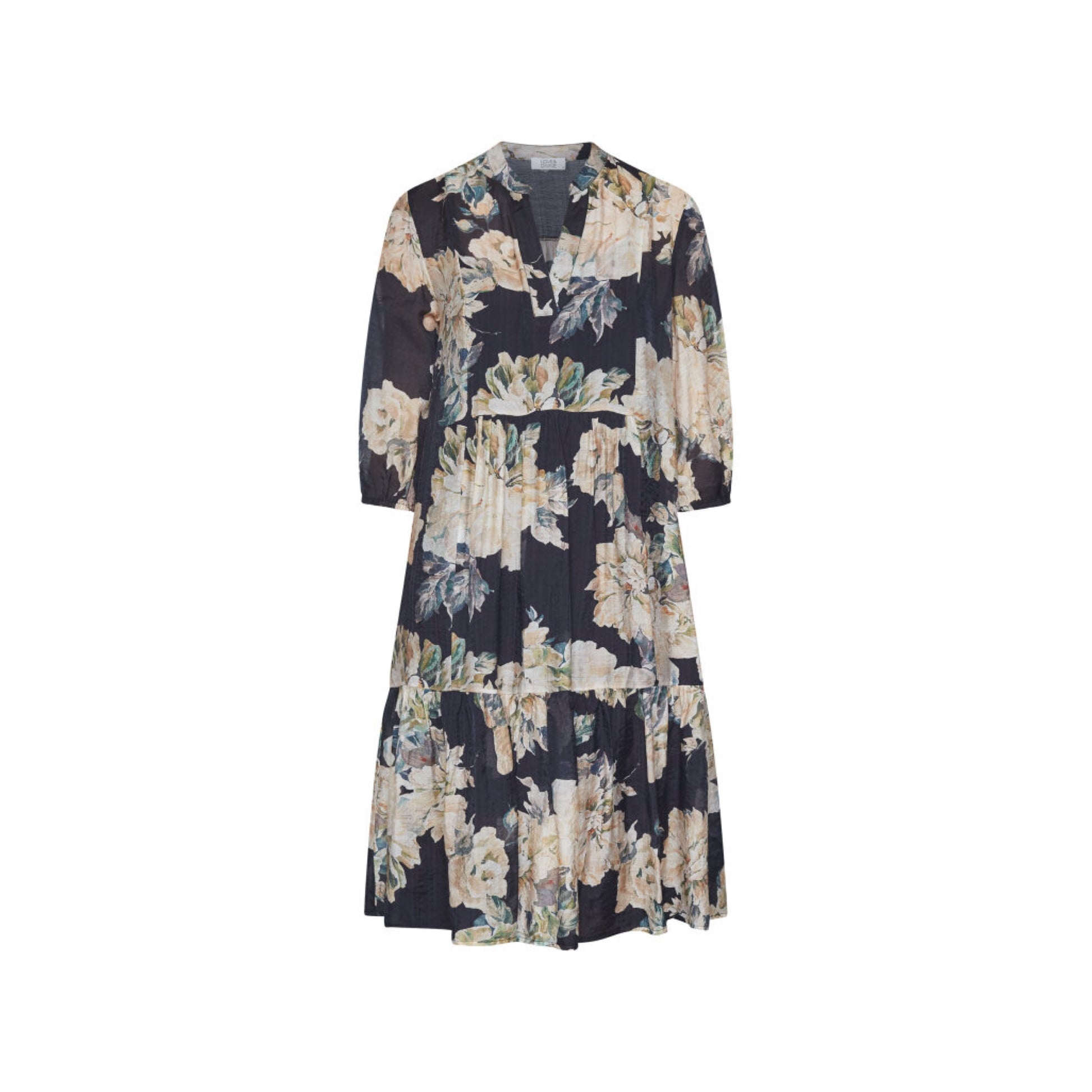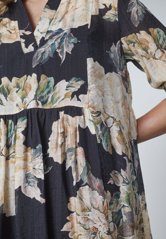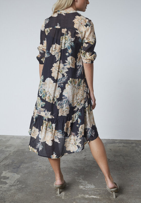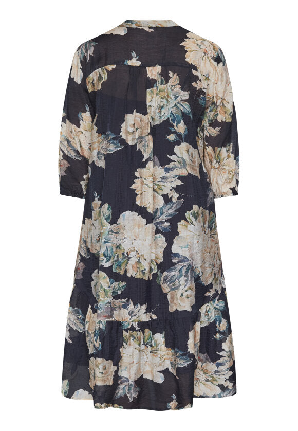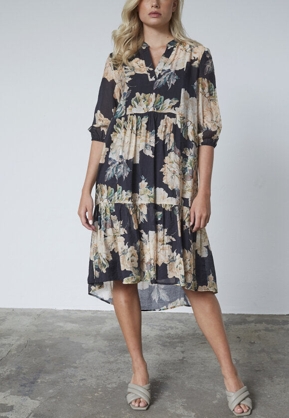 Love958-9 er en mønstret kjole i midilængde, har en v-hals og trekvartlange ærmer. Kjolen har et løst snit med et rynket stykke under brystet og et let asymmetrisk skørt.