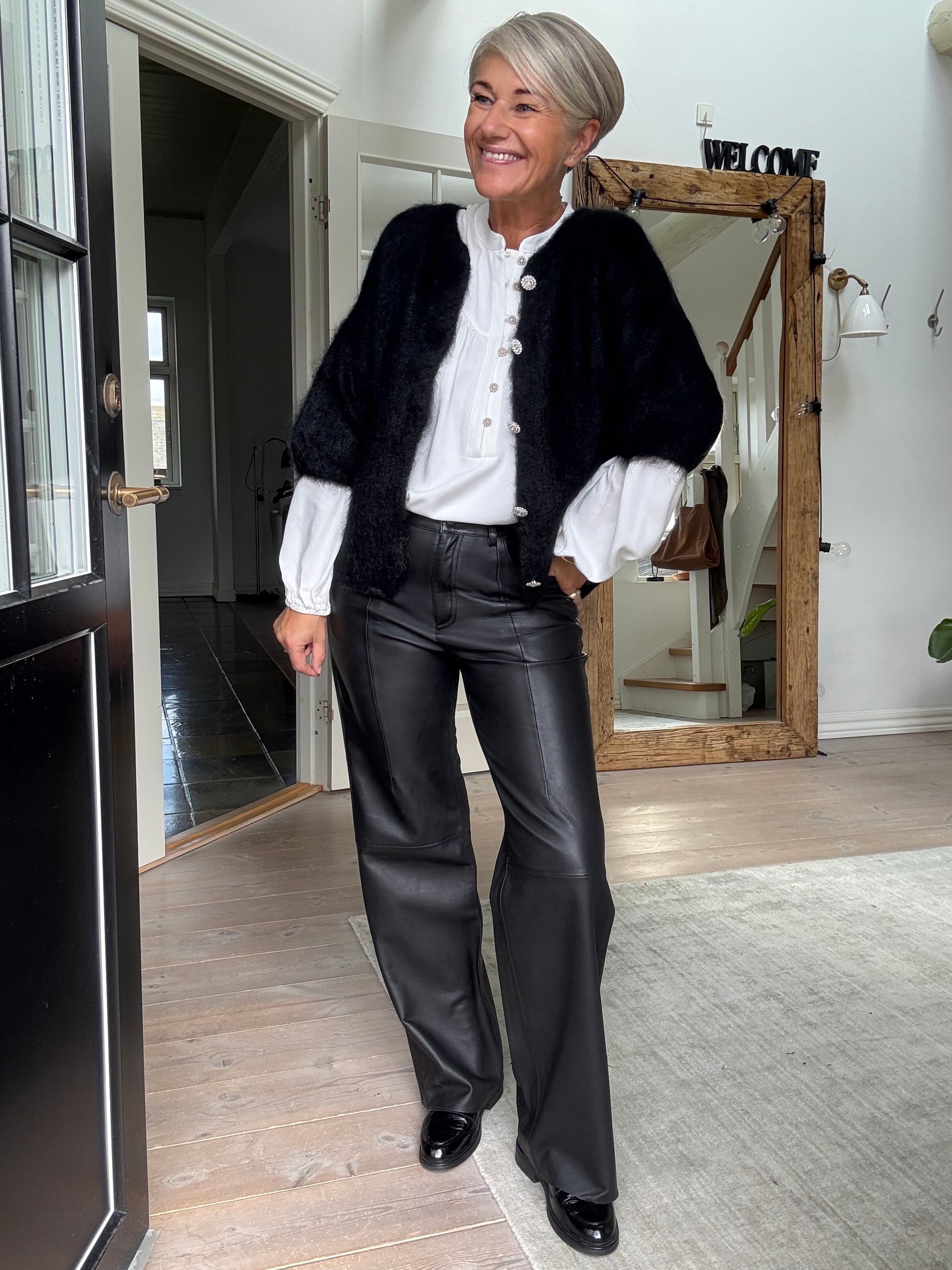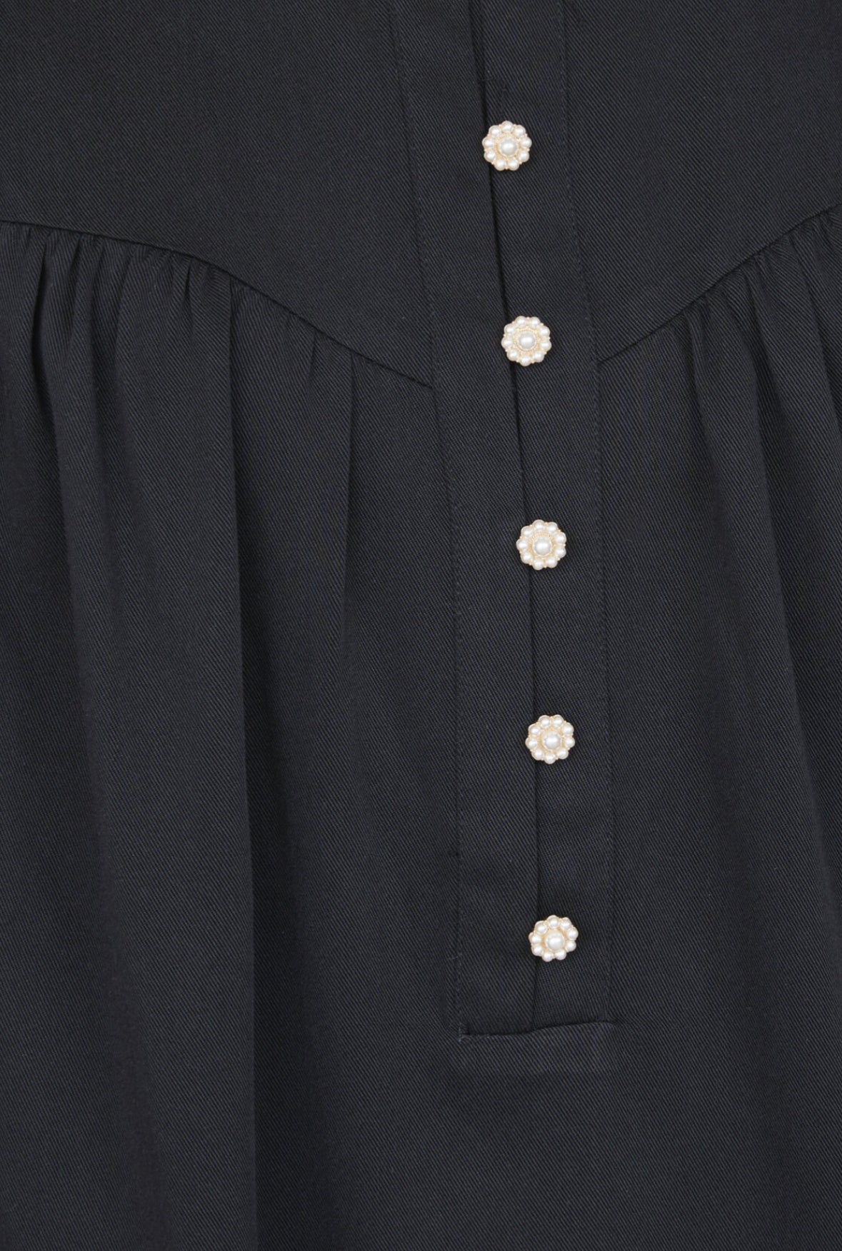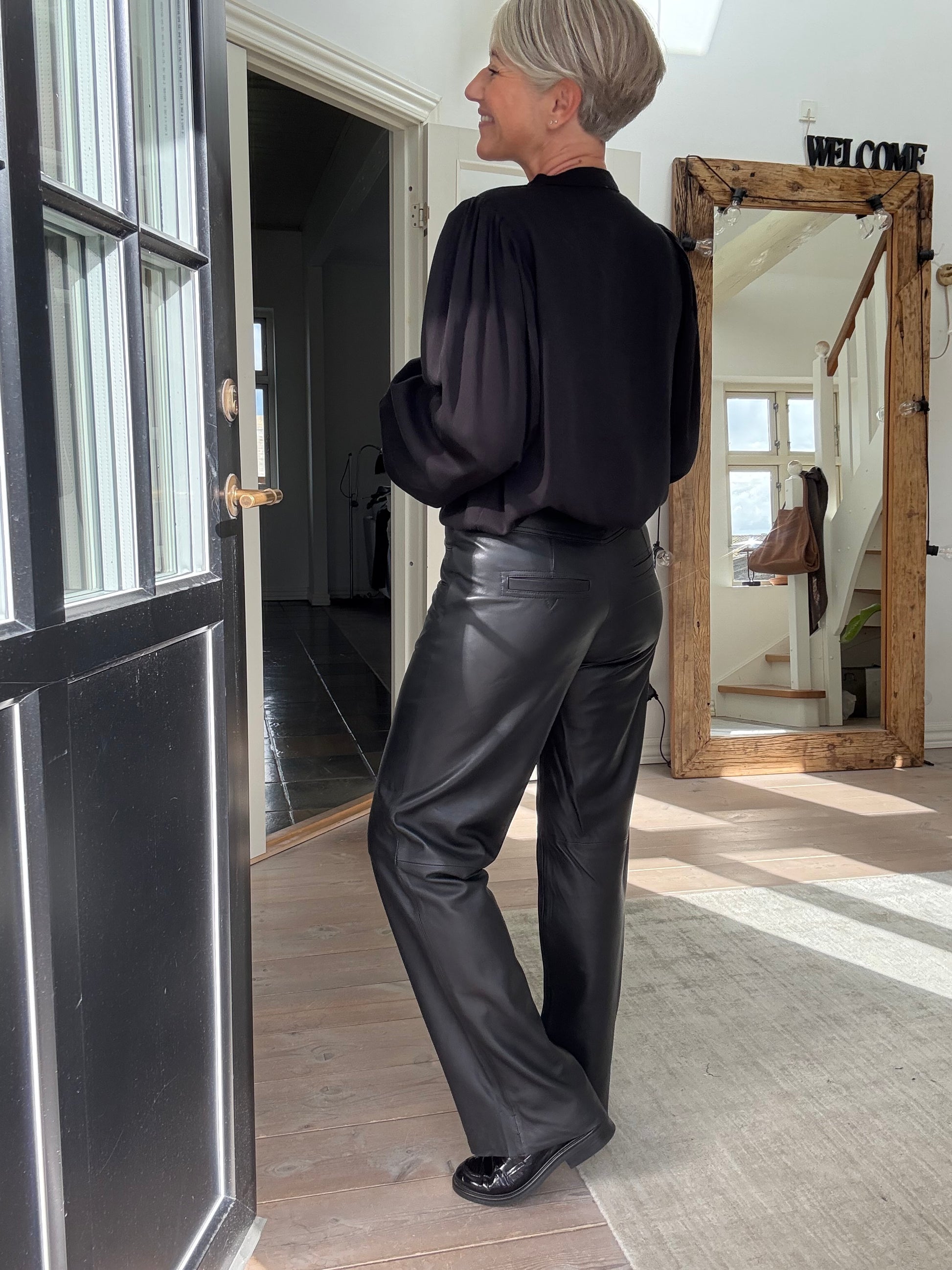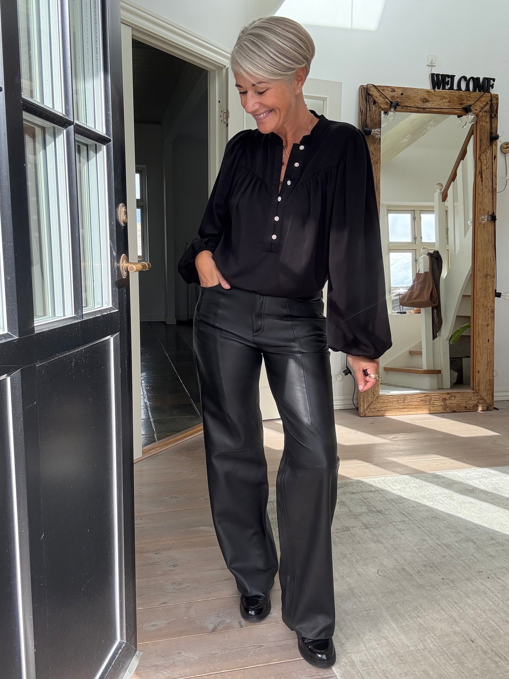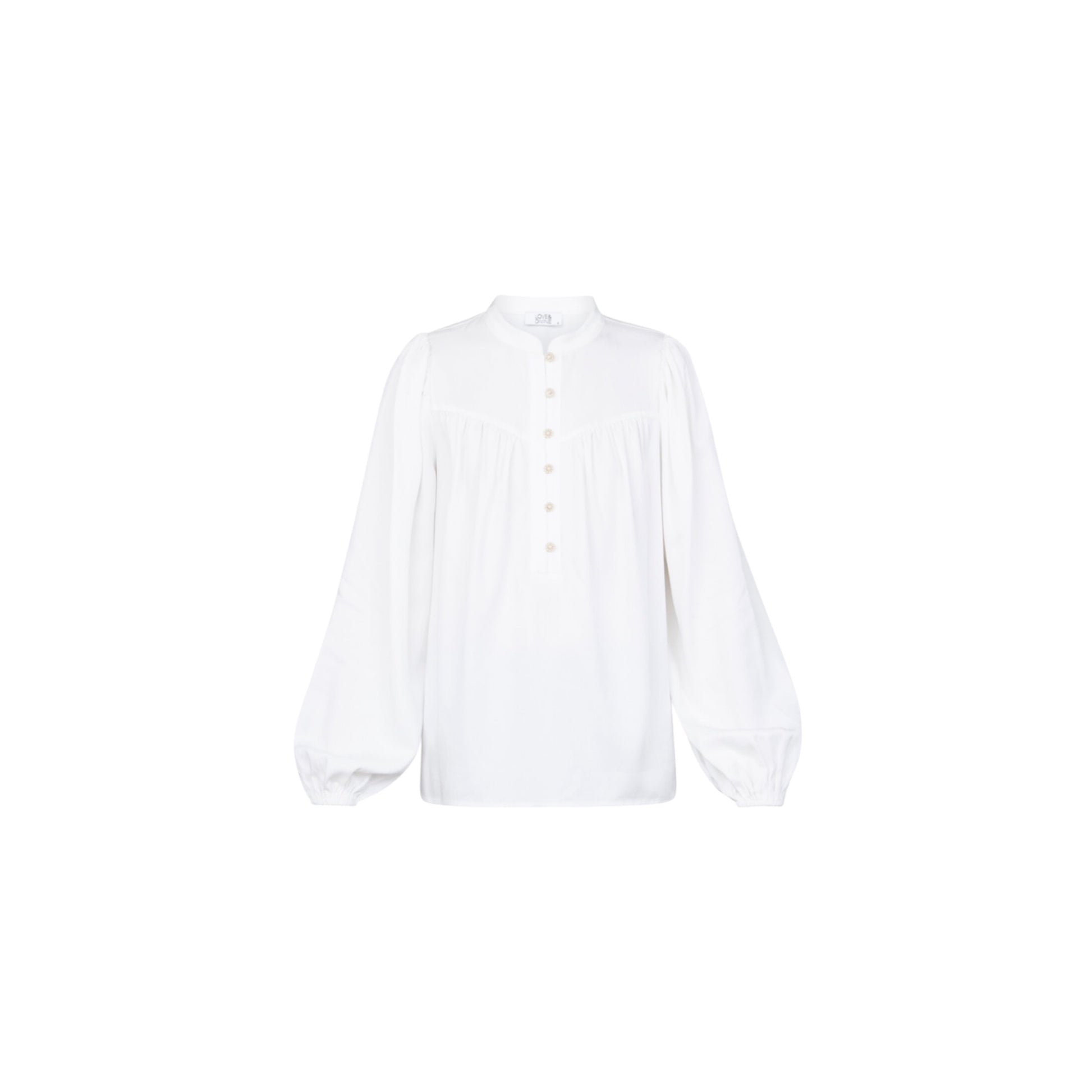 Love791-3 er en ensfarvet bluse med en løs og luftig pasform. Blusen har lange pufærmer med elastik forneden og en knaplukning med perleknapper ved halsudskæringen.