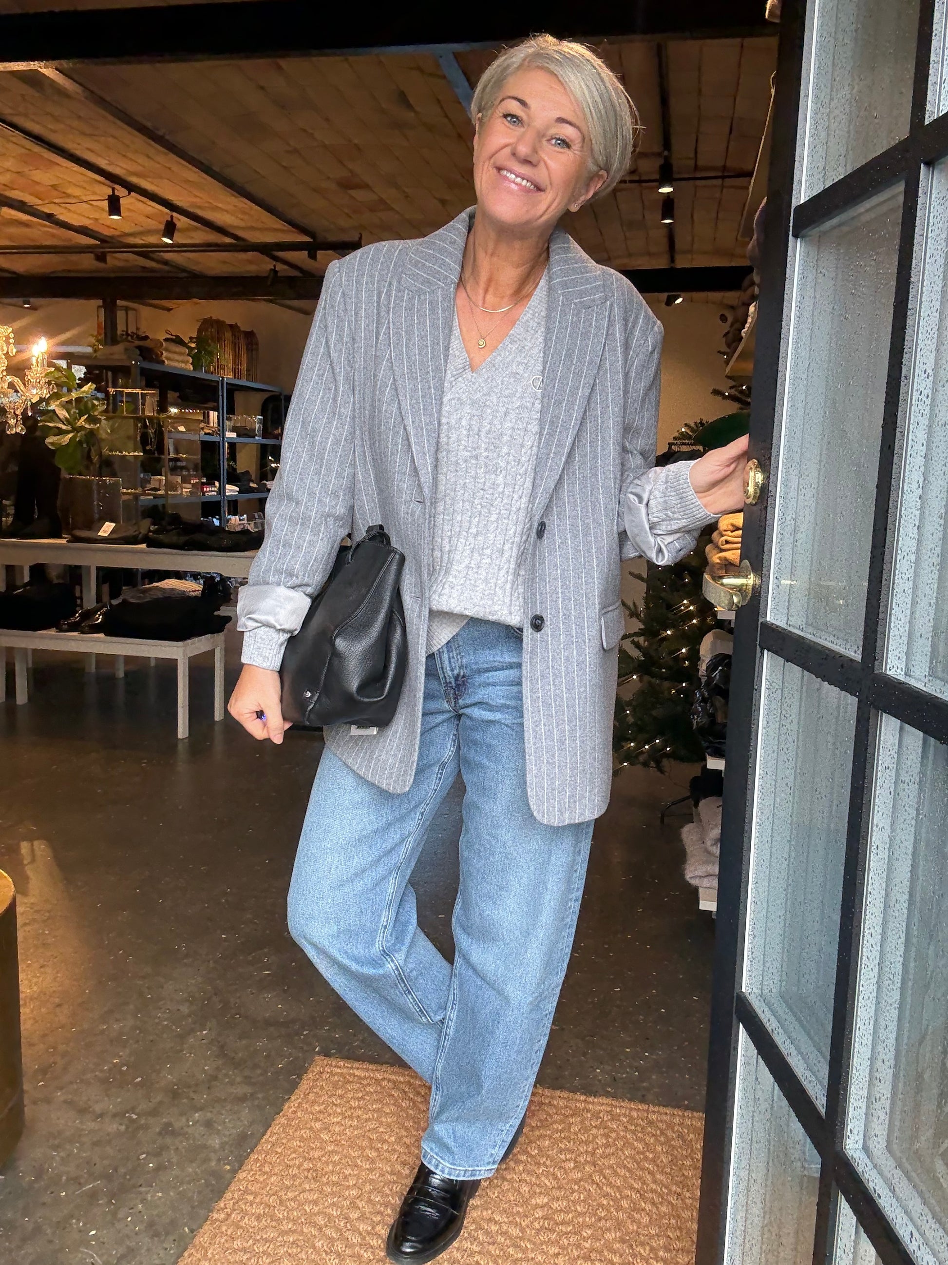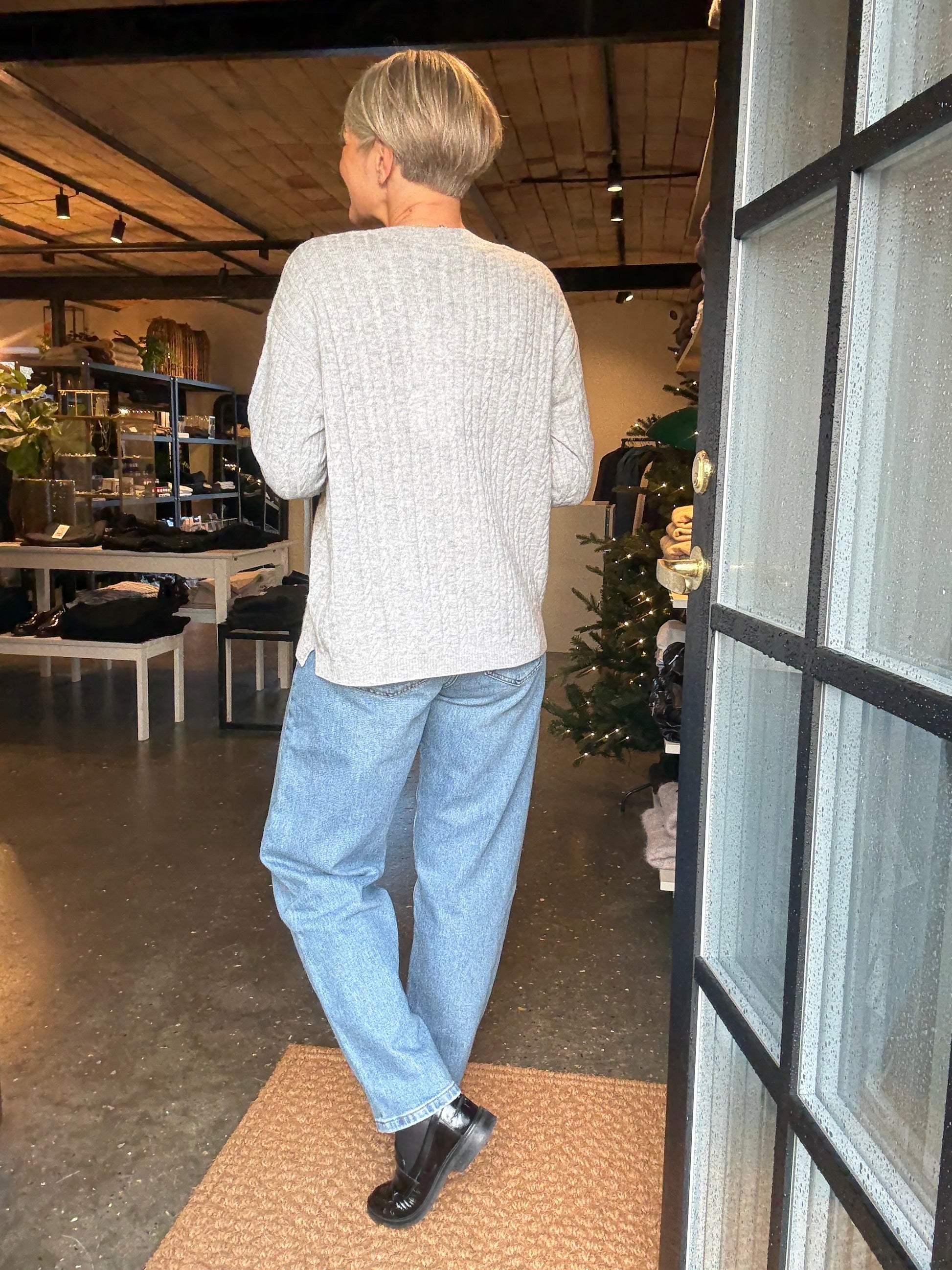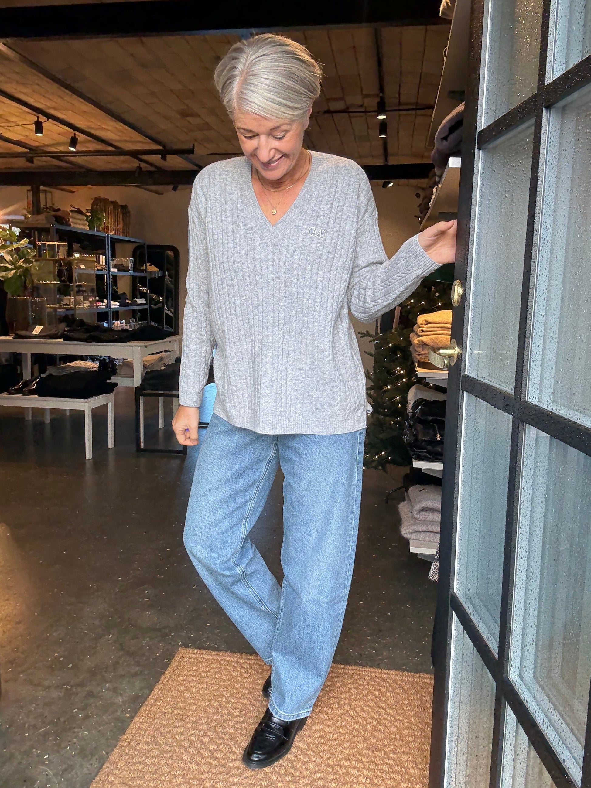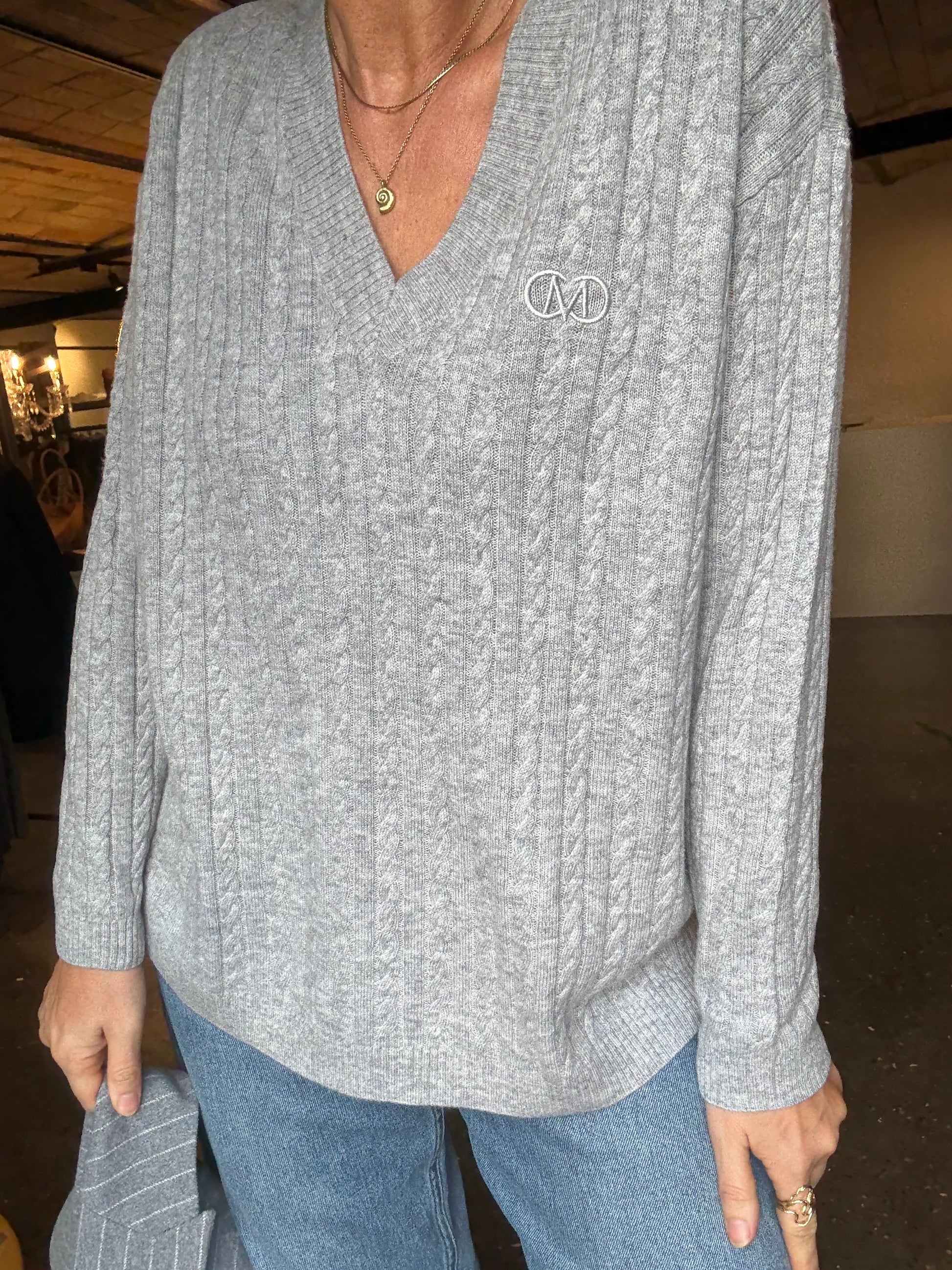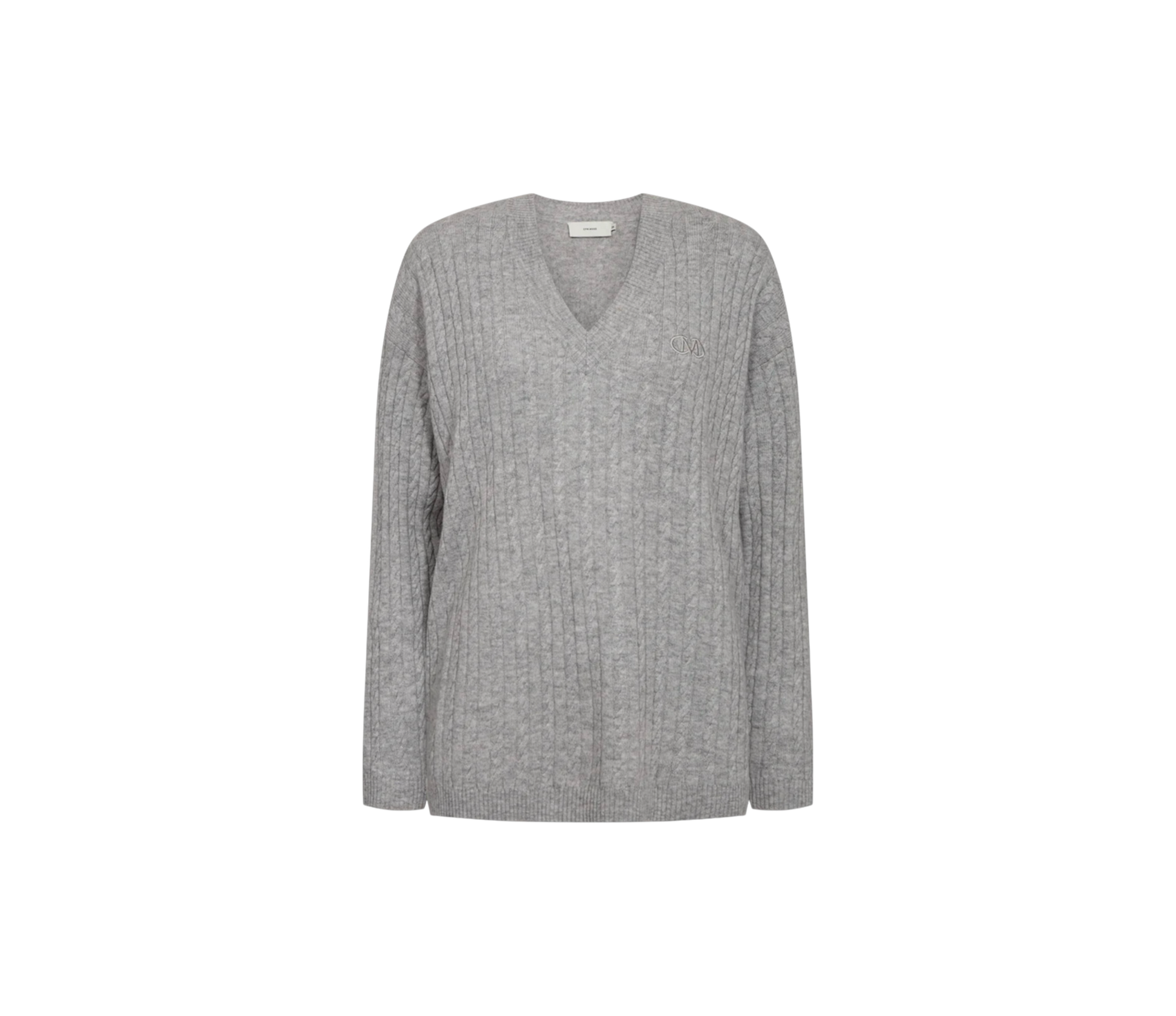 En lang pullover i en finstrikket kvalitet med en kabelstrikket struktur, V-udskæring, en broderet logodetalje samt lange ærmer med dobbelt ribkant og drop shoulders, der fremhæver den oversize pasform