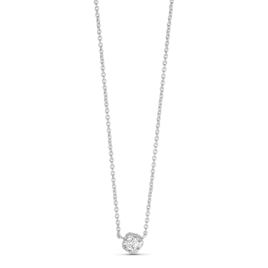 Den klassiske kæde er besmykket med en klar zirkon. Zirkonen sidder i et banket og teksturrigt greb, hvilket giver en smuk kontrast til den skinnende zirkon og den feminine kæde.