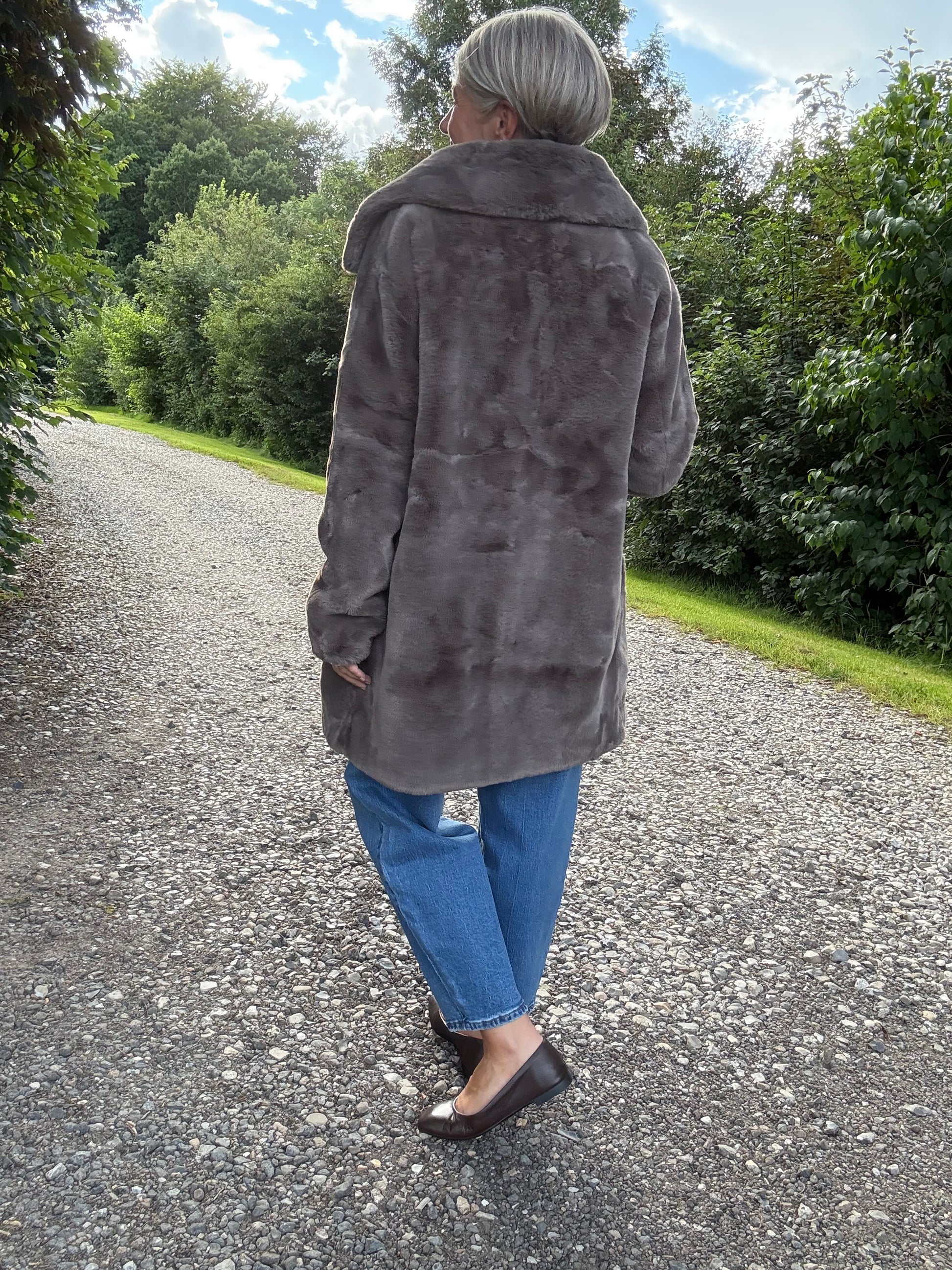 Trendy jakke i fake pels, designet med en klassisk krave og sidelommer. Jakken lukkes med skjulte knapper ned foran. Uanset om du ønsker at tilføje et råt touch til dine outfits eller fremhæve en feminin stil, er denne jakke det ideelle valg.