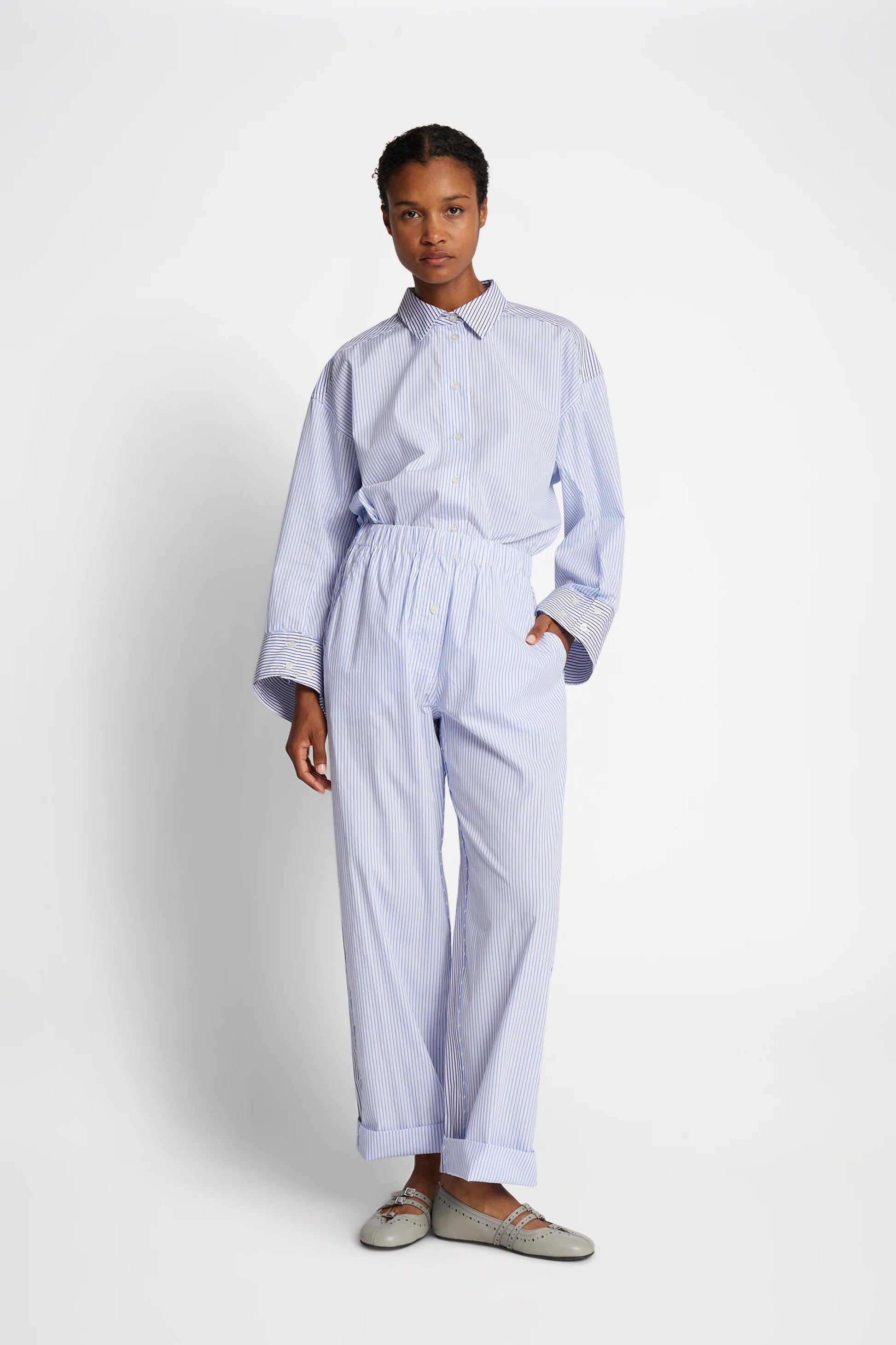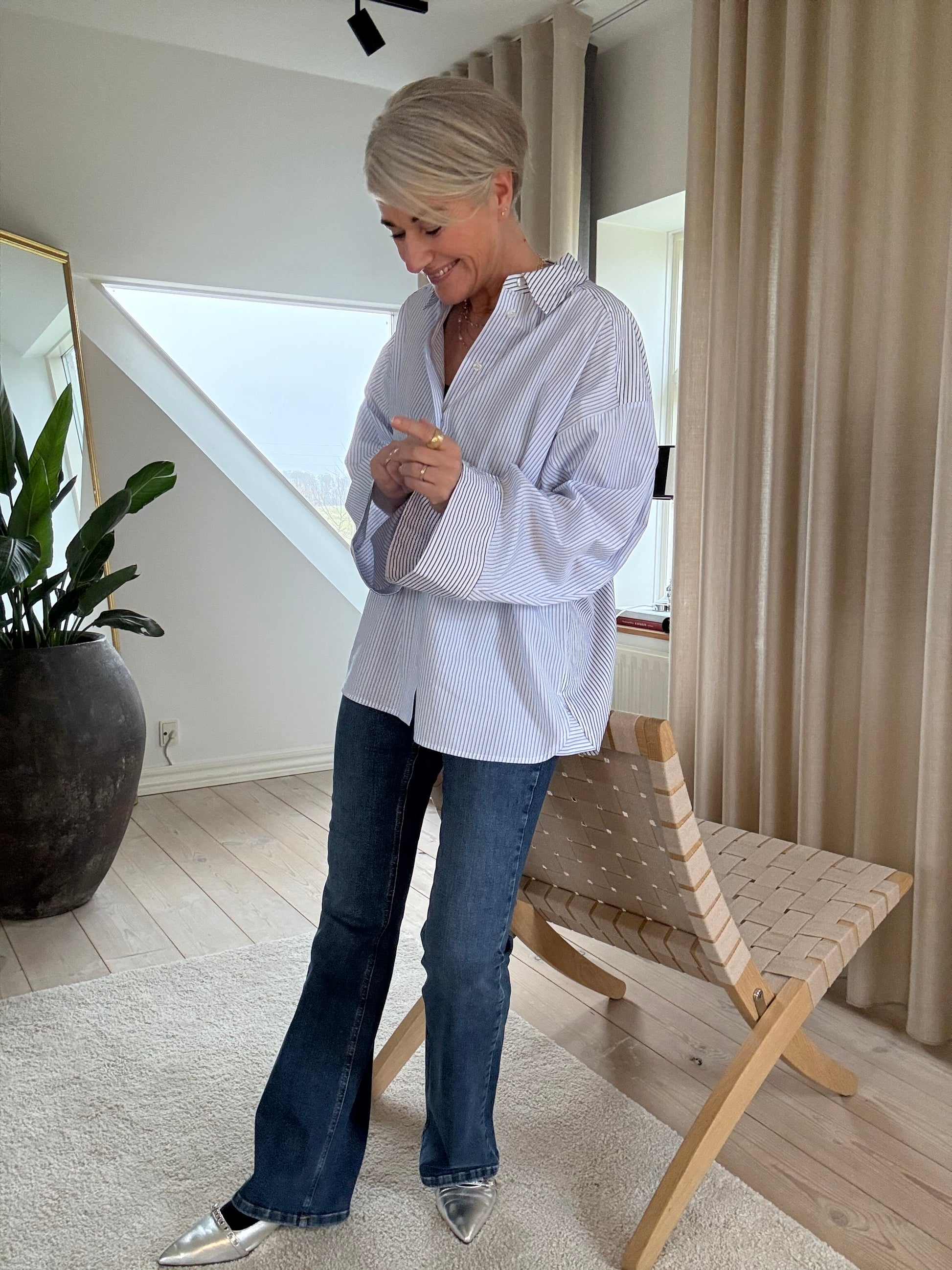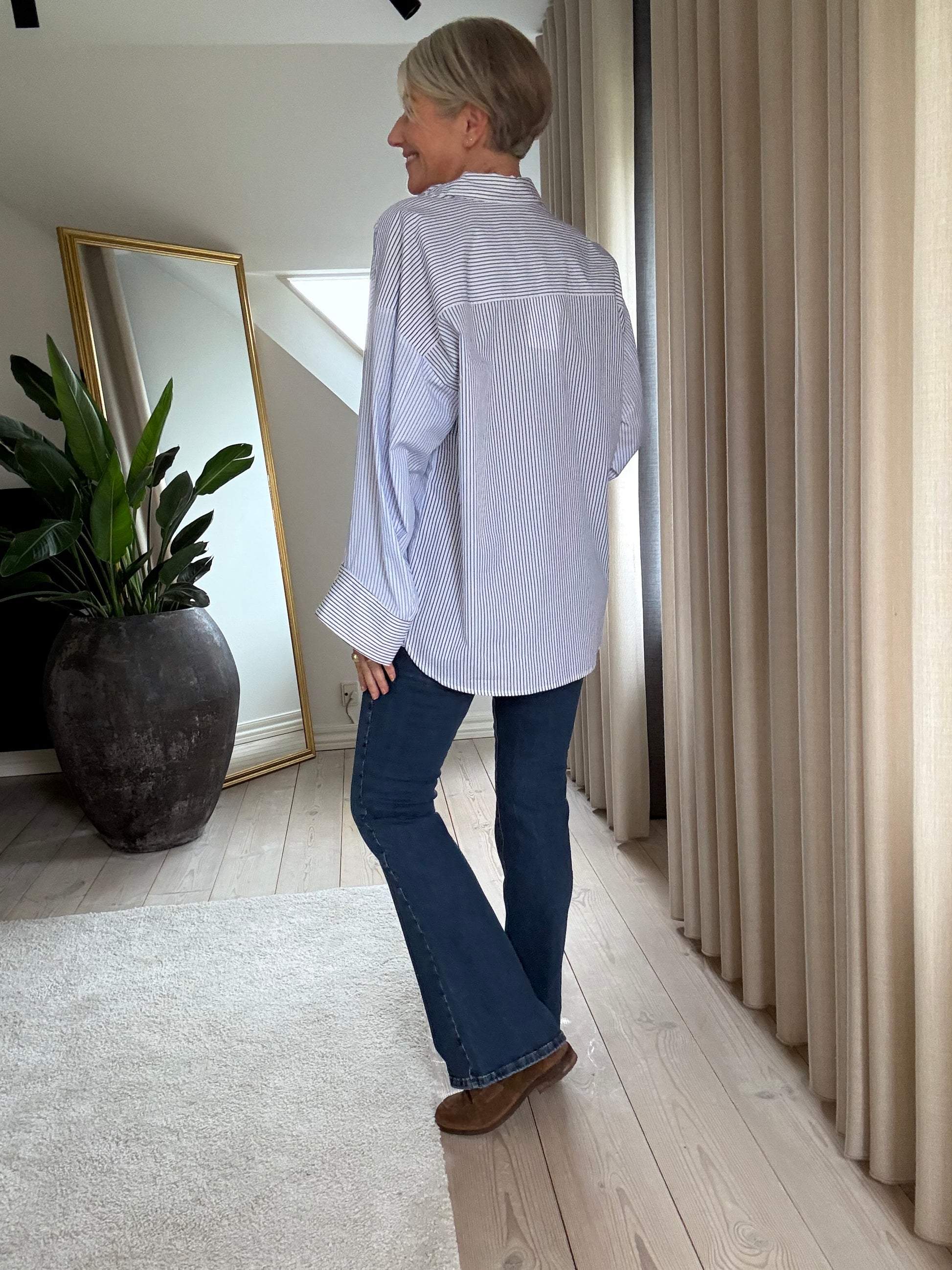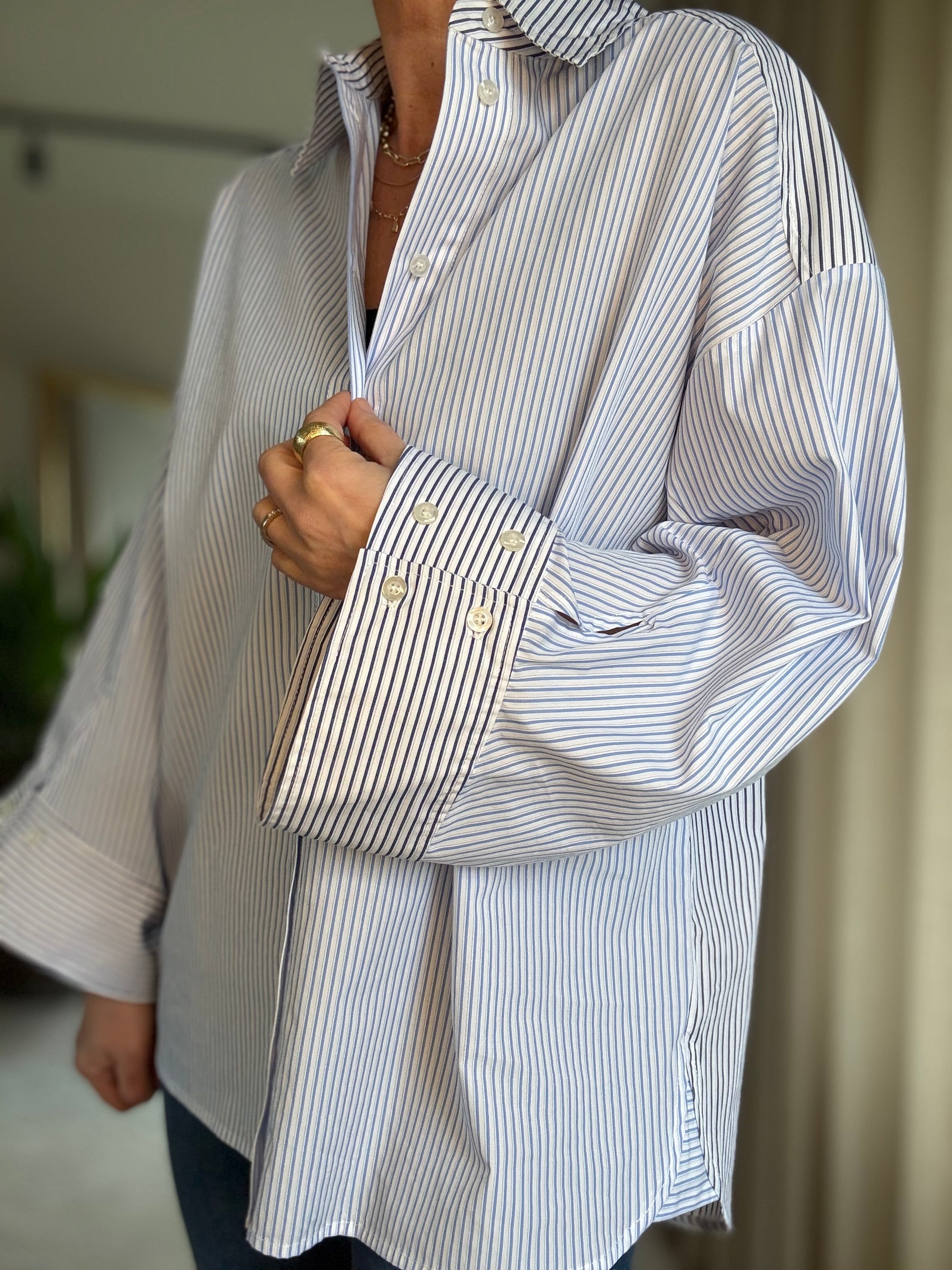 Skjorte med en elegant kombination af mørke og lyse striber og smukke brede manchetter. Skjorten er designet til at være oversize.