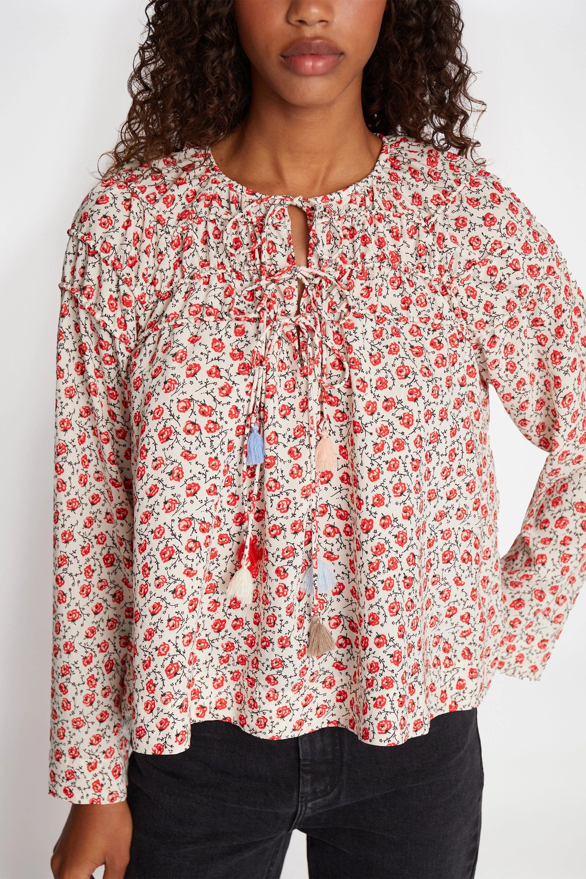 Bluse med et fint blomster print, og smukke bindebånds detaljer ved brystet. Hvert bindebånd afsluttes elegant med små farvede kvaster. Blusen er designet med lange ærmer og har et almindeligt fit.