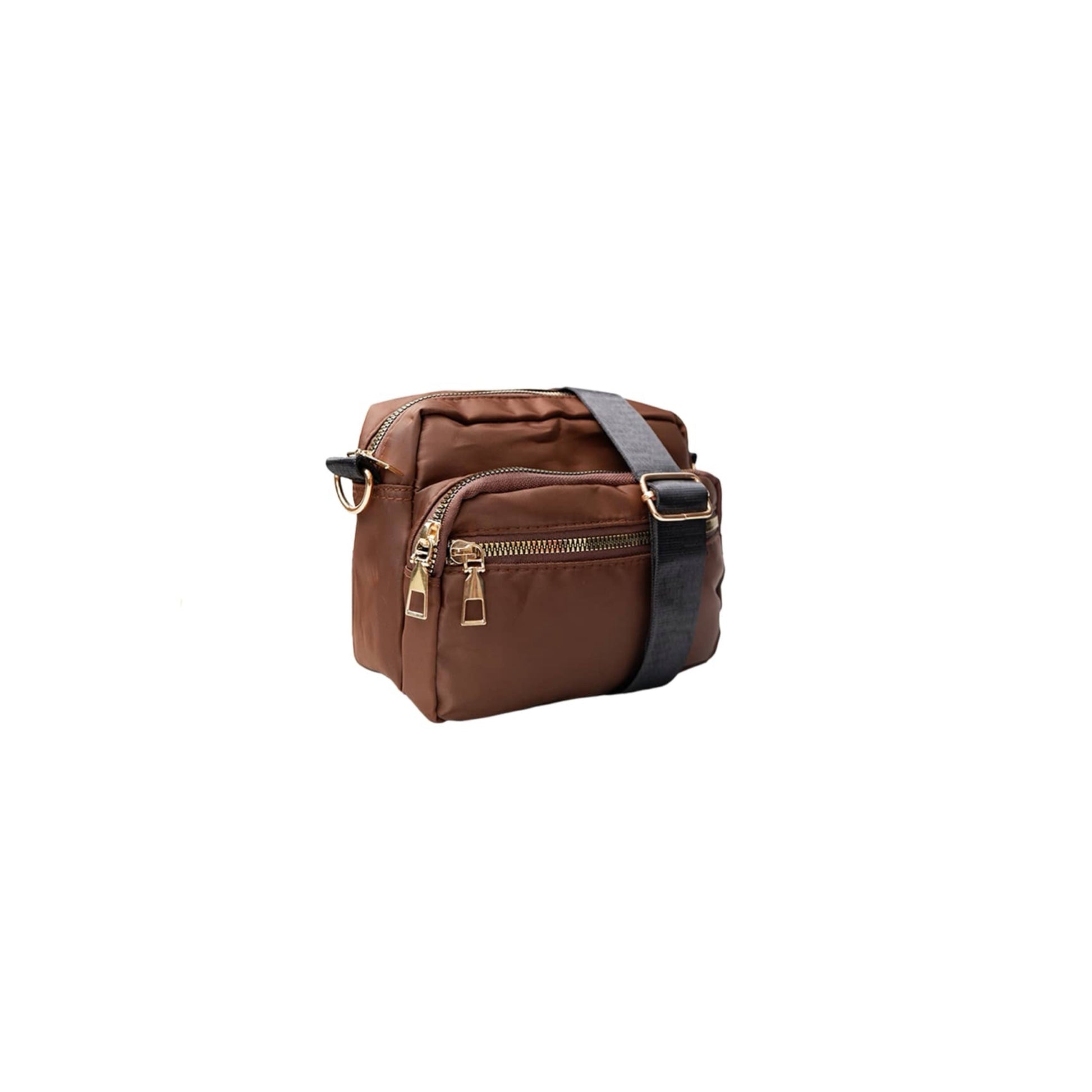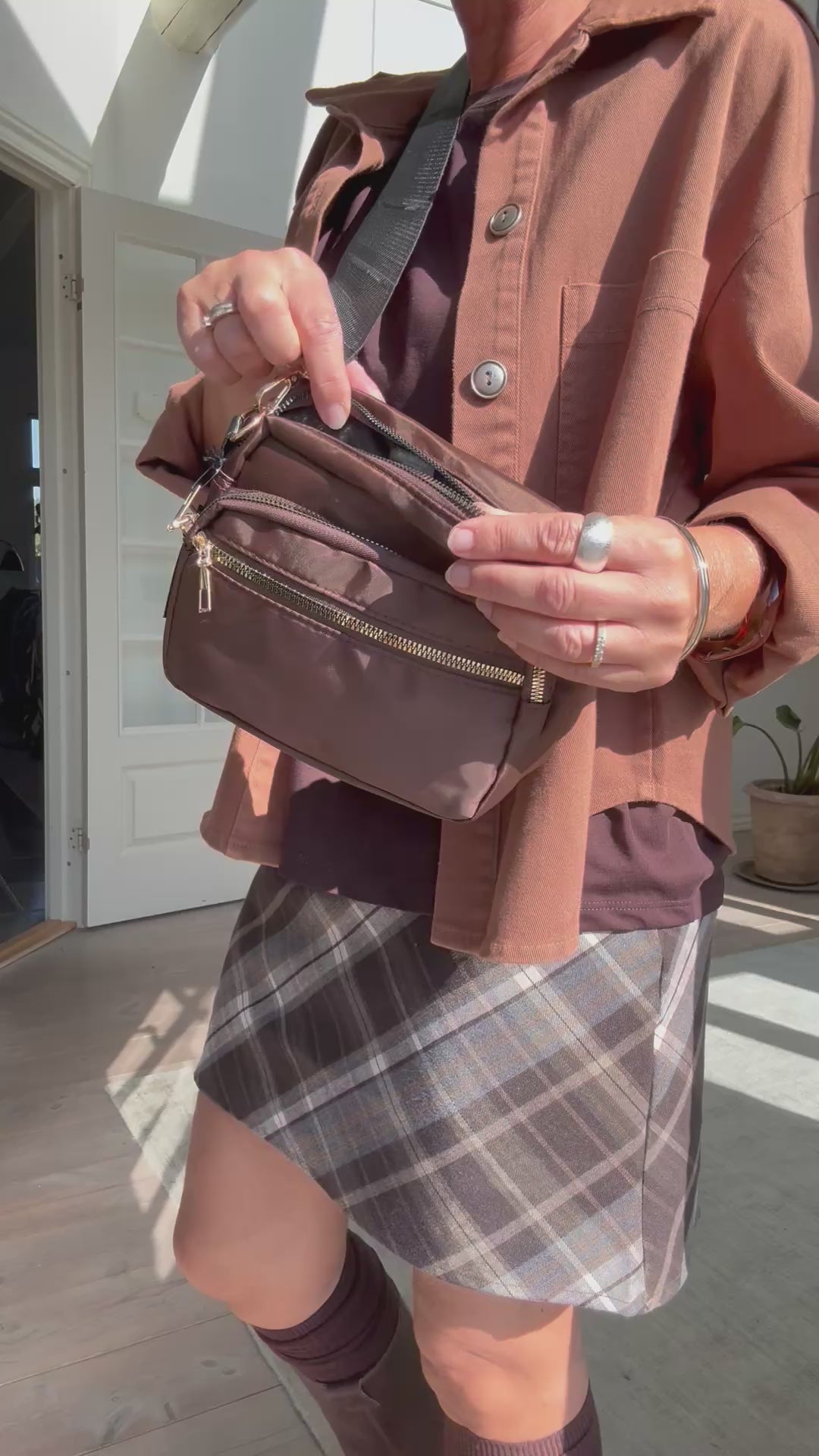 Lille nylon taske med mange rum. To rum foran og et større rum. Længden på remmen kan justeres.