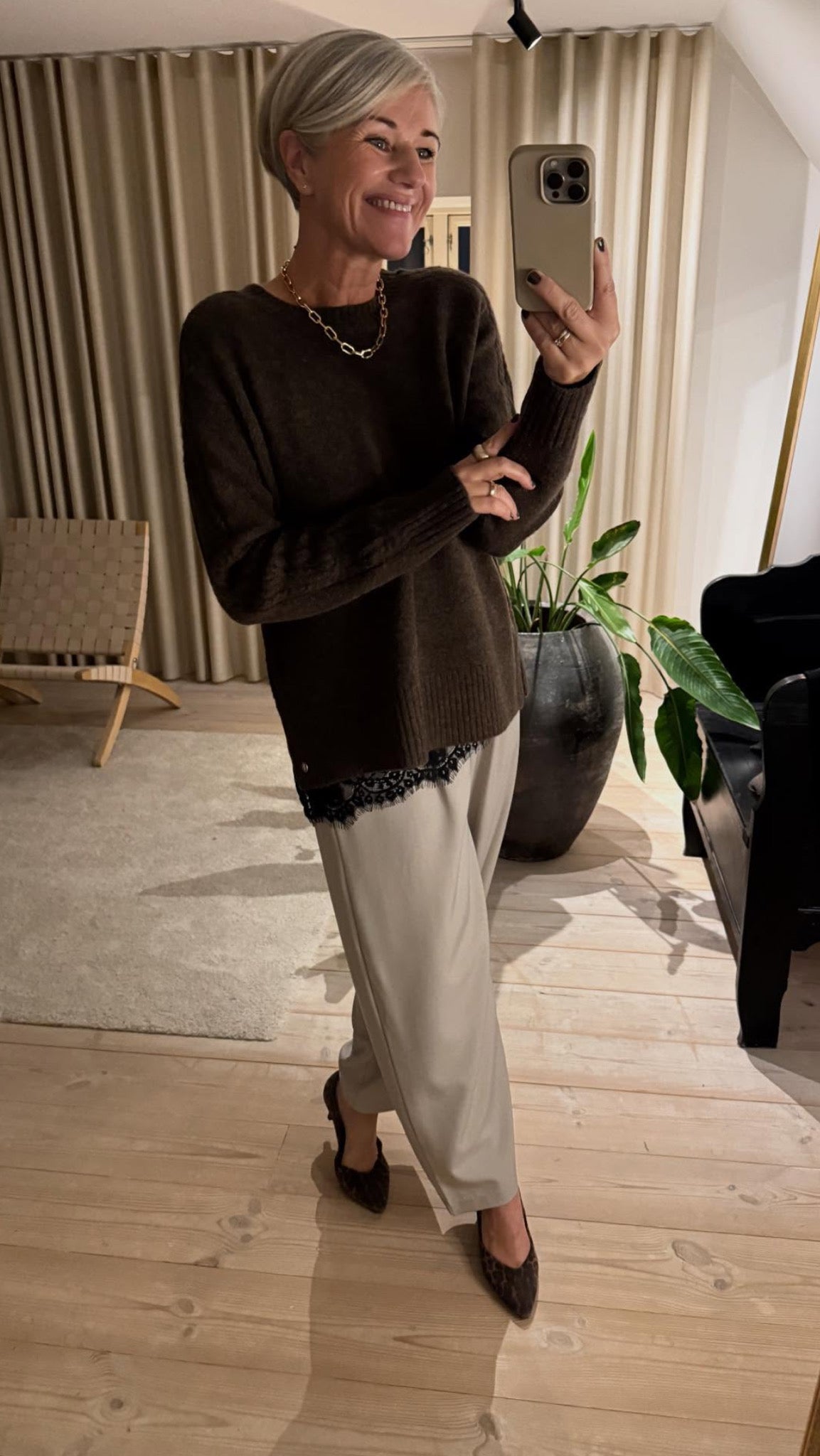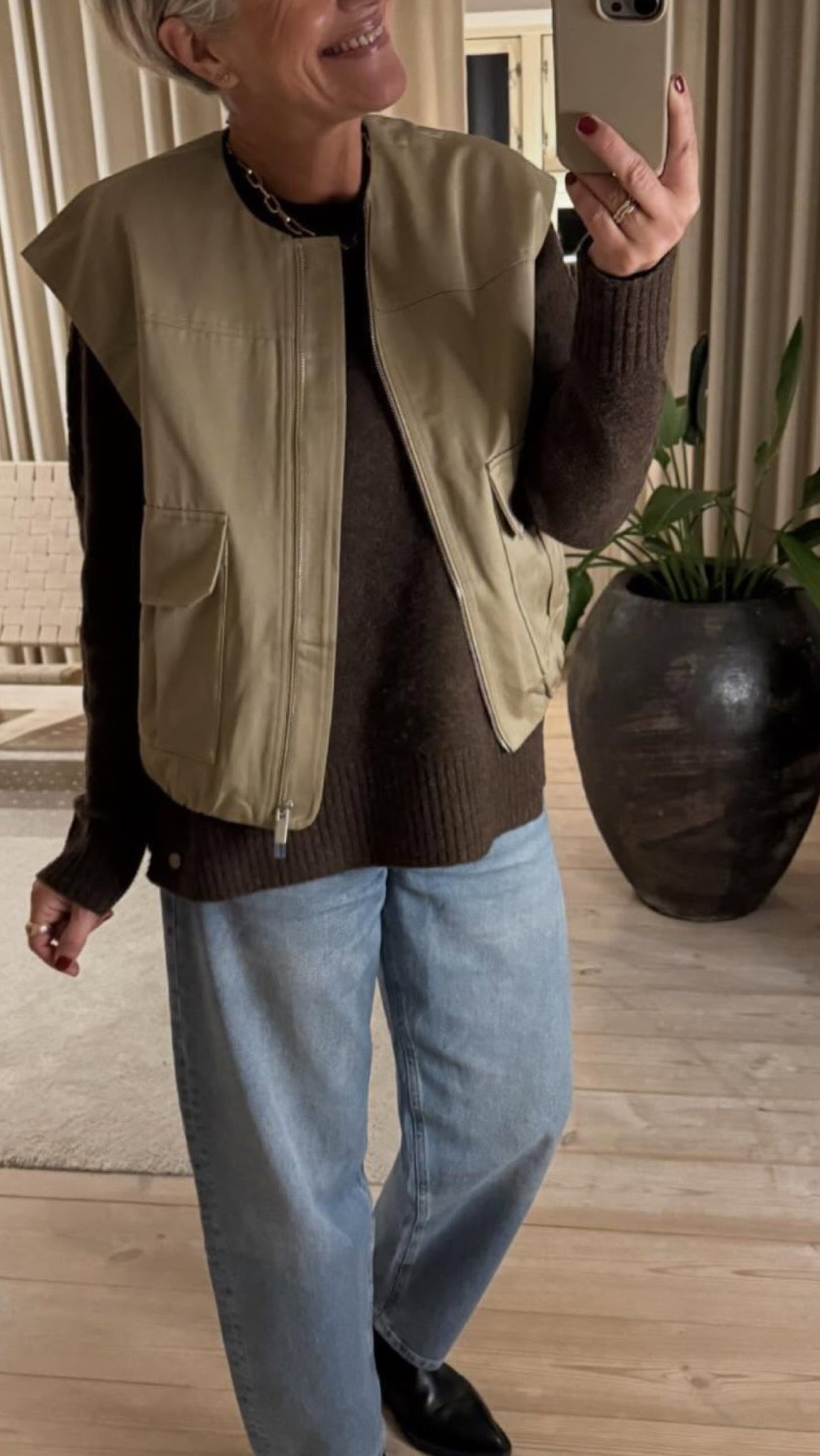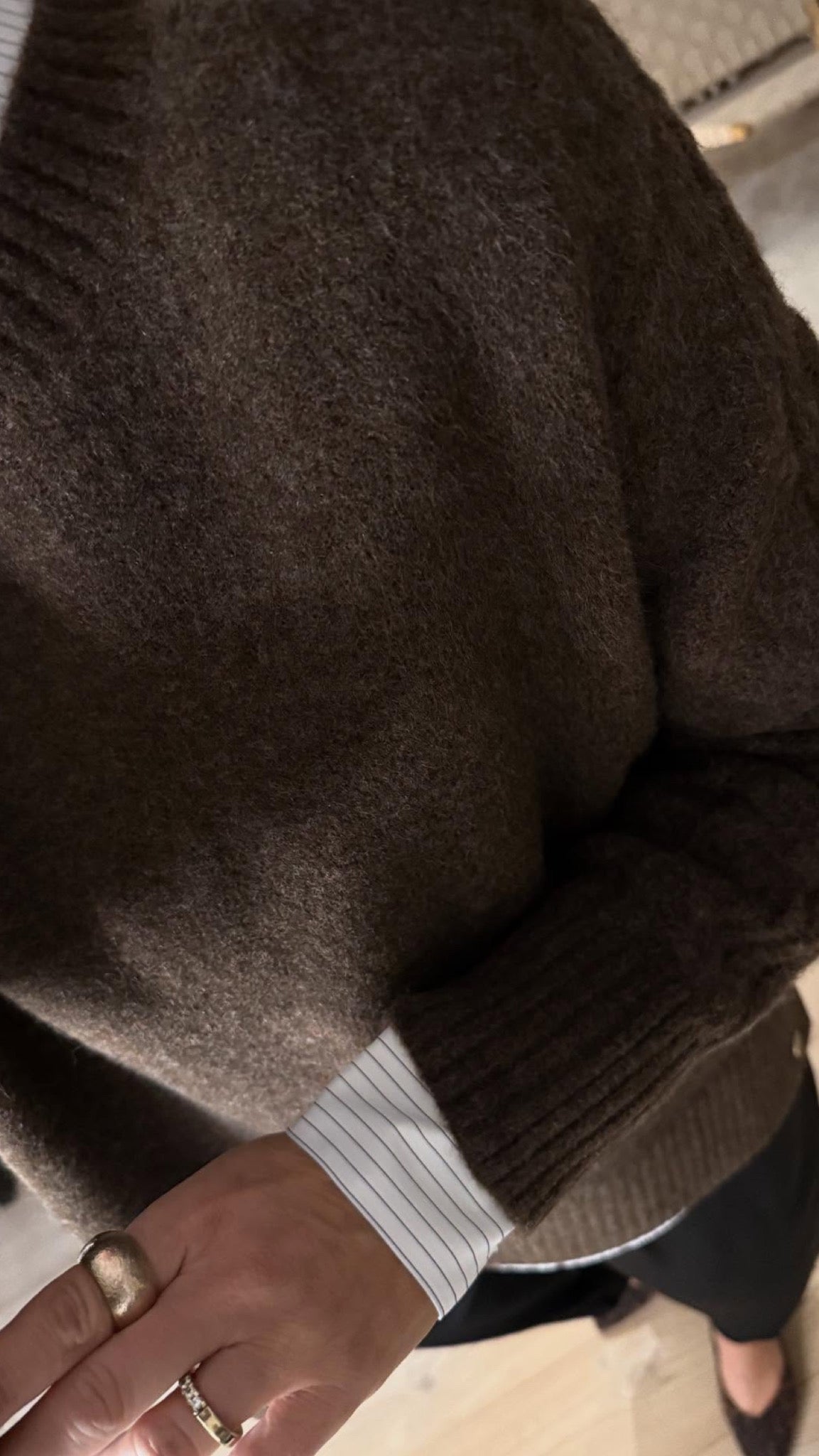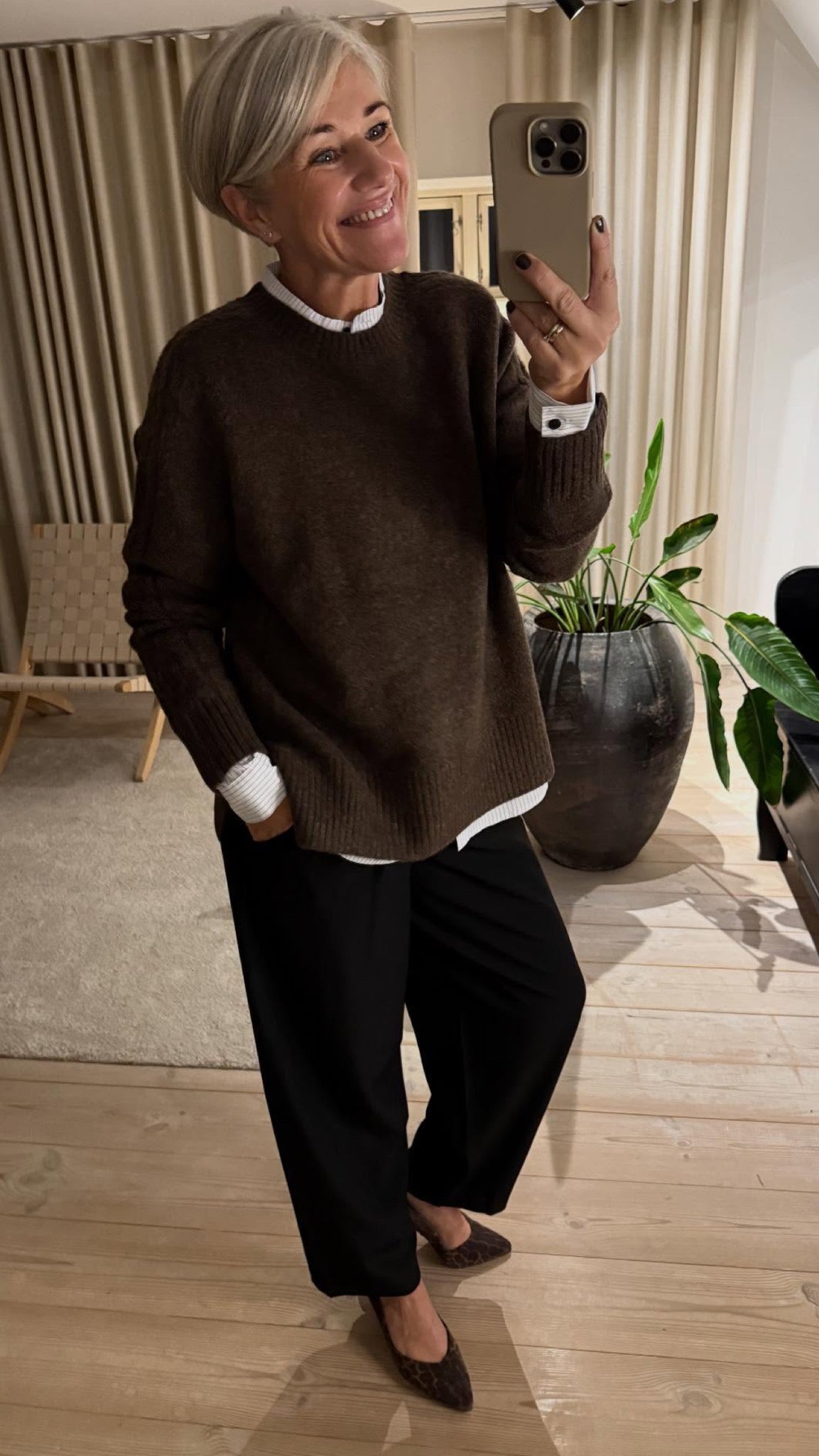 Strikken har rund hals og lange ærmer og ribafslutninger ved hals, ærmer og i bunden samt en slids i hver side.