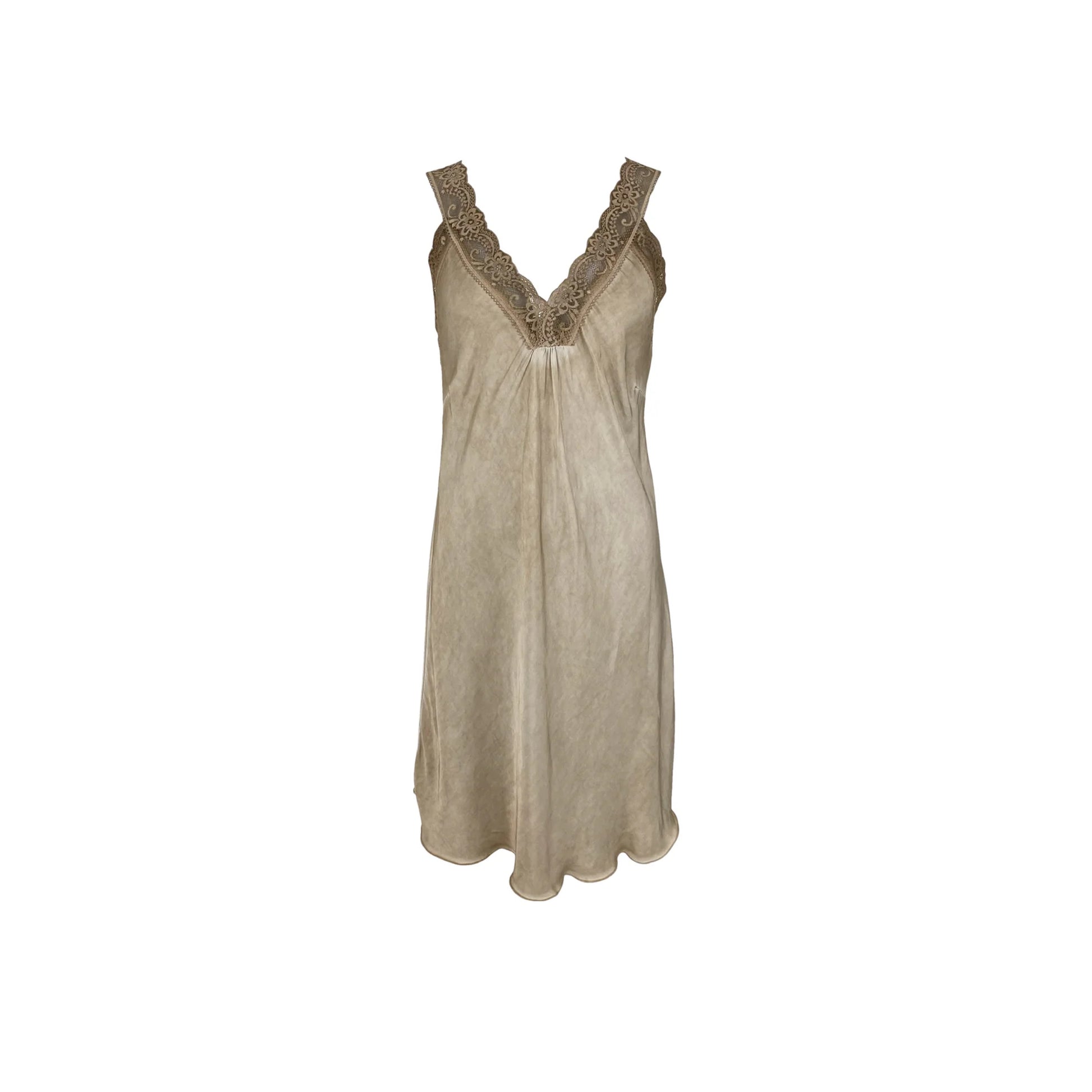 Slipkjole i viskose med blonder ved hals og arme. Kjolen er vintage farvet, som gradvist falmer over tid. Farverne vil fremstå lysere, især efter første vask.