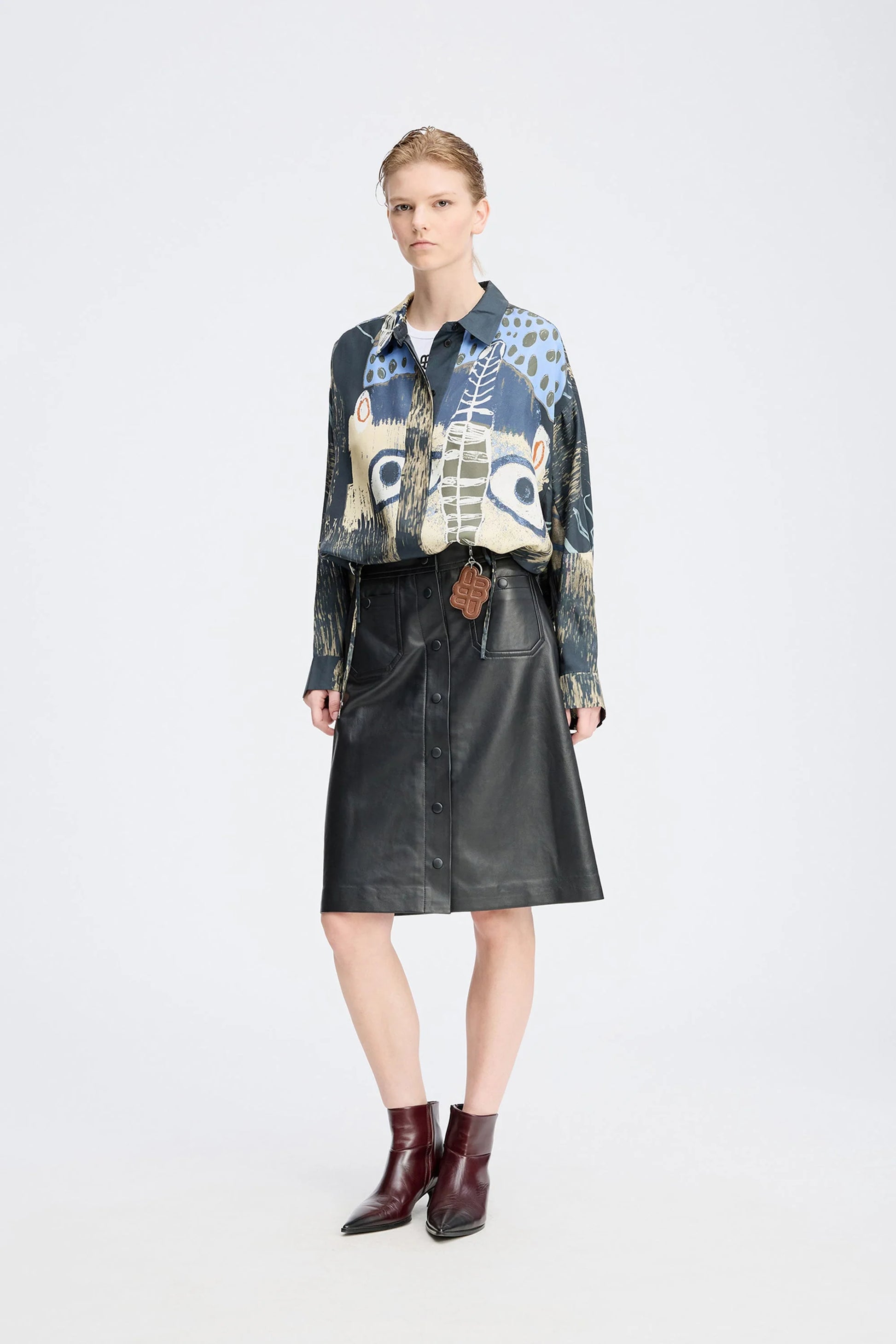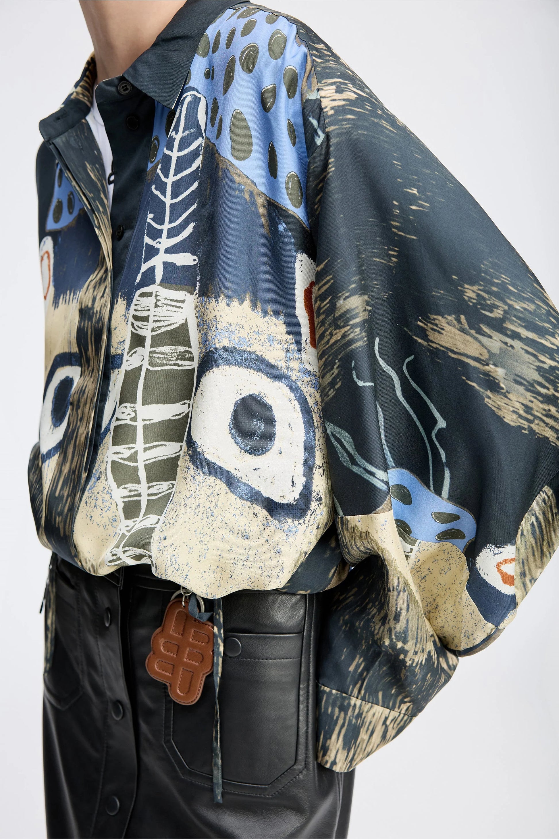 Skjorte med et smukt kunstprint og flotte bindebånds detaljer nederst samt på ærmerne. Skjorten er designet med løse ærmer og kan styles både åben og lukket. Loose fit.