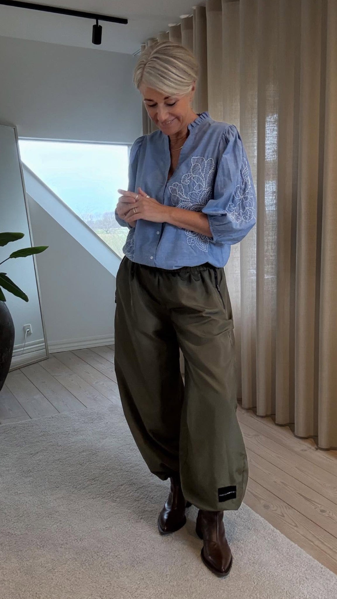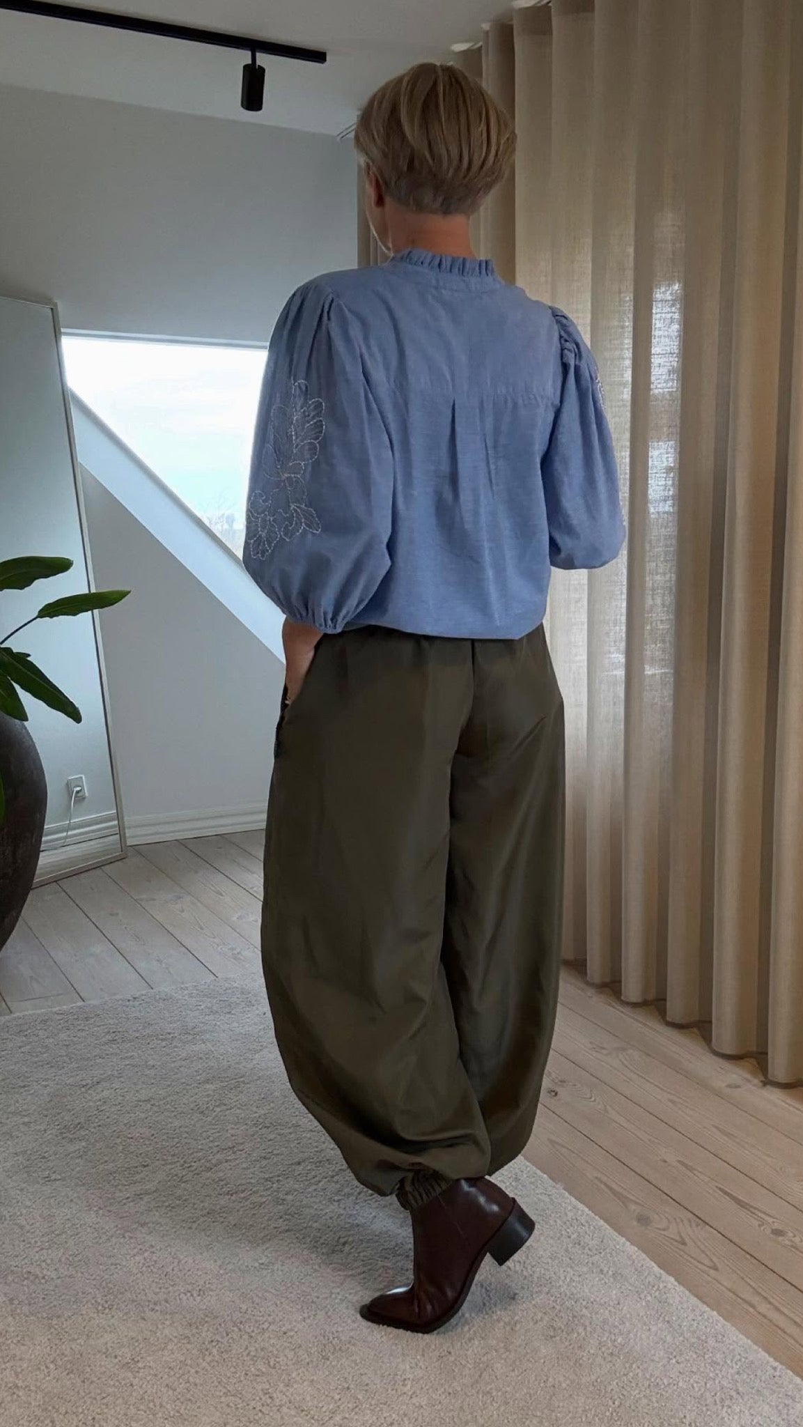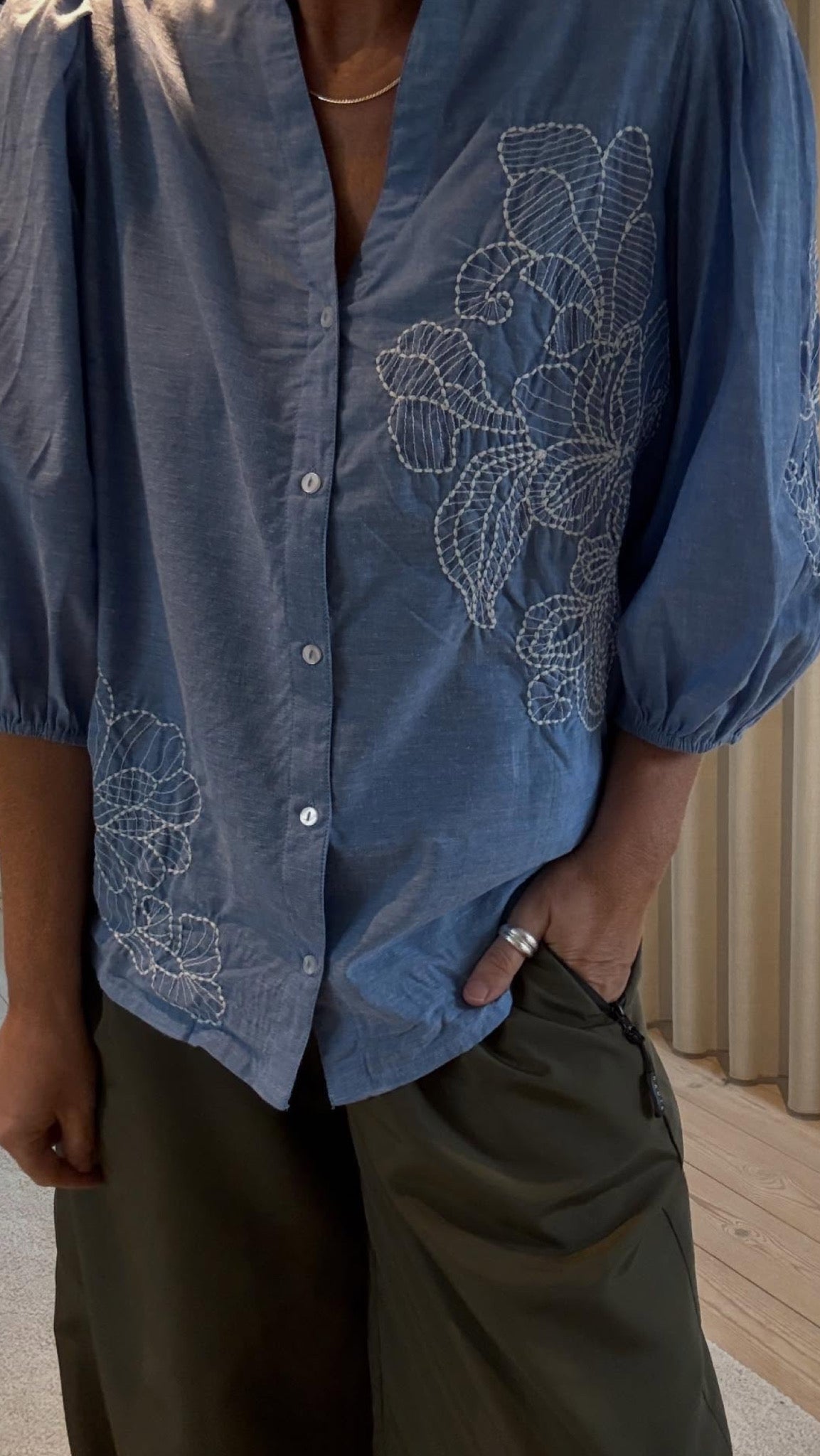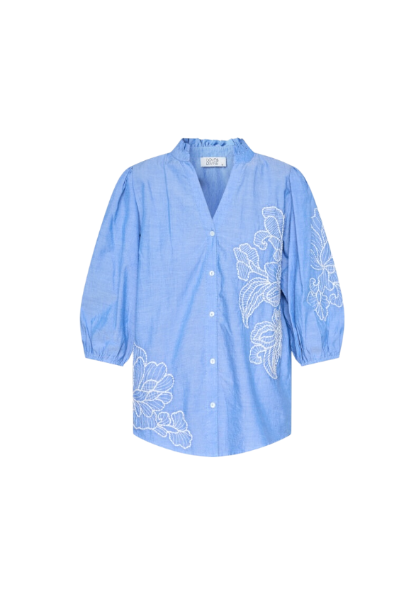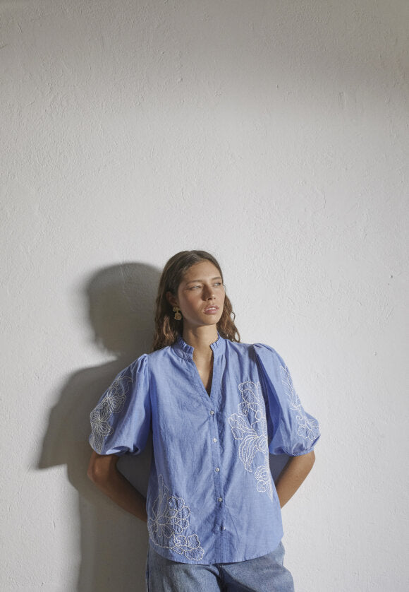 Love1448 er en overdel med knaplukning. den har en krave og er broderet med et mønster foran og på pufærmerne.