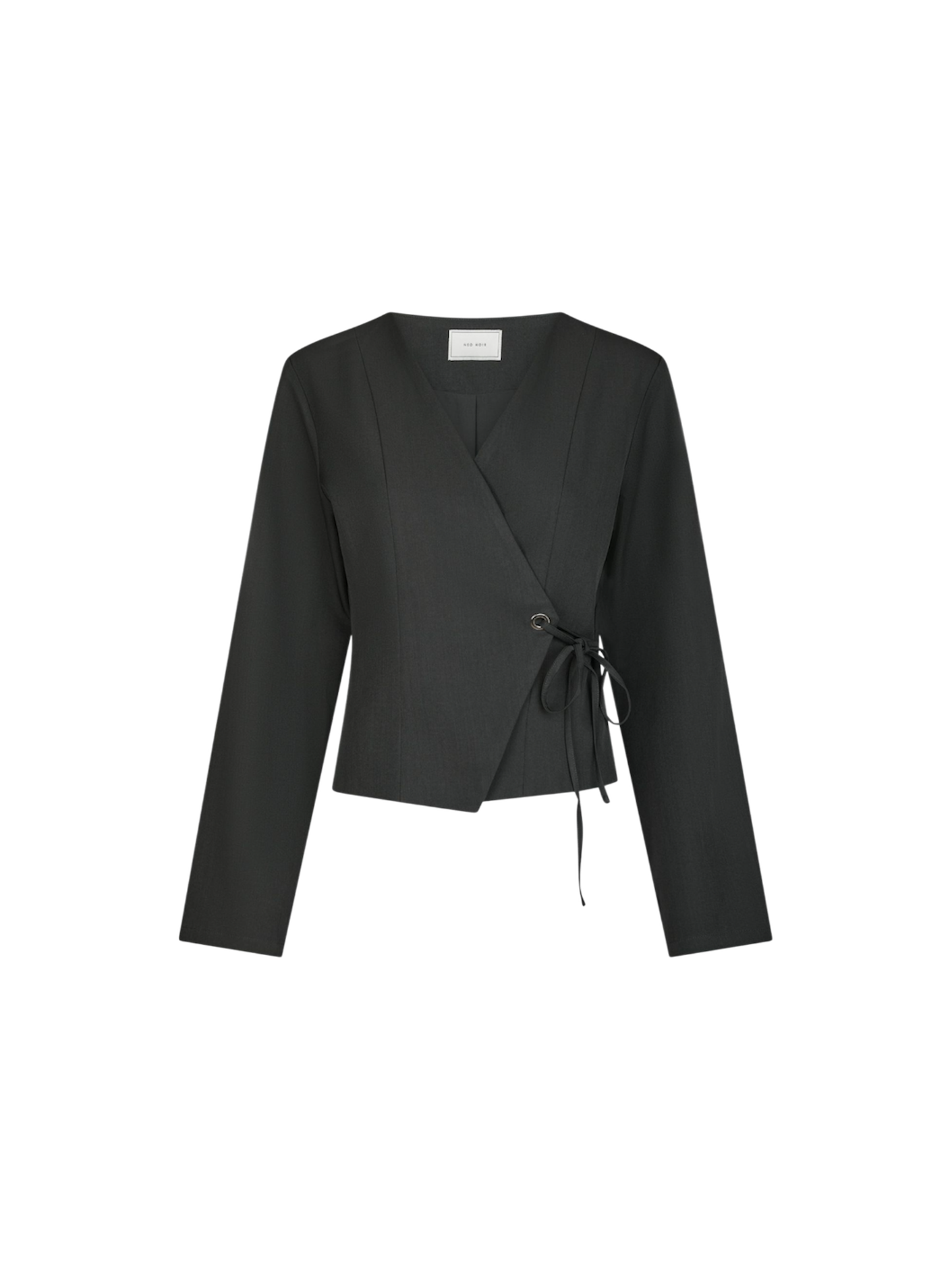 Fin slå-om bluse med en cool metal ring ved fronten. Blusen har lange ærmer.