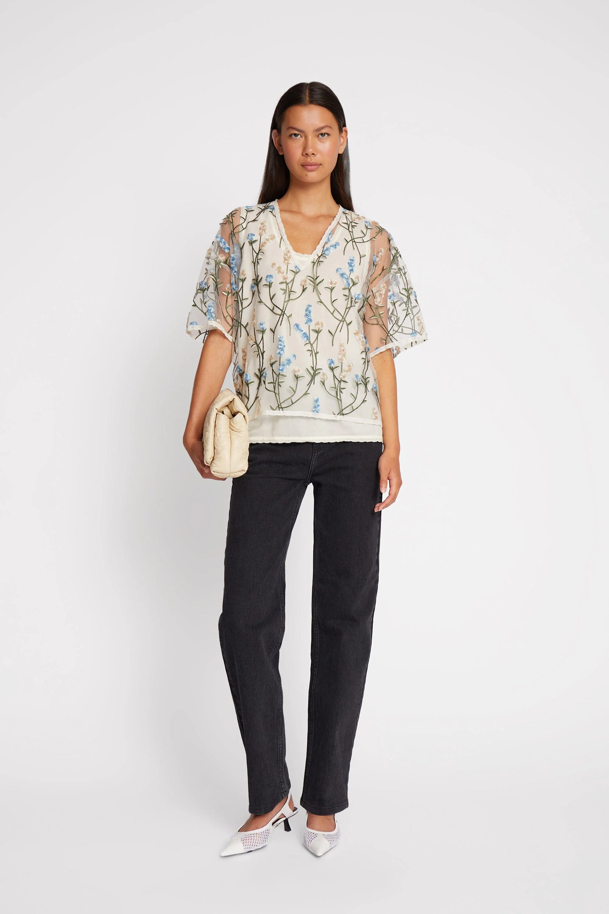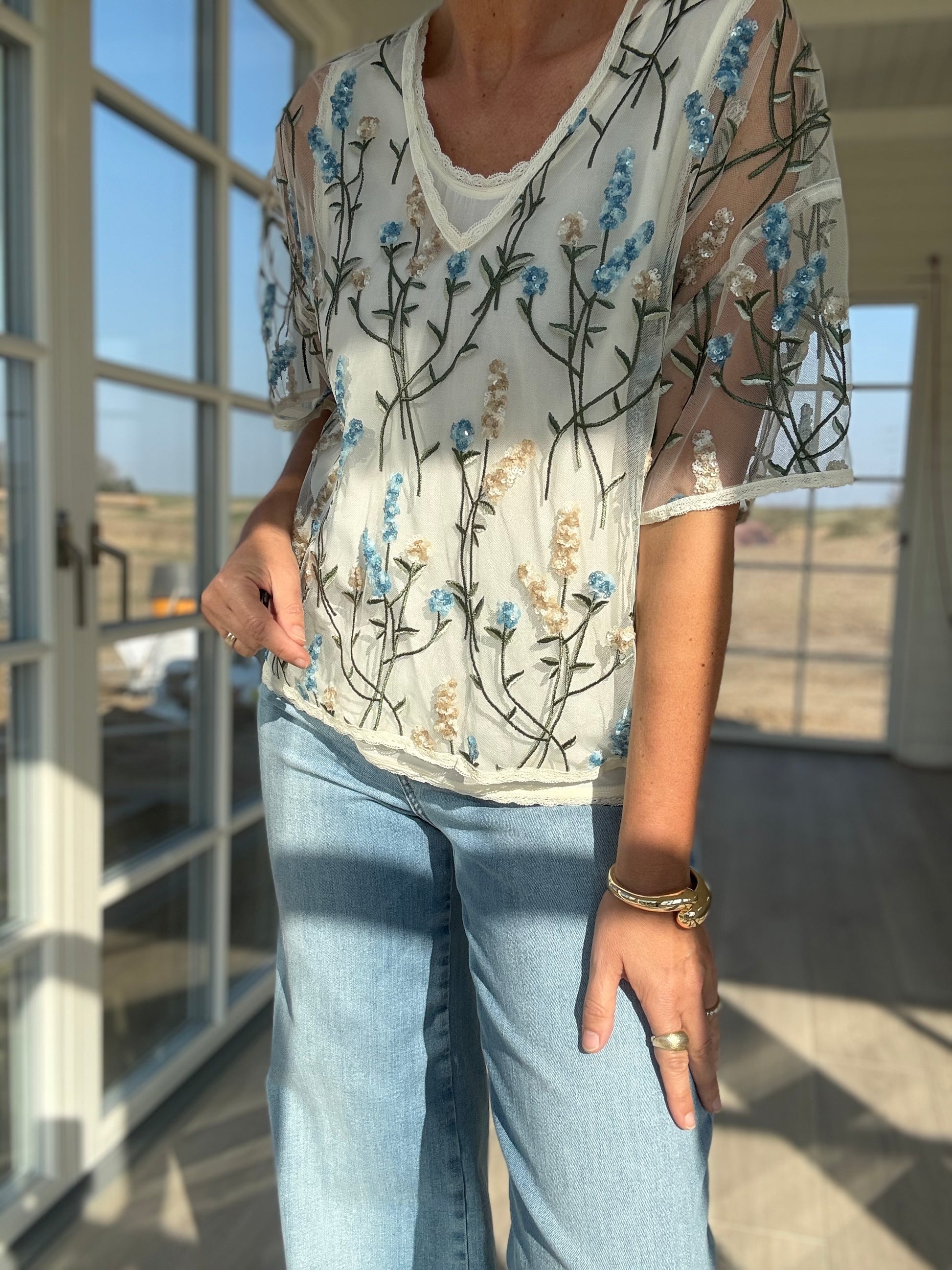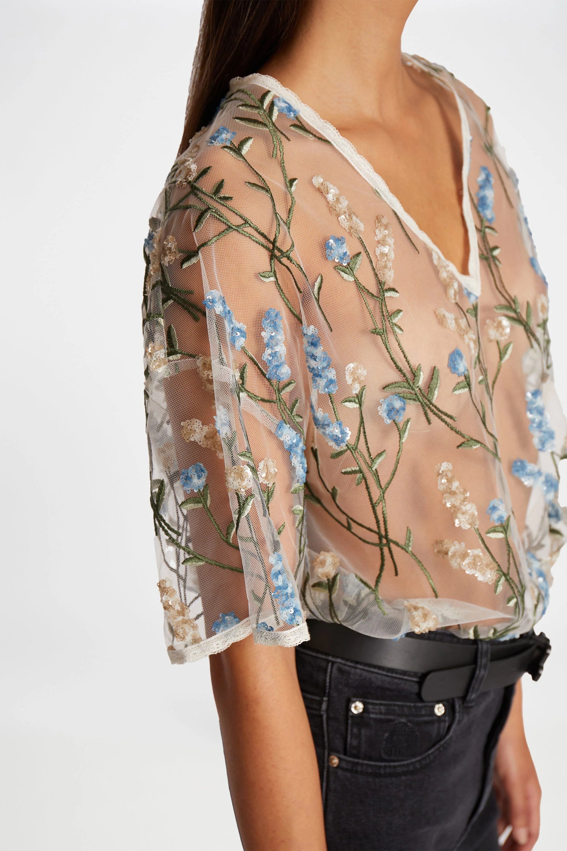 En smuk bluse designet med en elegant blanding af palietter og broderi, der skaber et smukt blomstermønster. Blusen er designet til at være gennemsigtig med en elegant slip-top under. Blusen har en rund halsudskæring og en løs pasform.