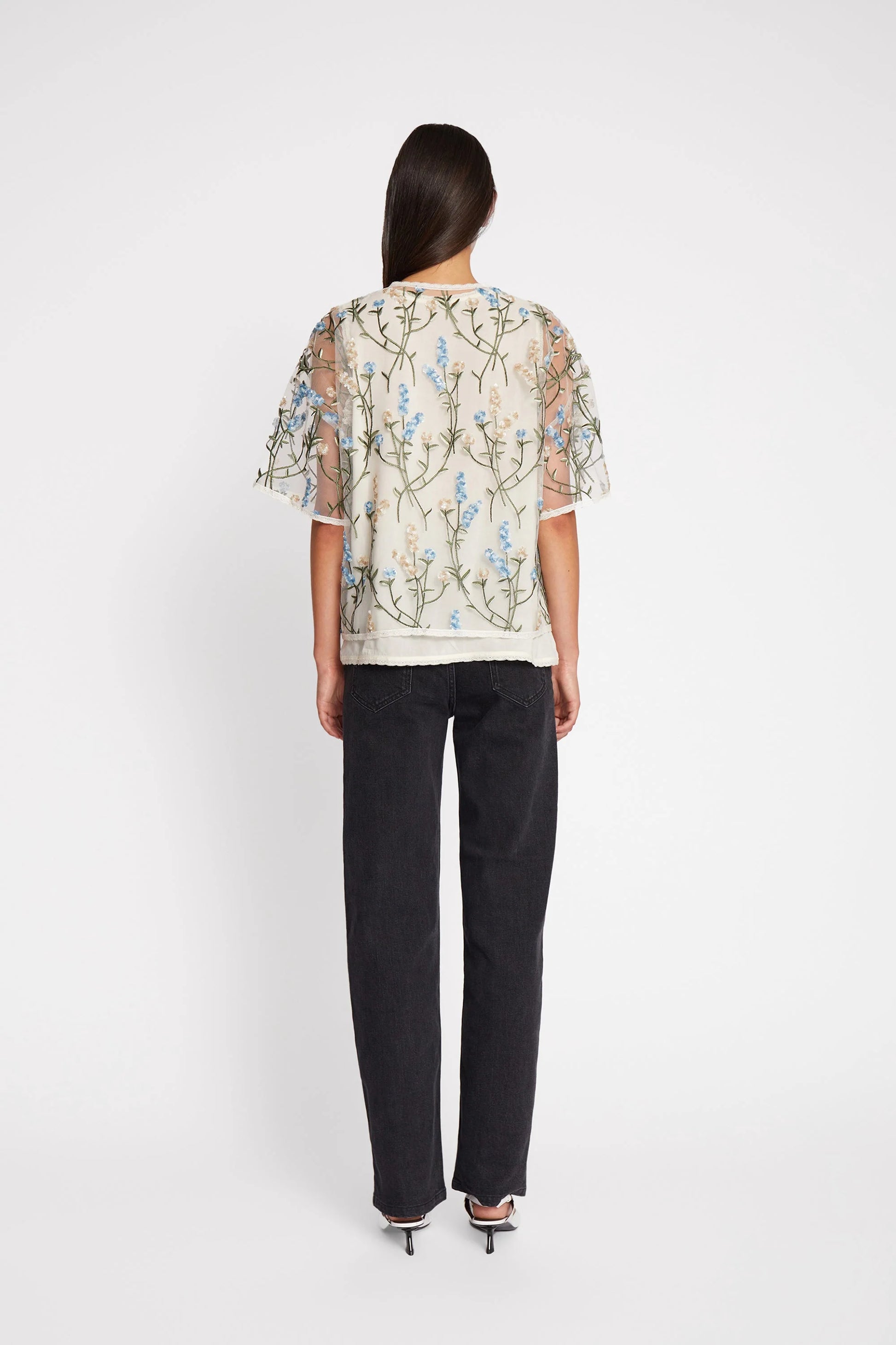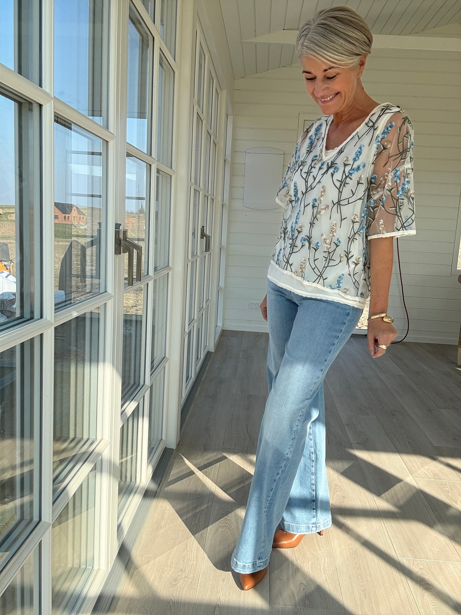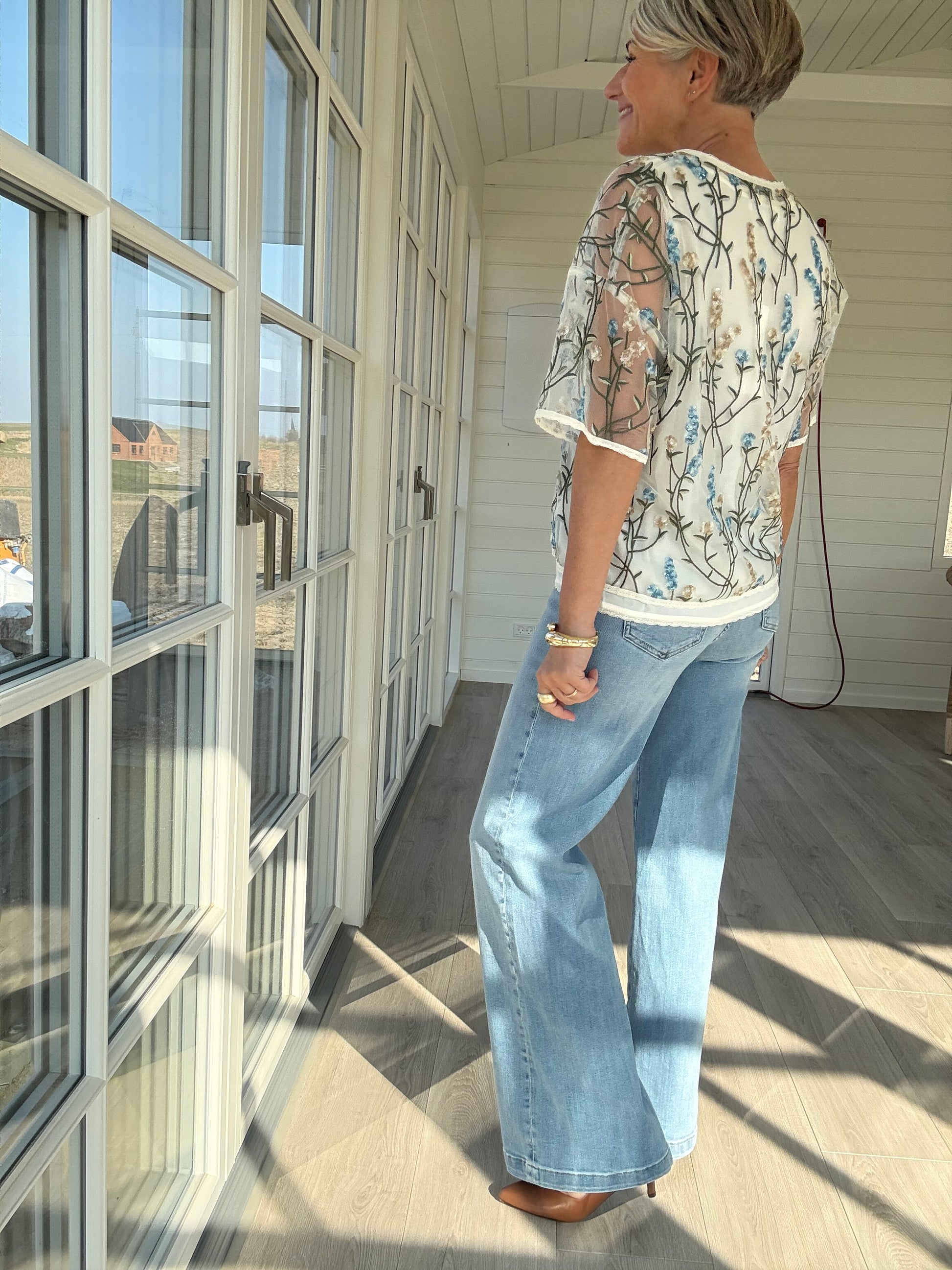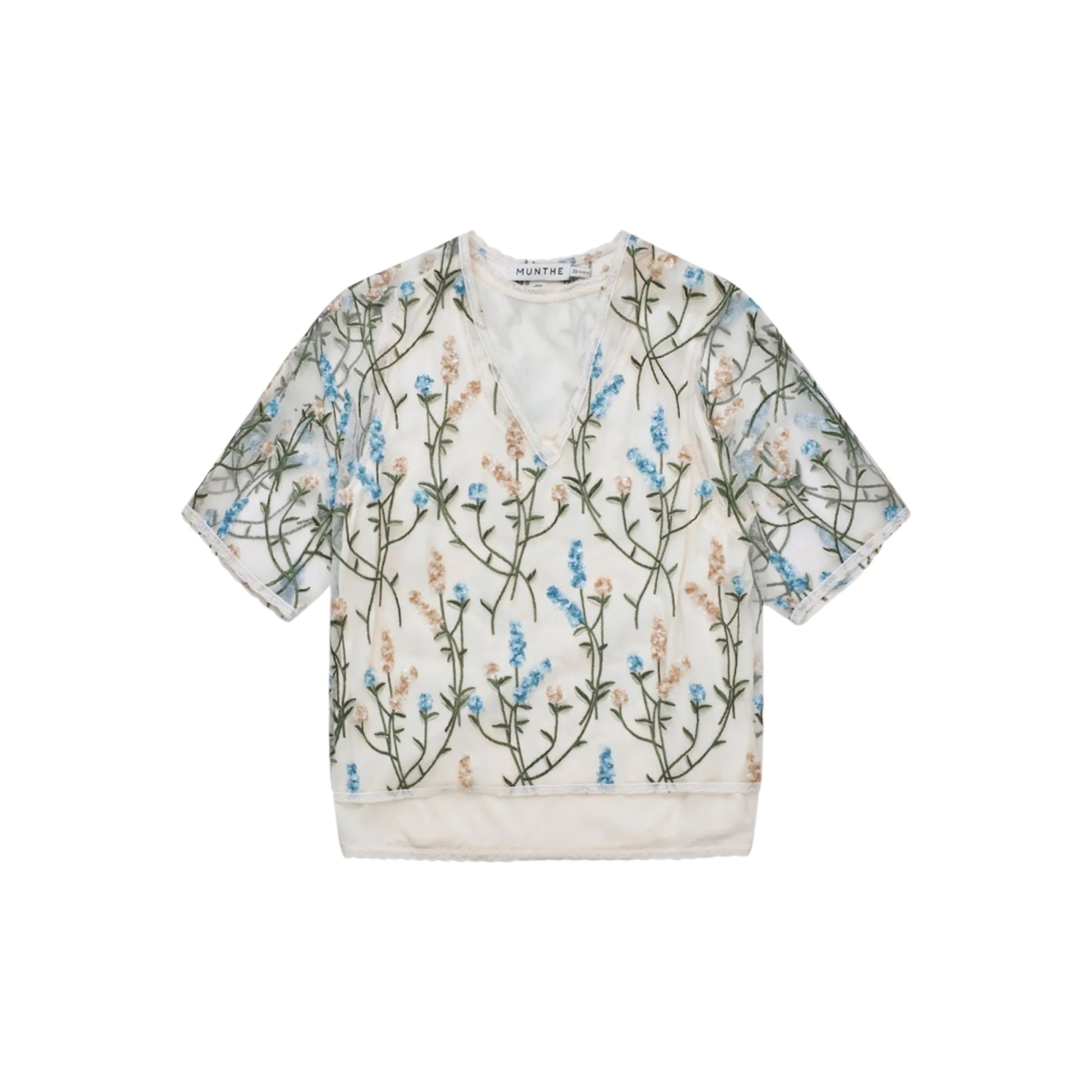 En smuk bluse designet med en elegant blanding af palietter og broderi, der skaber et smukt blomstermønster. Blusen er designet til at være gennemsigtig med en elegant slip-top under. Blusen har en rund halsudskæring og en løs pasform.