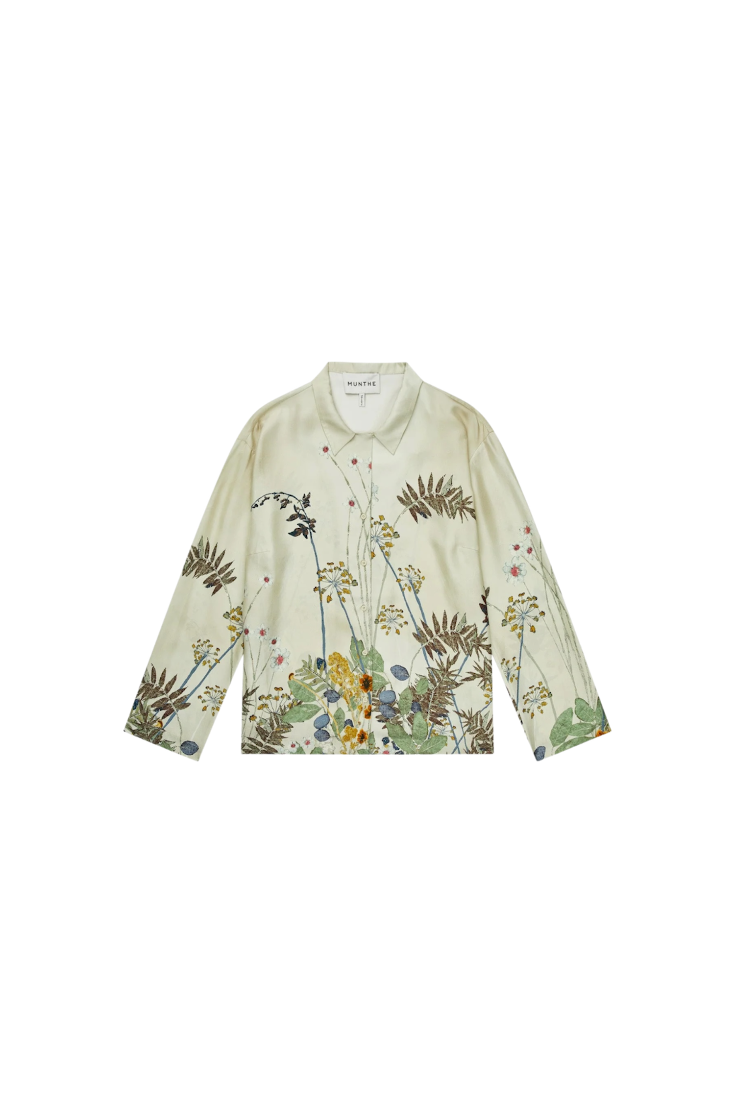 Bluse i 100% silke med et fint botanisk print. Den har lange ærmer, en klassisk krave og en afslappet pasform.