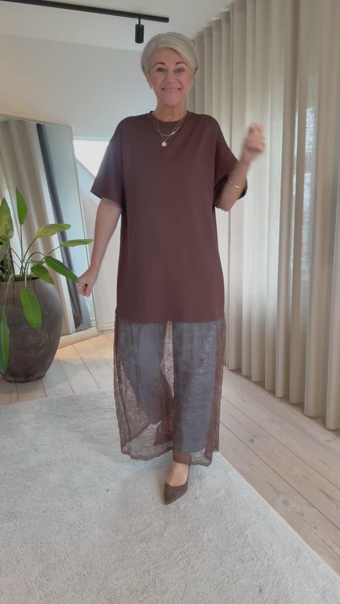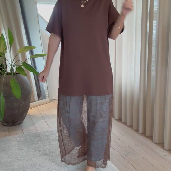 Love1447 er en lang kjole med lette, korte ærmer og fine blondedetaljer i bunden – en feminin og elegant kjole, der passer perfekt til både hverdag og festlige anledninger. Den lange silhuet skaber et smukt og flatterende udtryk, mens blonderne tilfører et romantisk touch.