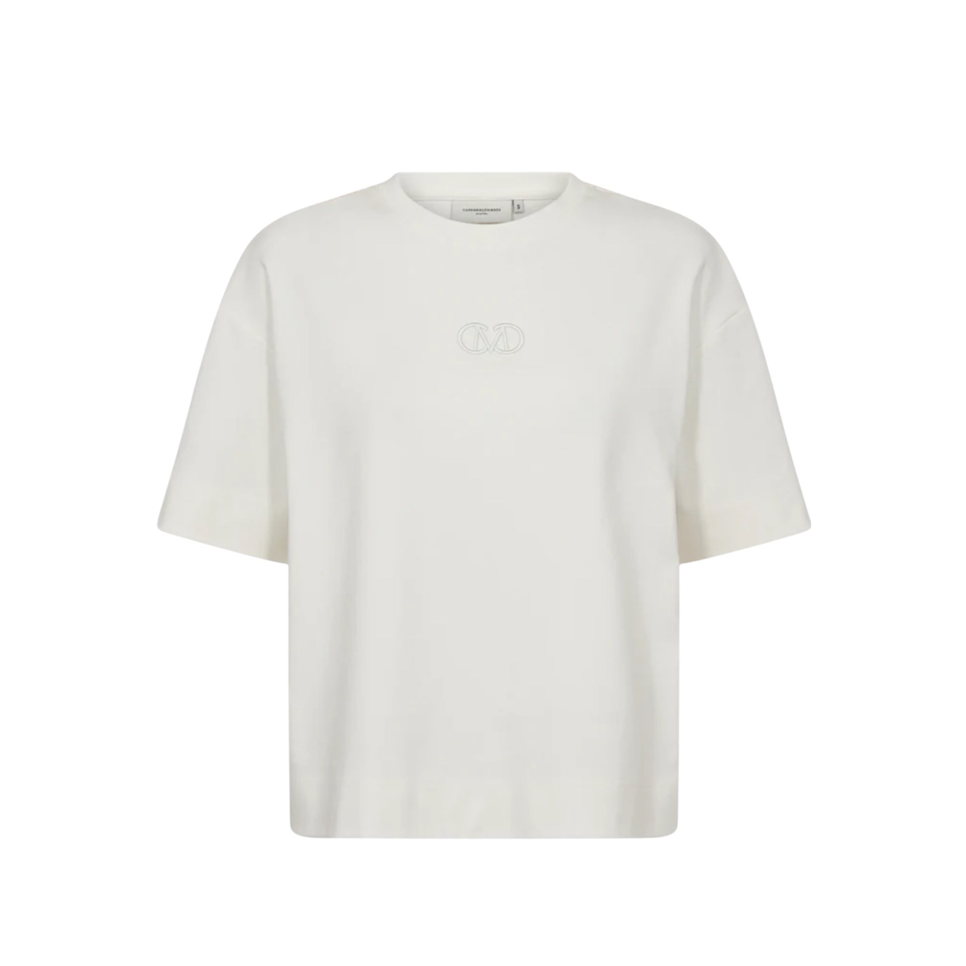 CMMUSE-TEE er en T-shirt i en eksklusiv, tyk bomuldskvalitet. T-shirten er kort i modellen med rib i den runde halsudskæring, en broderet logodetalje på brystet samt korte ærmer med drop shoulders, der understreger den oversize silhuet.
