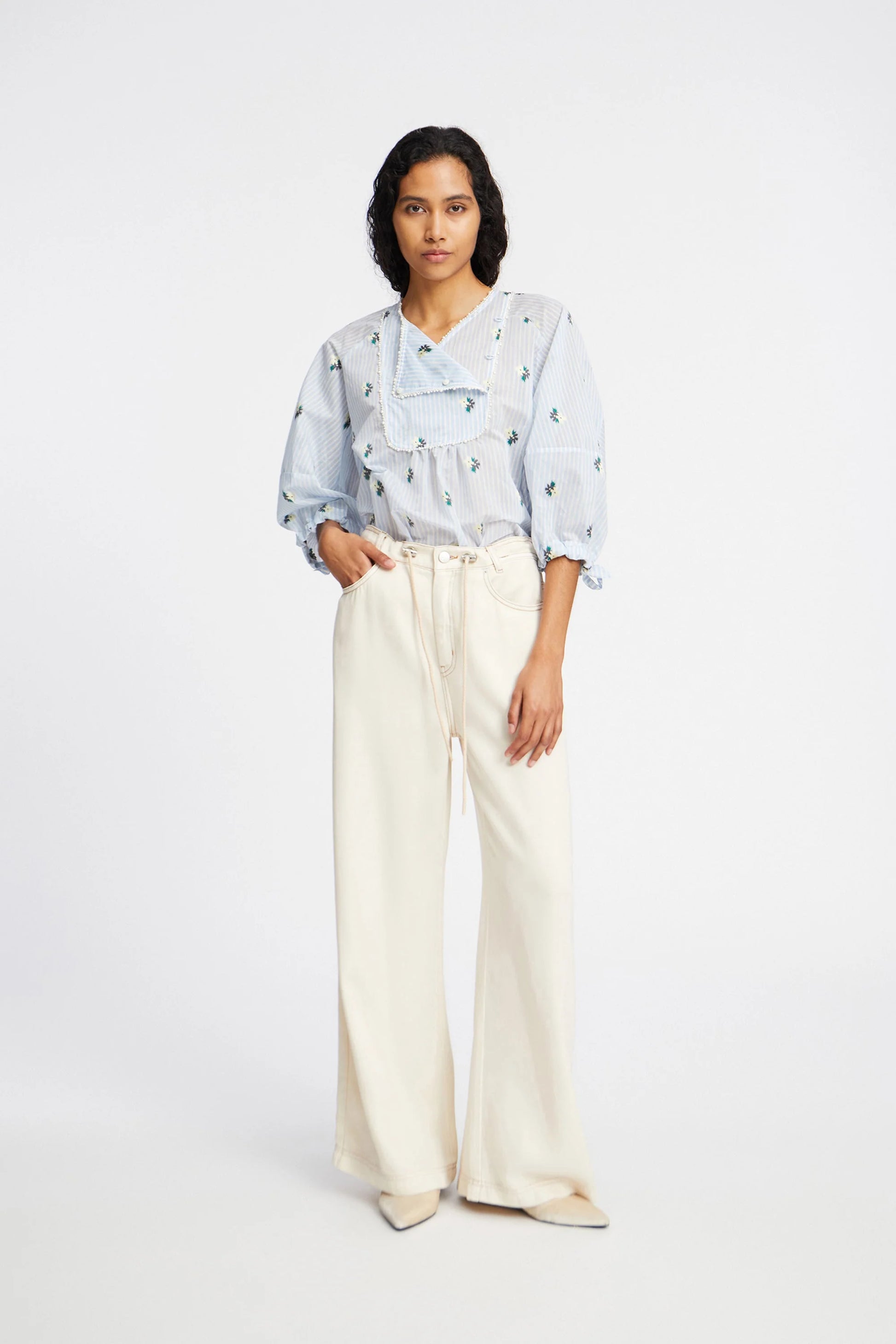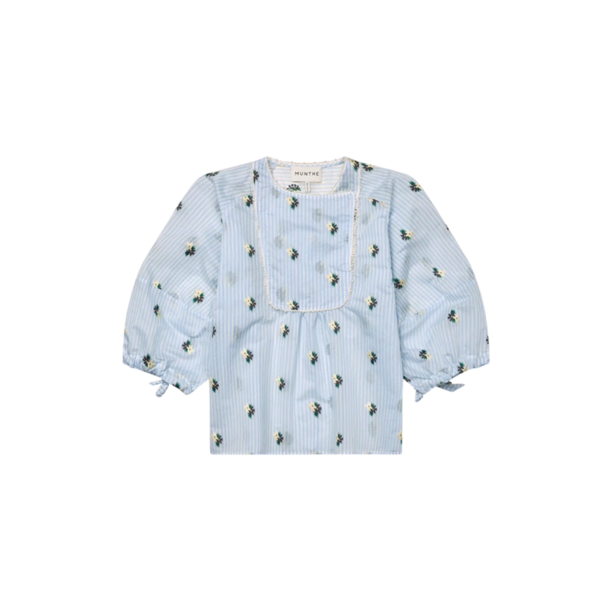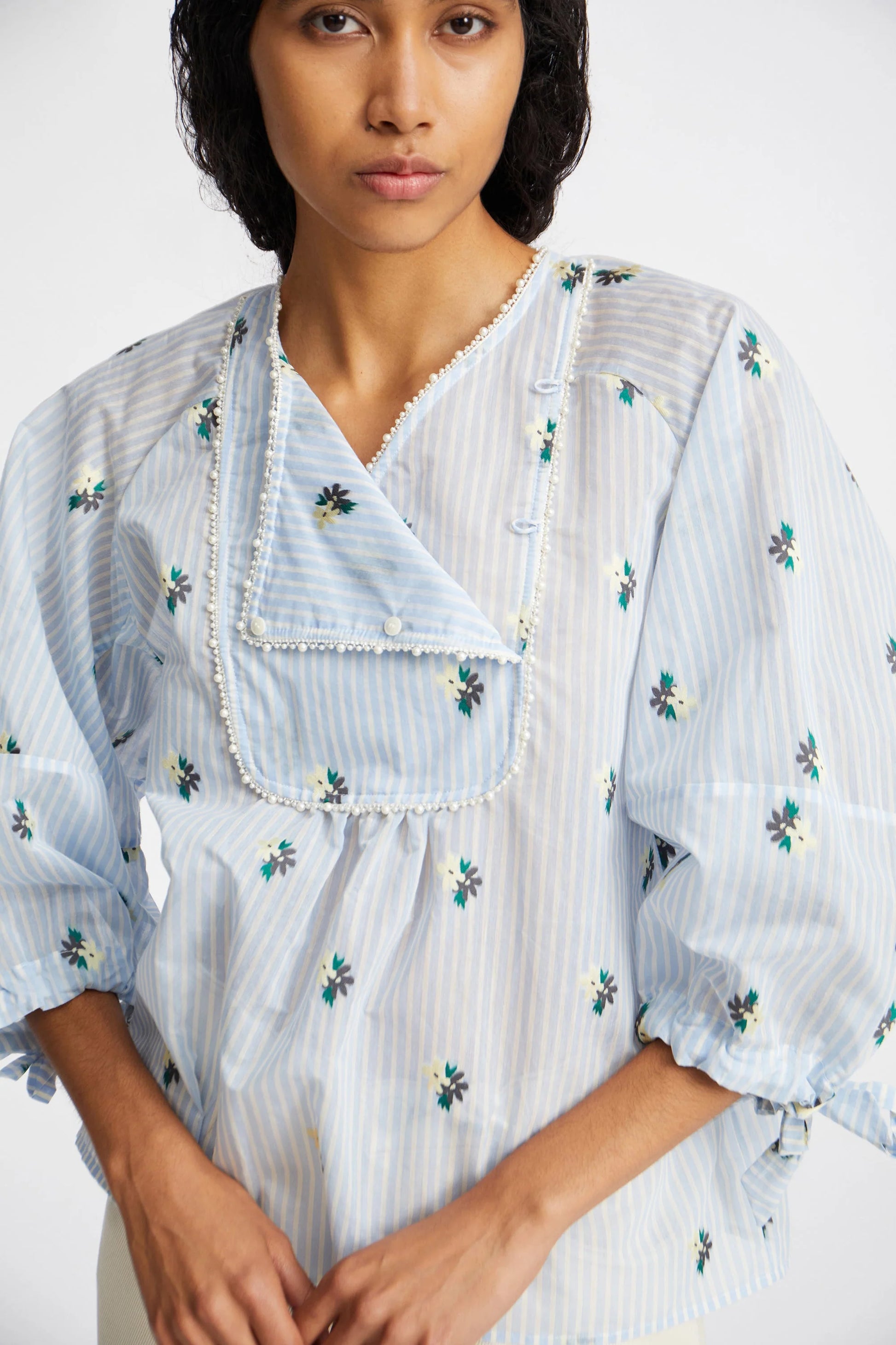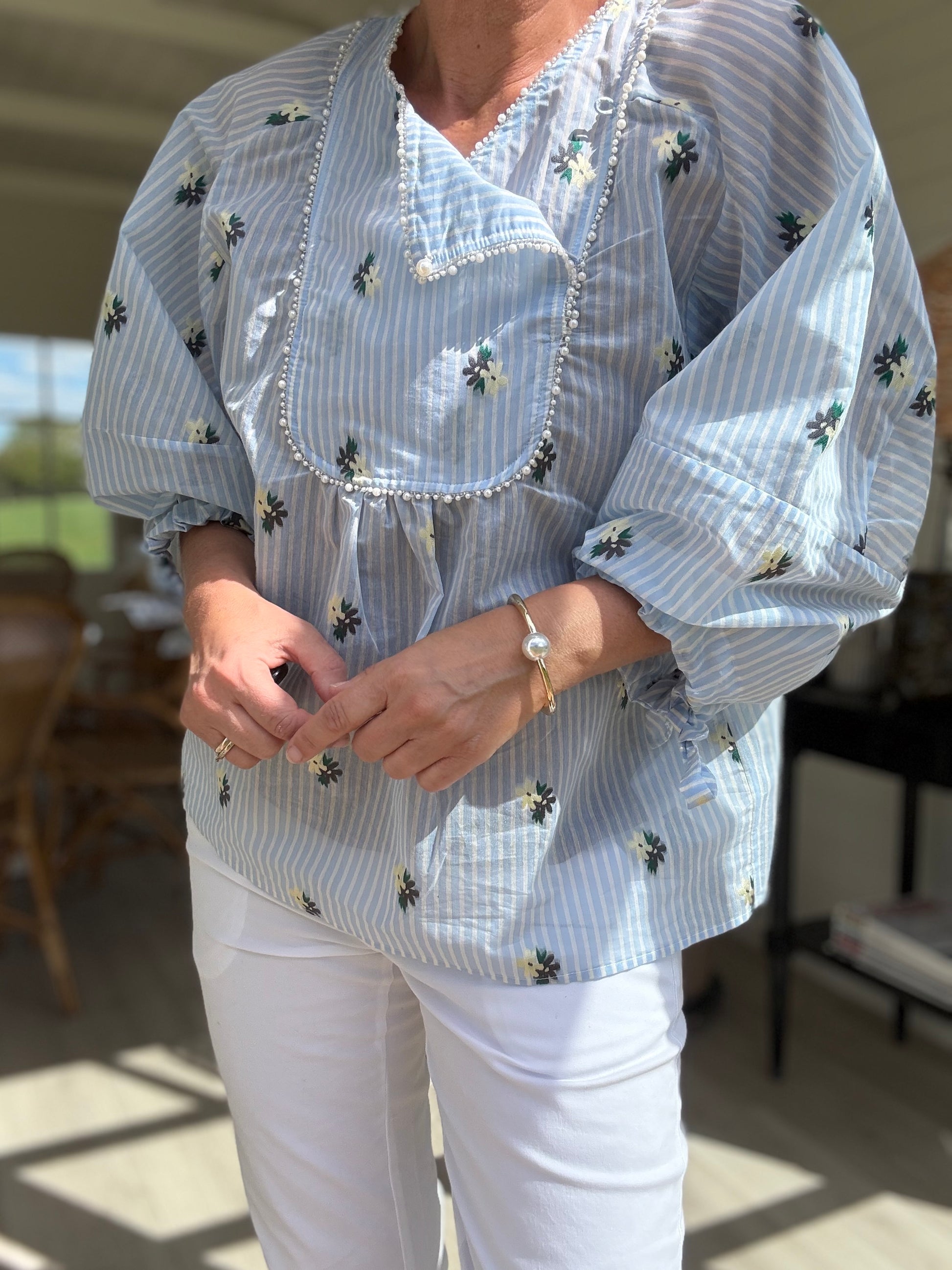 Bluse med striber og et fint blomsterprint. Denne bluse har en elegant perledetalje ved halsen samt ved skjortens lukning. Skjorten er designet med en asymmetrisk knaplukning foran, og ærmerne har en fin bindedetalje og er skabt med et let puf.