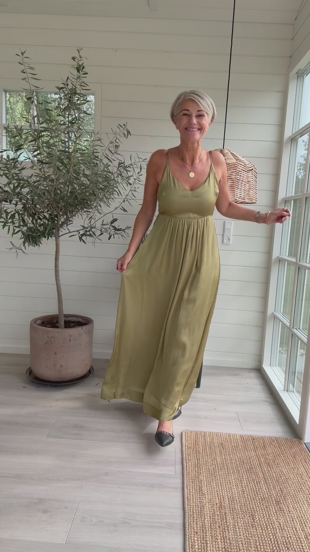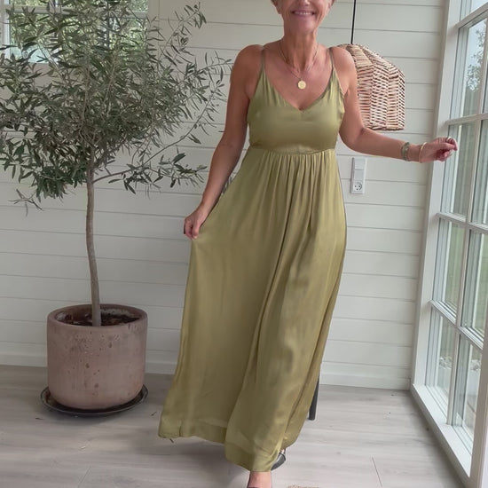 Flot lang stropkjole med v-halsudskæring. Kjolen kommer i en fin blød viskose kvalitet.