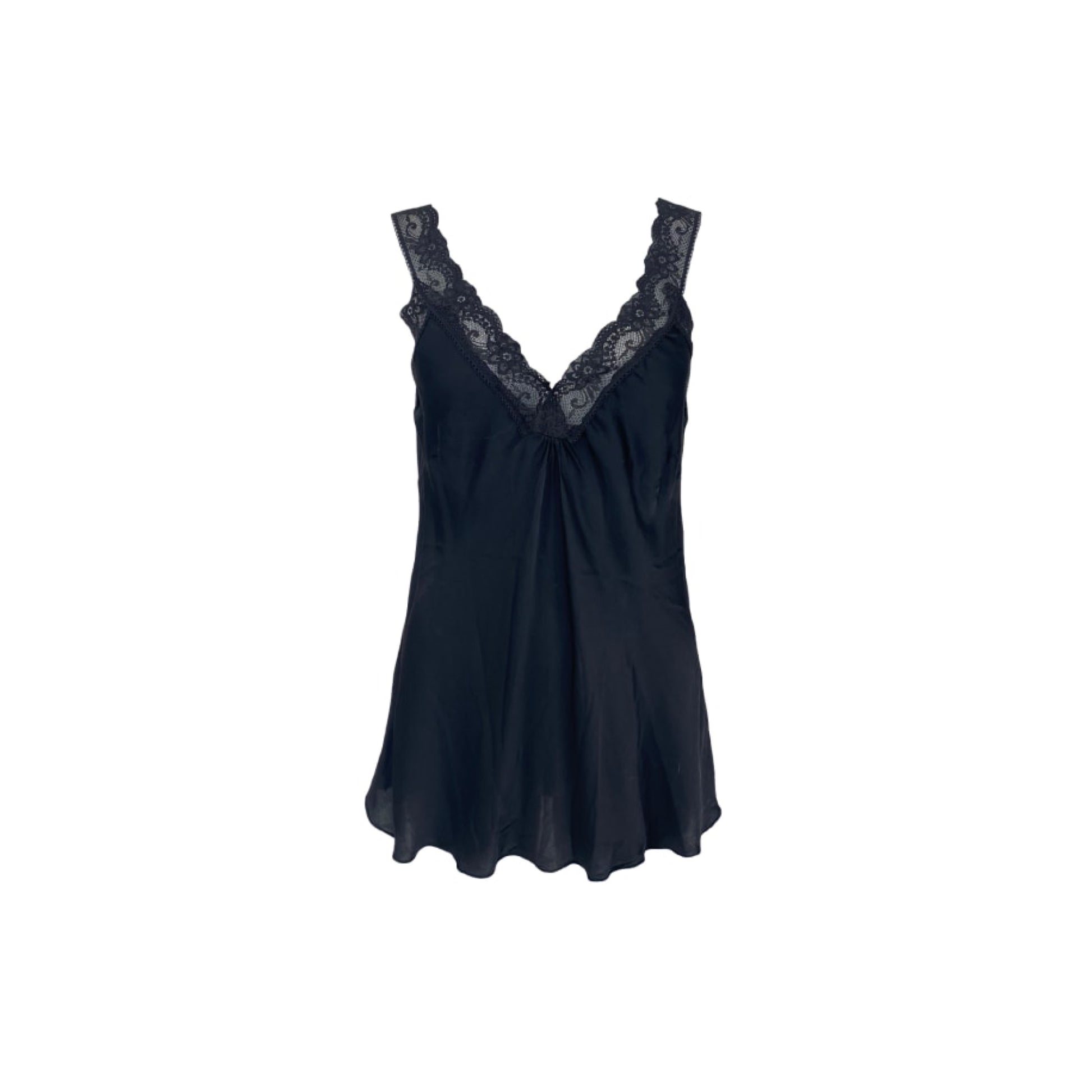 Satin blondetop med blonder ved halsudskæringen og ved ærmegab.