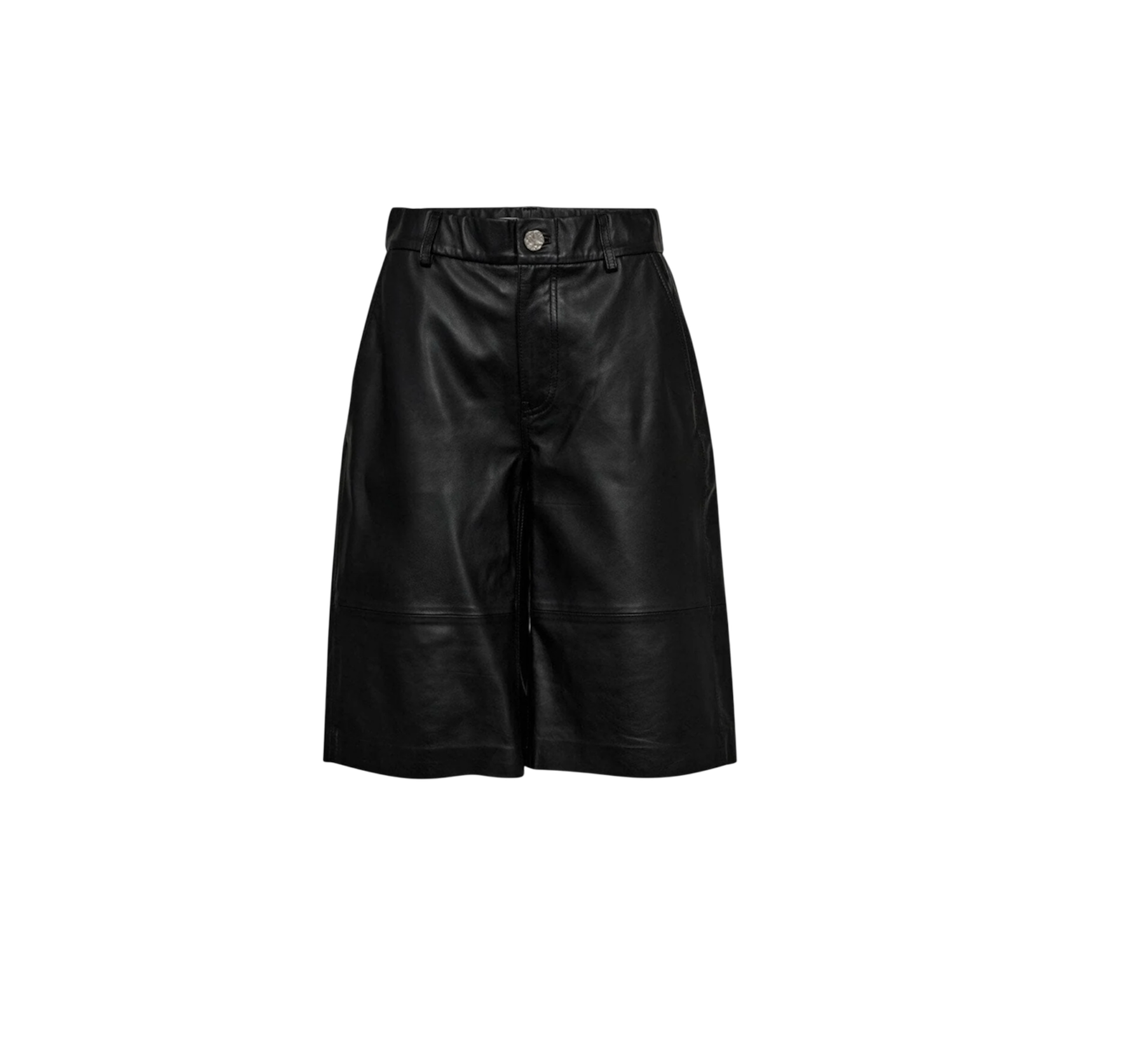 Ultra lækre sorte bermudashorts fra Haute L'amitié, designet i blødt skind. Shortsene har en perfekt længde - lige til knæet, almindelig talje med bæltestropper, knap- og lynlåslukning og vide ben.