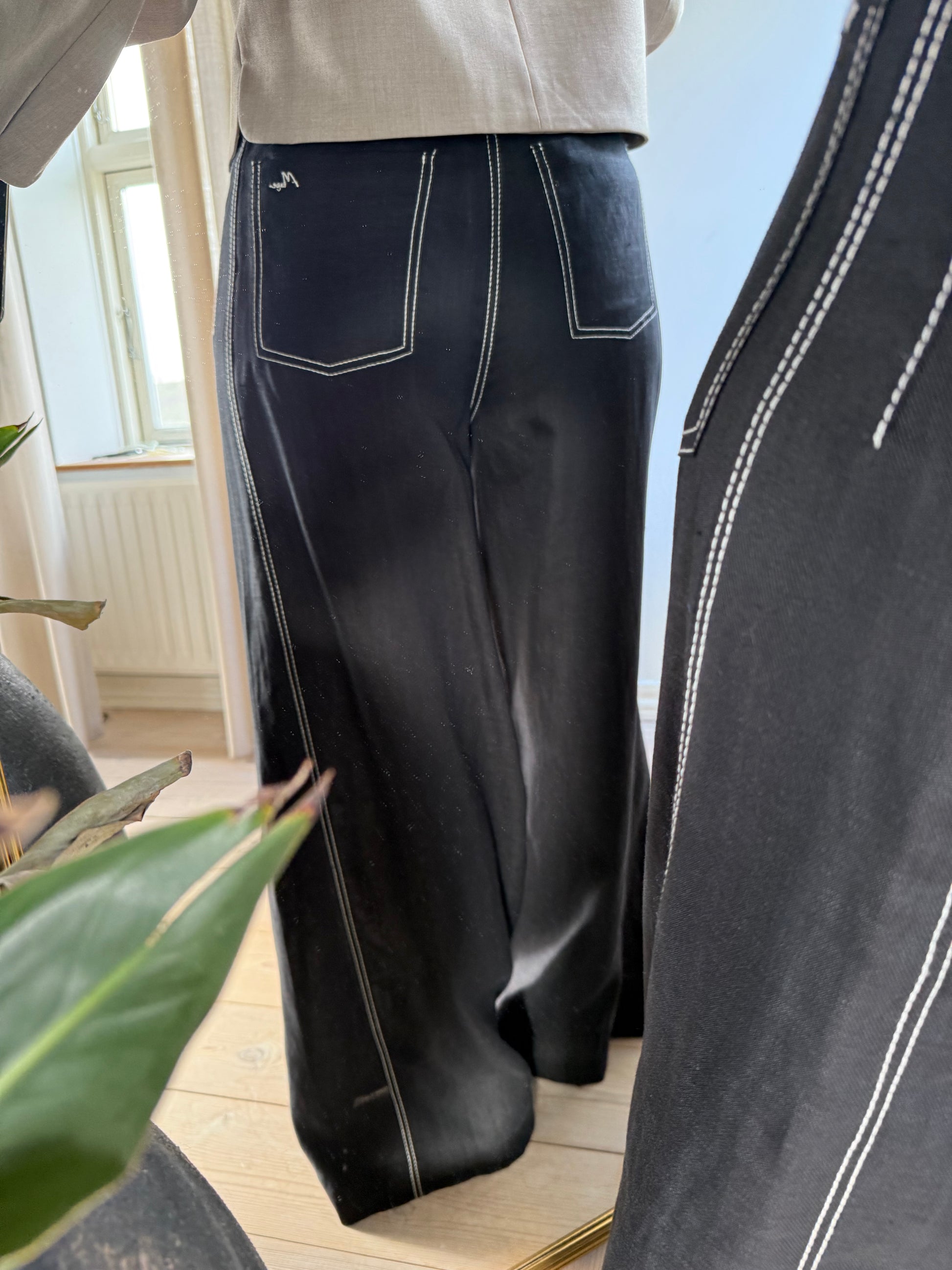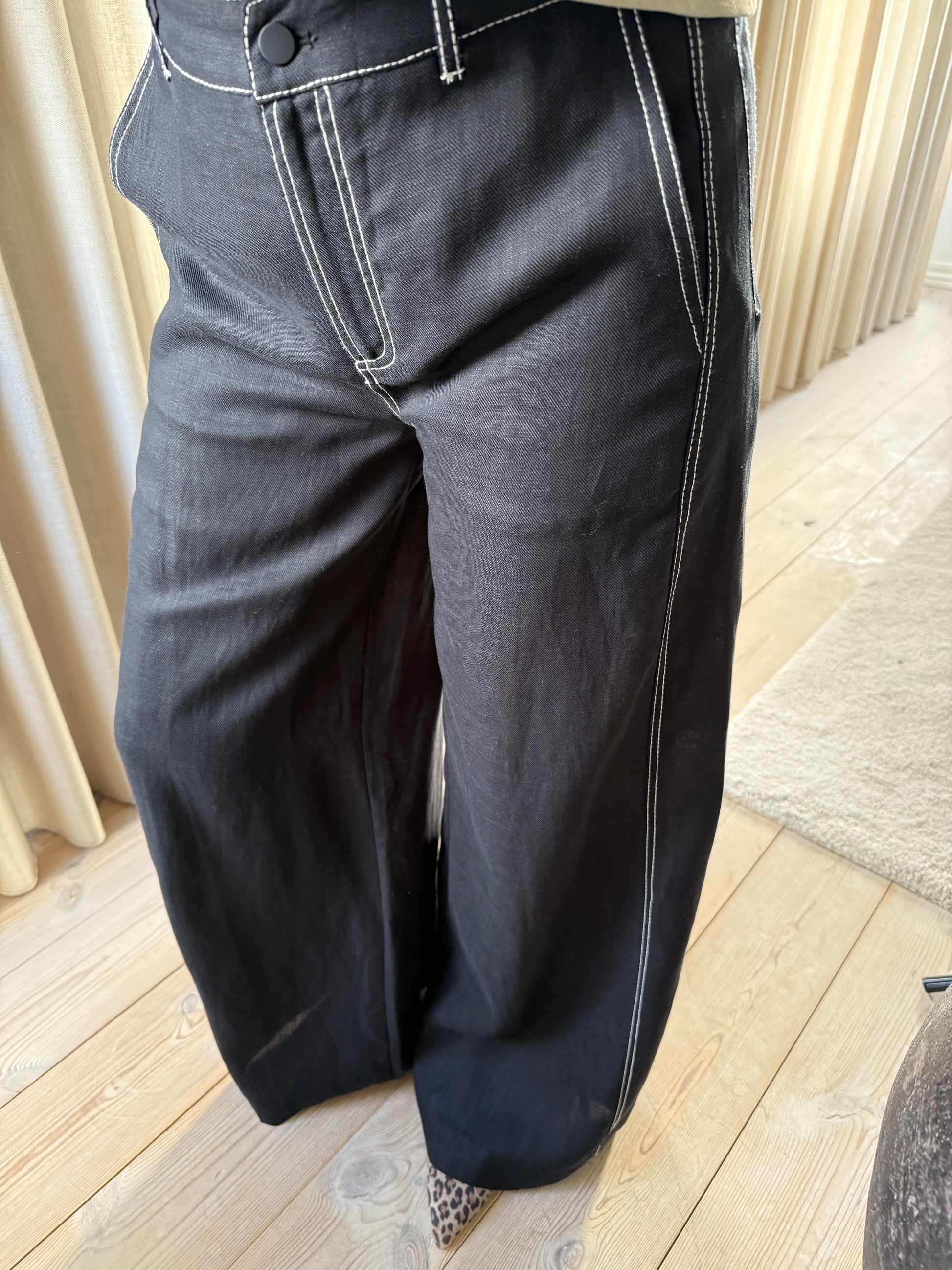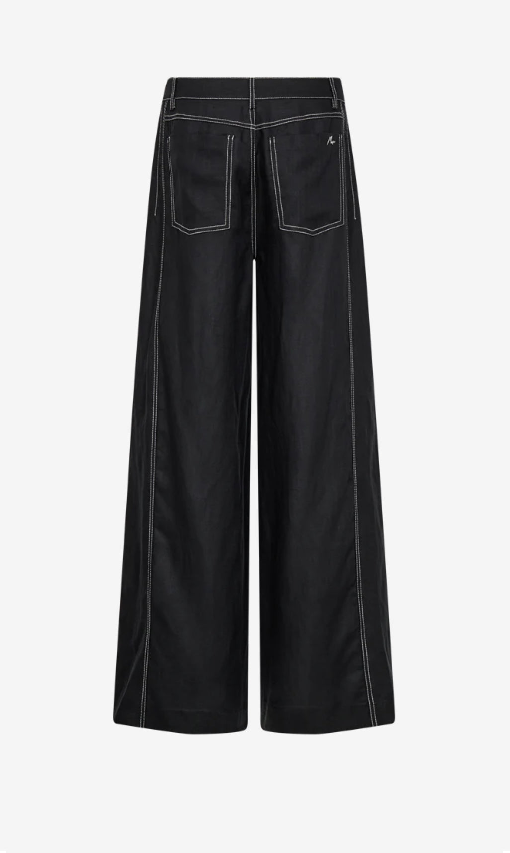 CMNATULI-PANTS er et par højtaljede bukser i en eksklusiv kvalitet af 100% hør med monokrome kontraststikninger. Bukserne har desuden knap- og lynlåslukning, vide bukseben samt en lille logodetalje på baglommen.