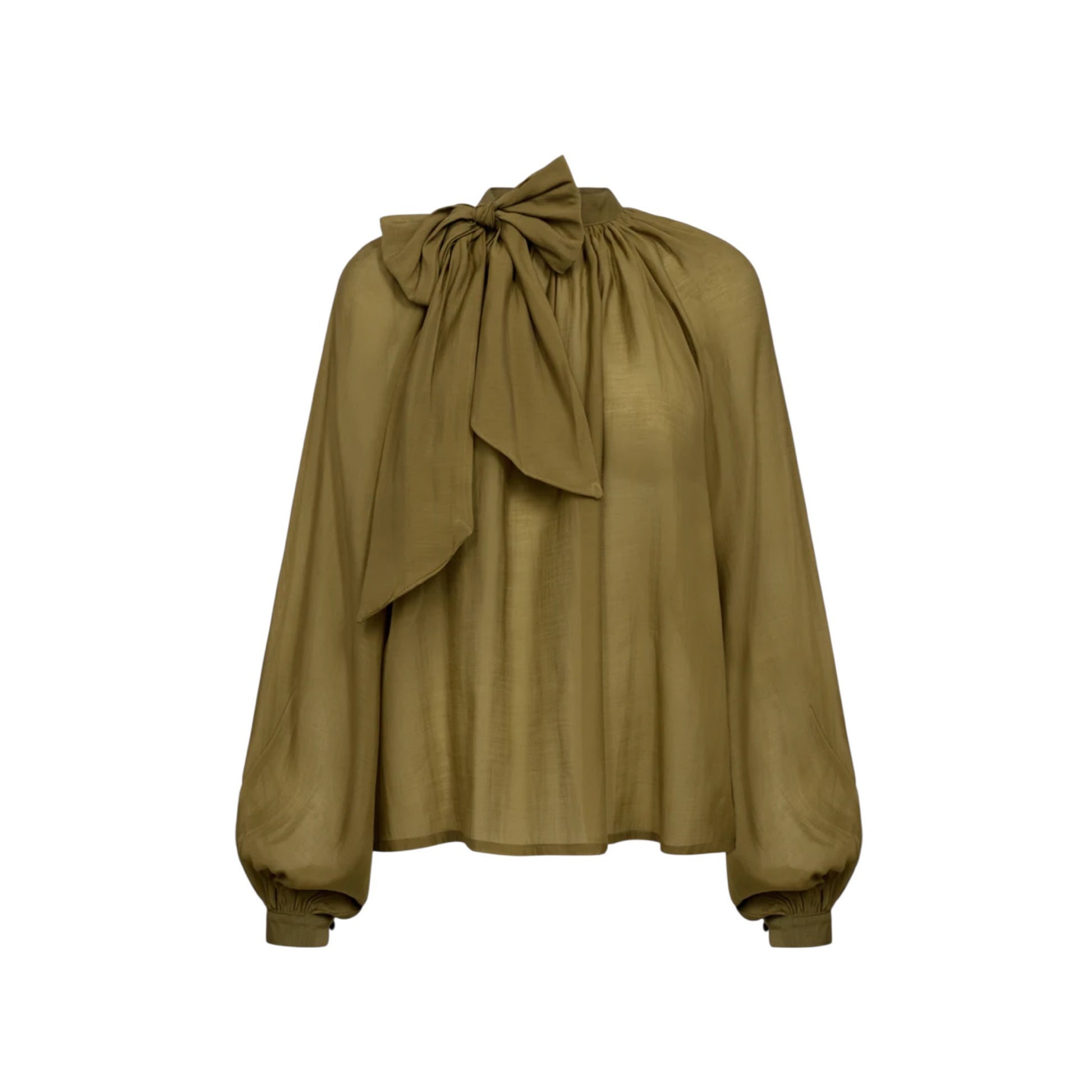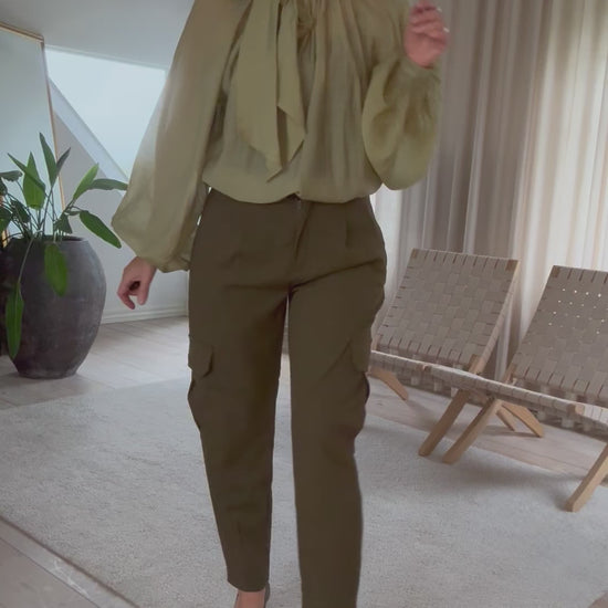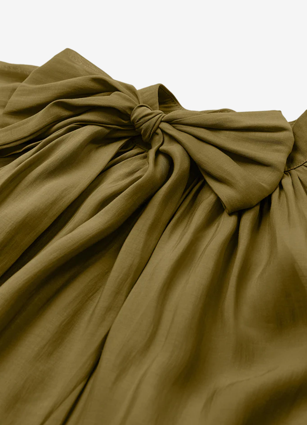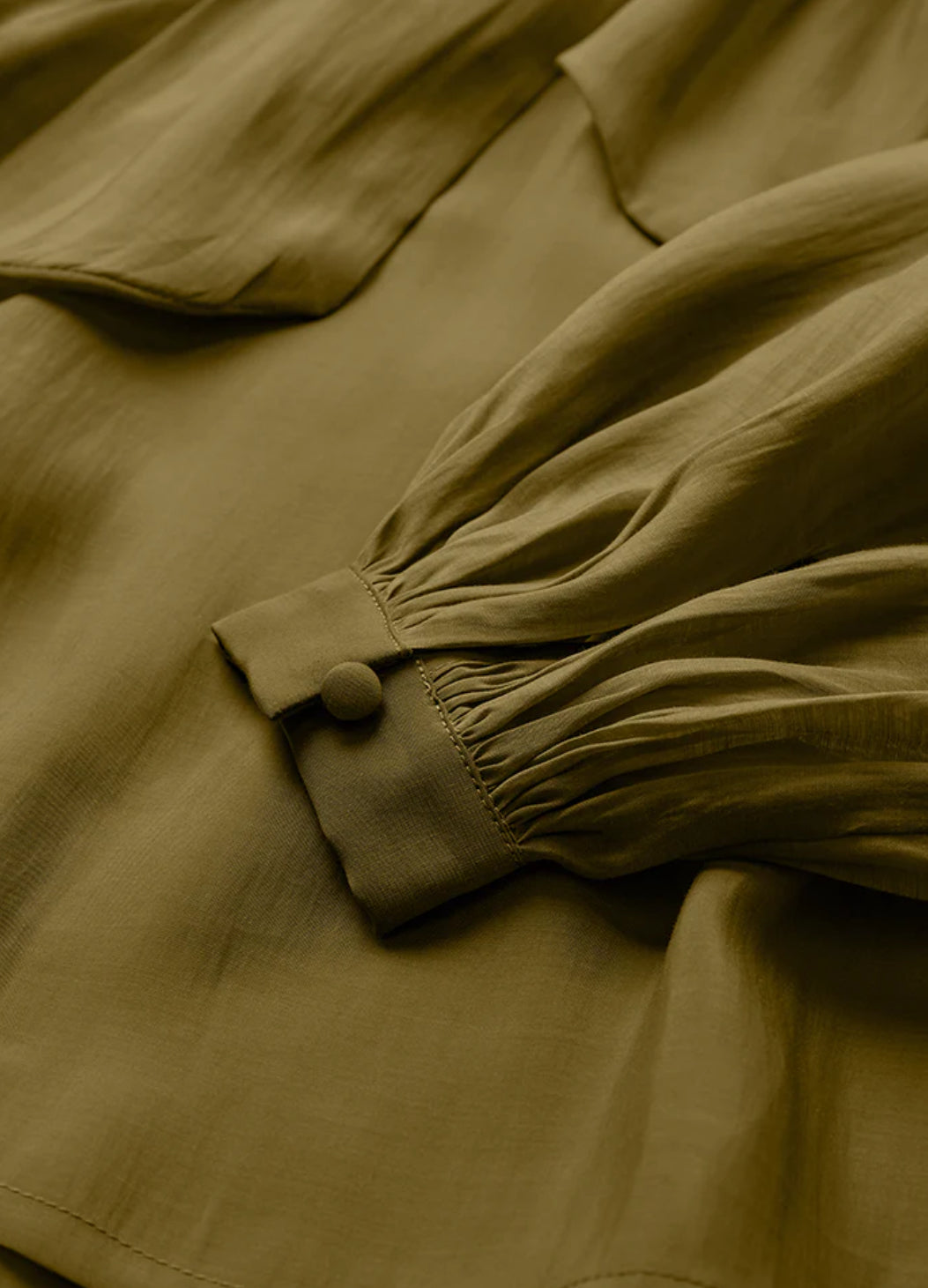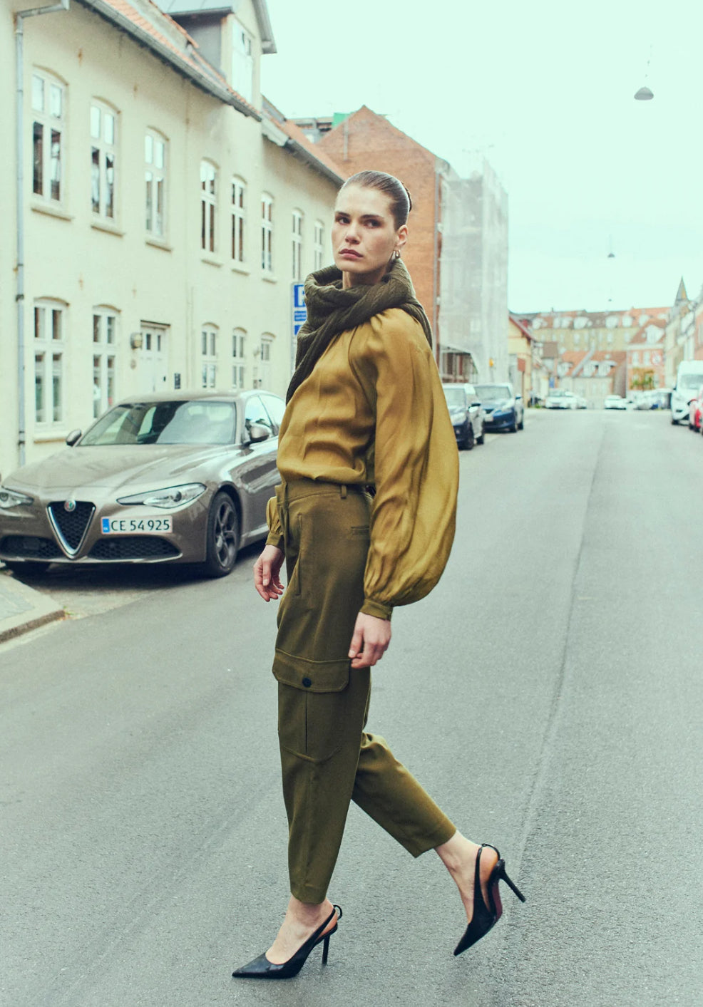 CMTILLY-BLOUSE er en bluse i en ekslusiv kvalitet med en ekstravagant, aftagelig sløjfedetalje i den høje krave, lægdetaljer, en slids med stofknapper på ryggen samt lange raglanærmer med voluminøs balloneffekt og knaplukning. Sløjfen kan tages af.