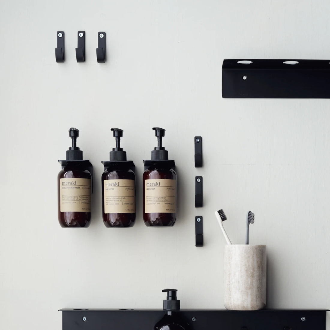 Dette dekorative og flotte vægophæng fra Meraki, passer perfekt til blandt andet vores shampooer og balsammer, sæber og lotions. Den er belagt i en flot sort nuance, som gør at den passer ind i ethvert hjem og emmer af eksklusivitet. Hæng den i brusenichen og undgå at dine sæber roder på gulvet. Eller brug i køkkenet til opvaskemiddel og håndsæbe. Mulighederne er mange men uanset hvad, vil det skabe et industrielt og dekorativt look i hjemmet. Passer til vores 275 ml + 490 ml flasker.