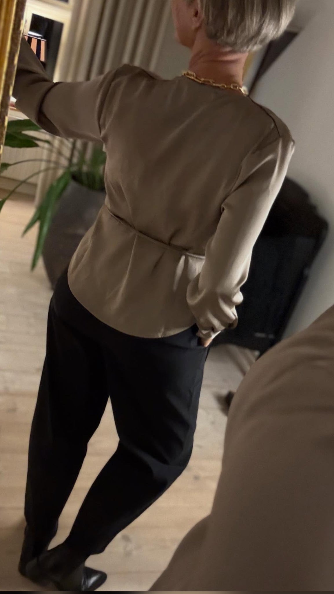 Satinbluse med lange løse ærmer og knaplukning ved manchetterne. Blusen har en omslagseffekt og lukkes med bindebånd i siden.