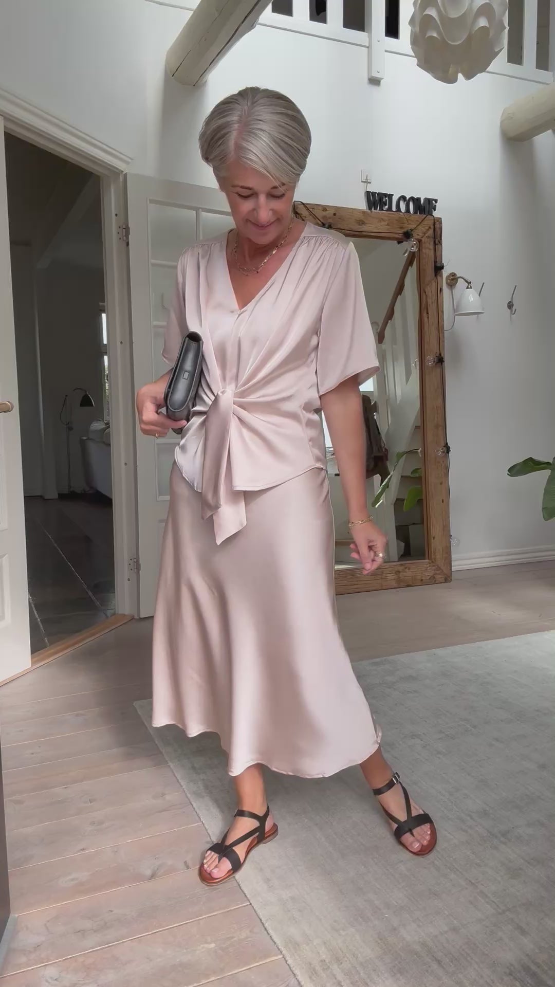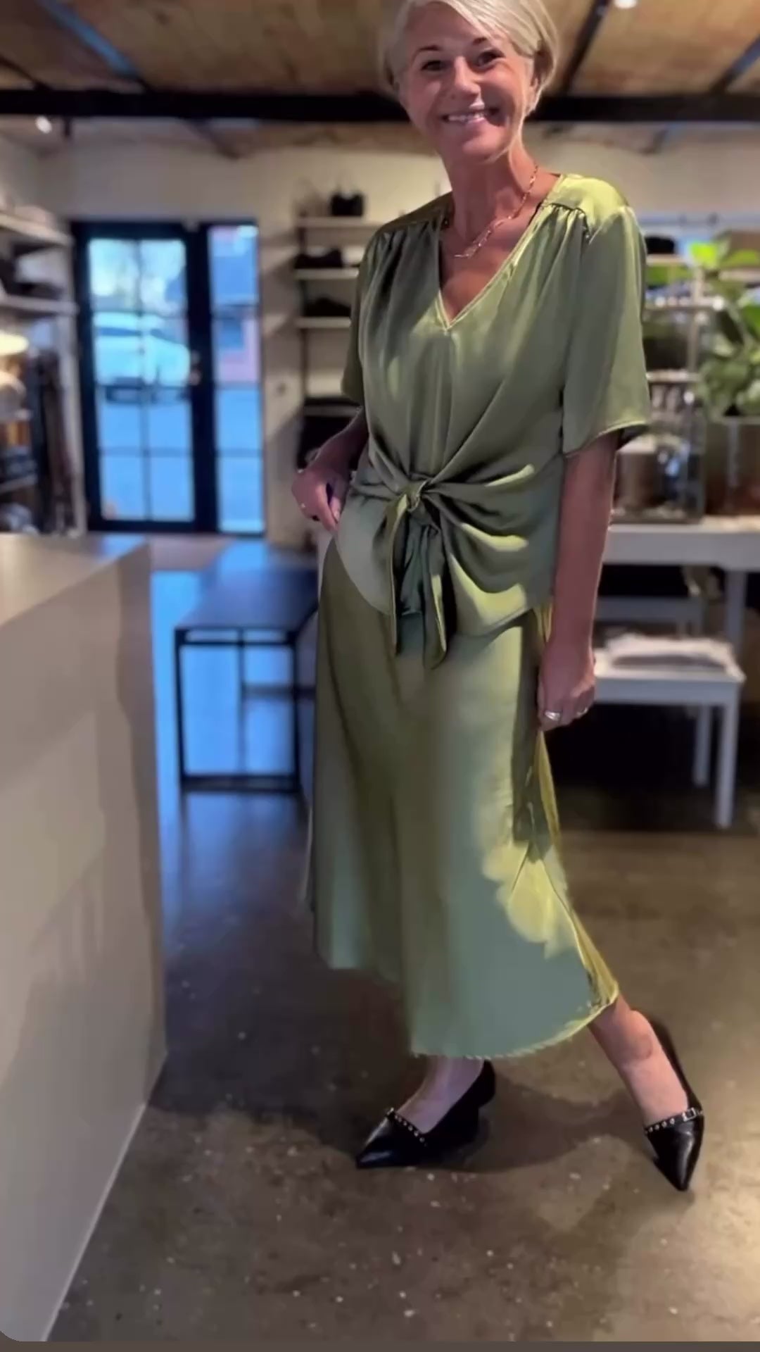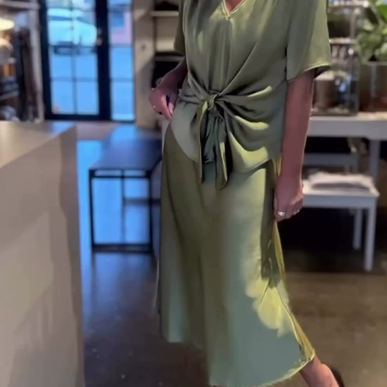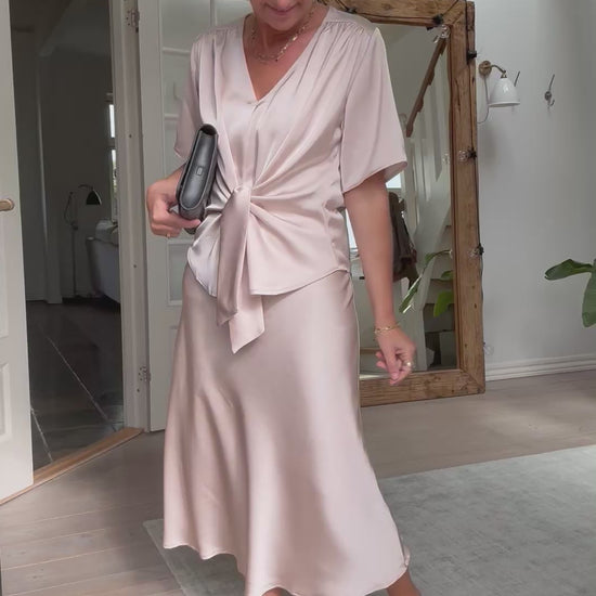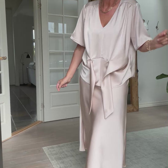Feminin bluse med knude foran der gør at skjorten kan laves løs eller sidde mere til i taljen. Kommer i en fin og tung satin kvalitet.