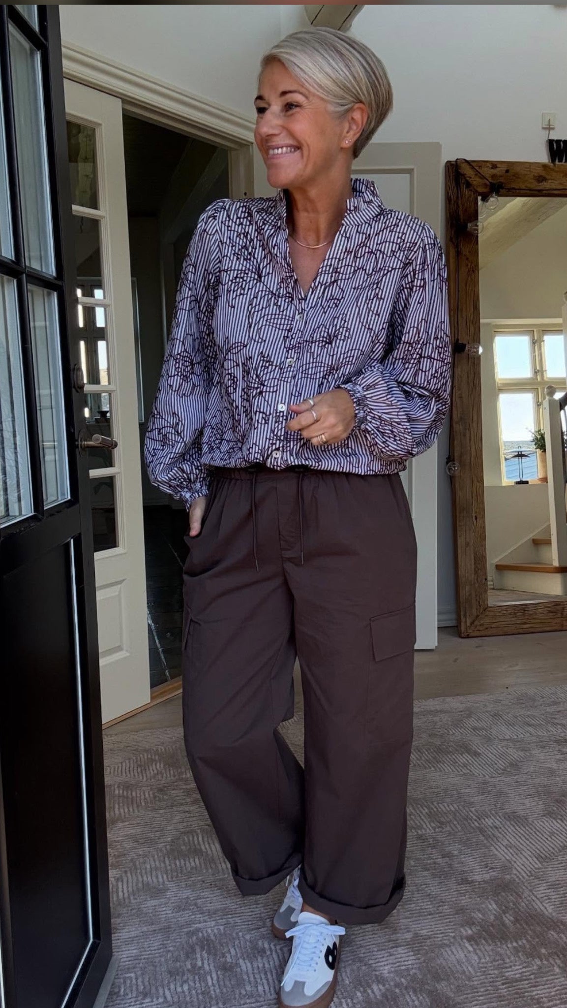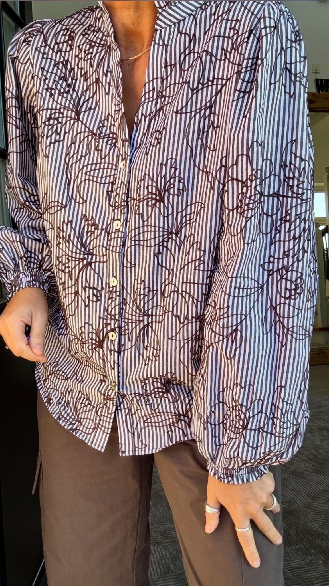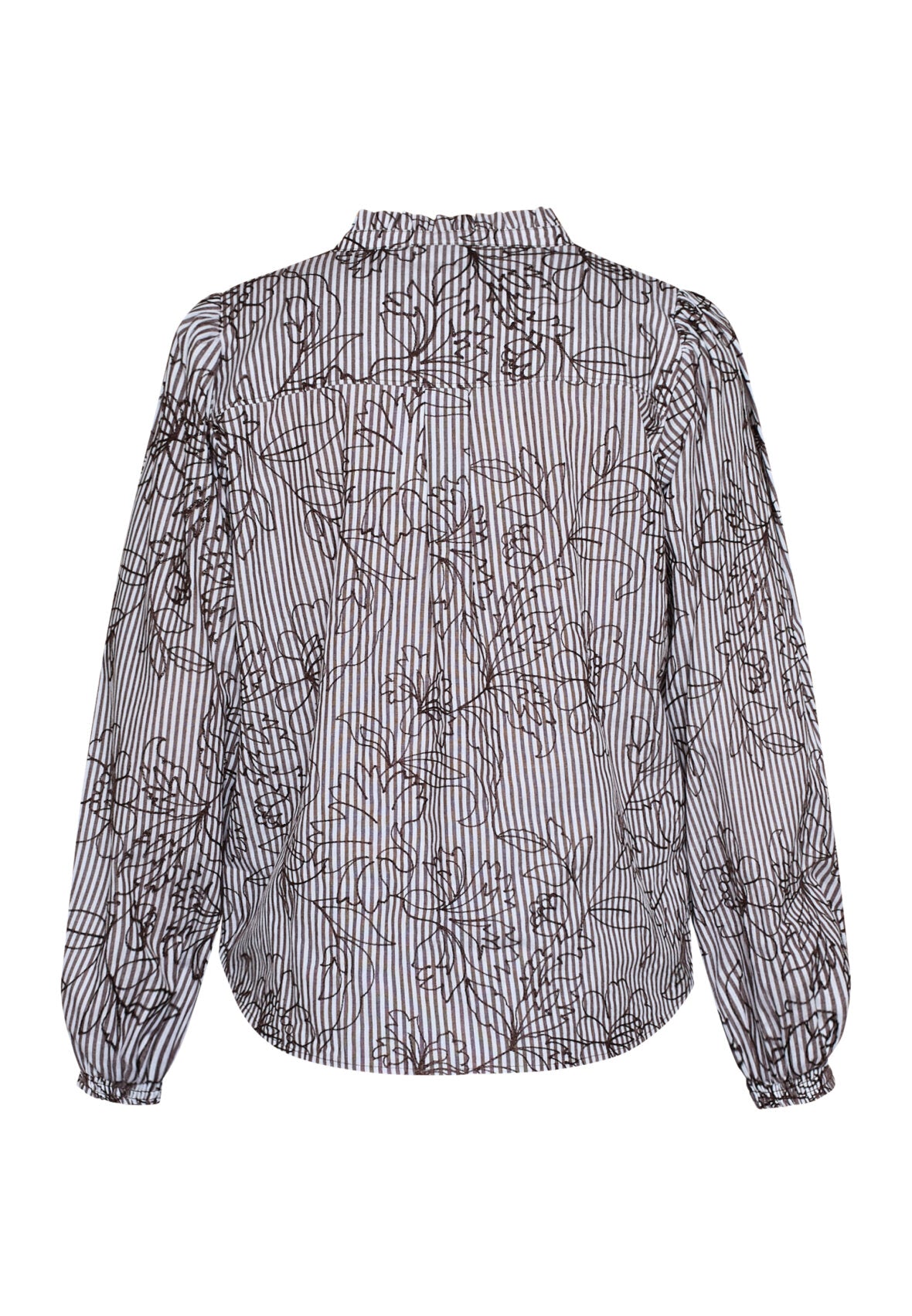 love1507 er en feminin bluse med grafisk mønster. Den har en feminin kinakrave med flæser, V-hals og voluminøse ballonærmer med smalle manchetter.