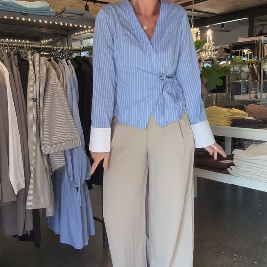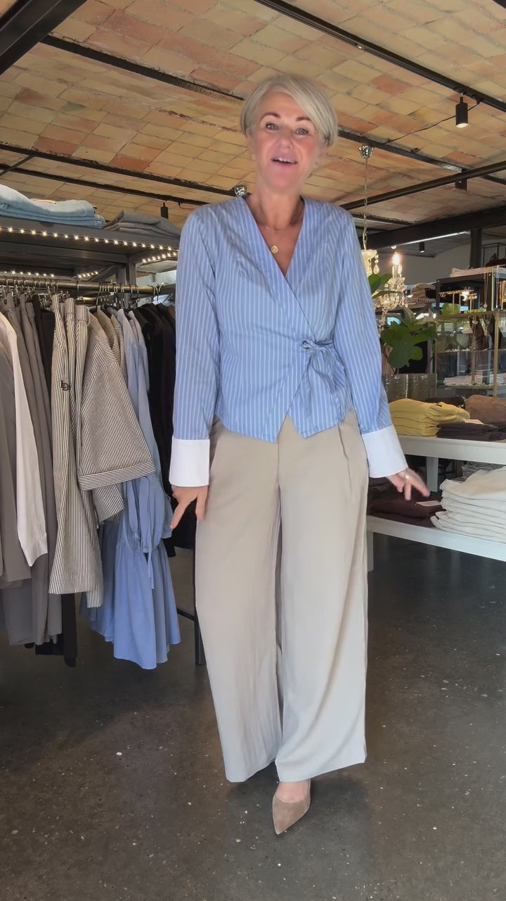 Denne indpakningsskjorte til kvinder er designet i en sprød stribet poplin-kvalitet, der kombinerer klassisk elegance med et moderne twist. Med sin flatterende wrap-effekt og cool snøre-detalje er skjorten et stilfuldt valg til både arbejde og hverdagsbrug.