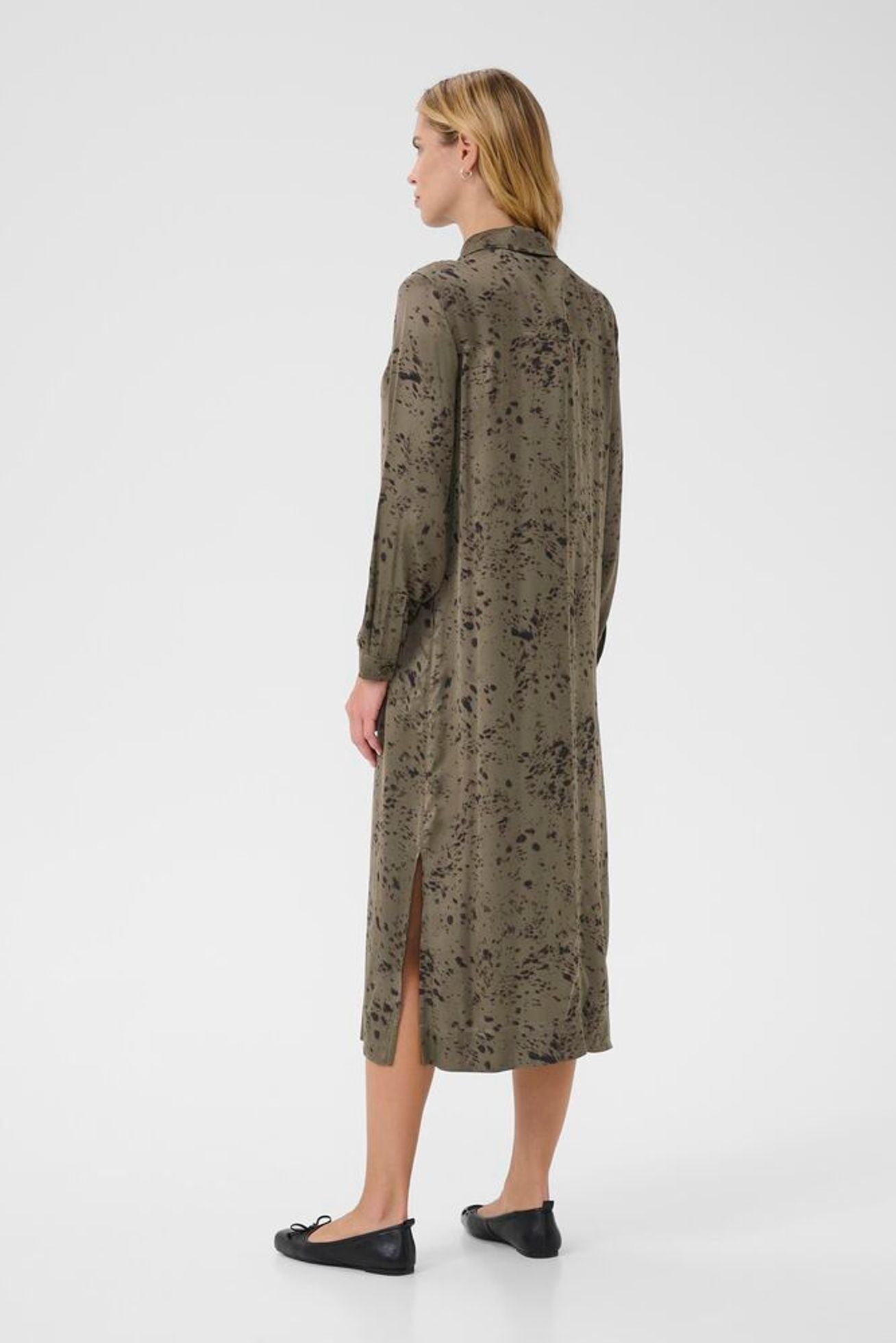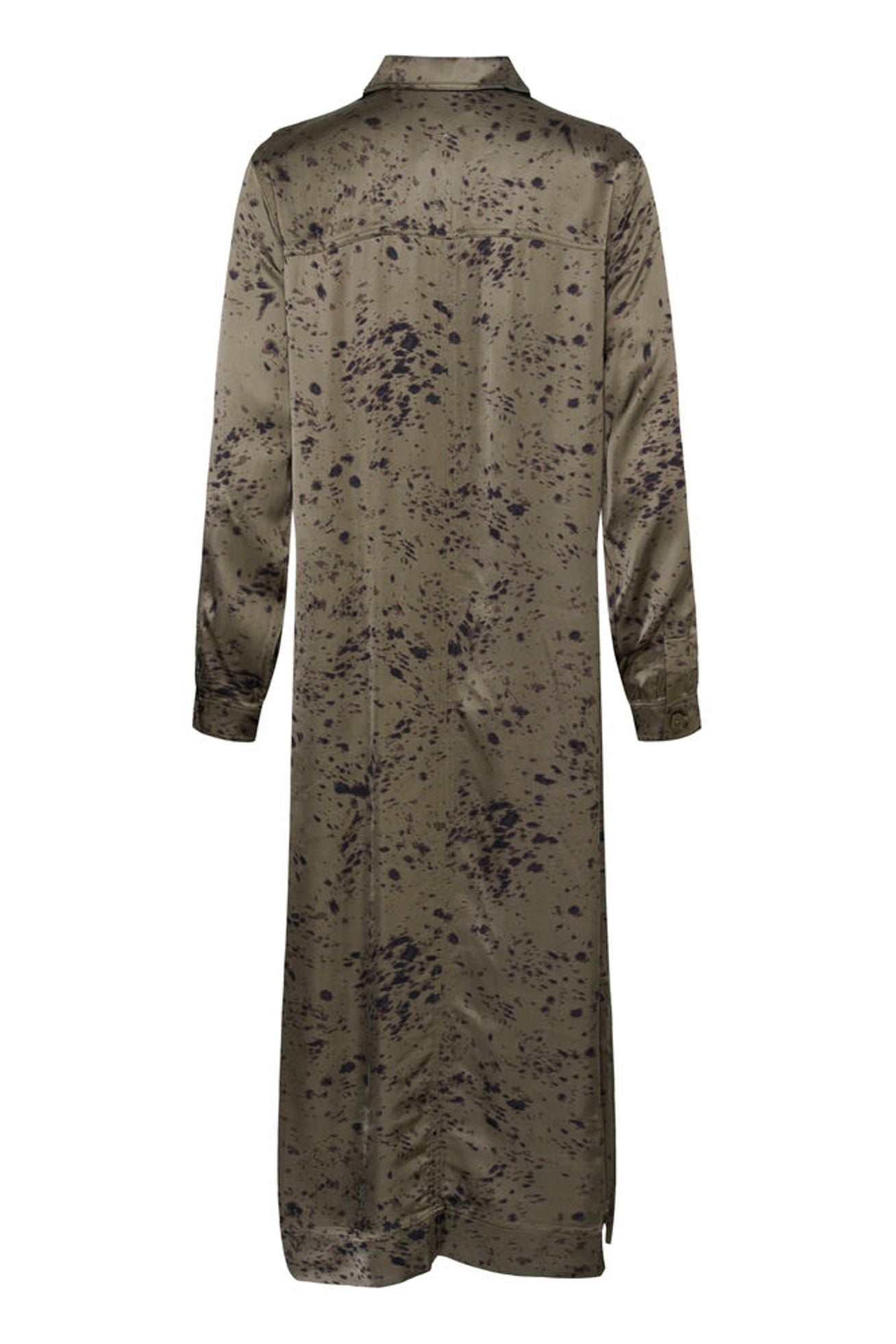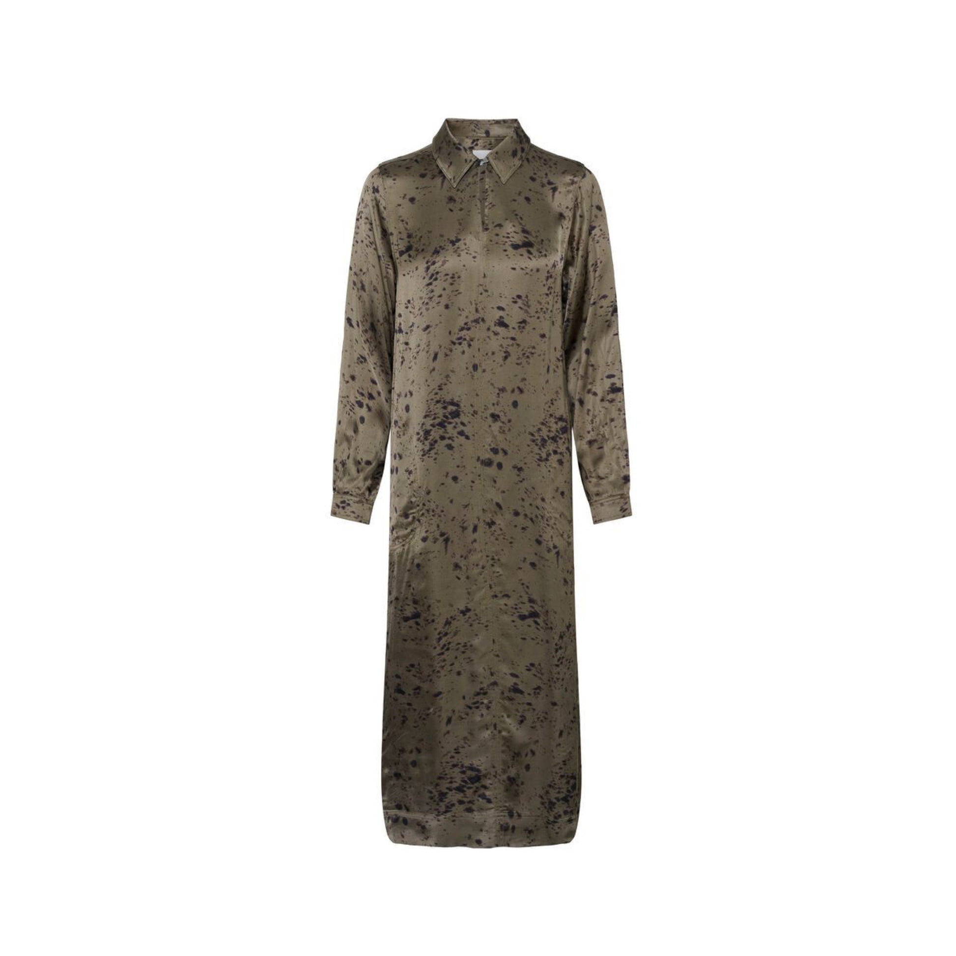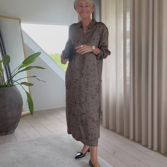 Lang grøn mønstret kjole fra Part Two. Kjolen har en knap øverst ved kraven.