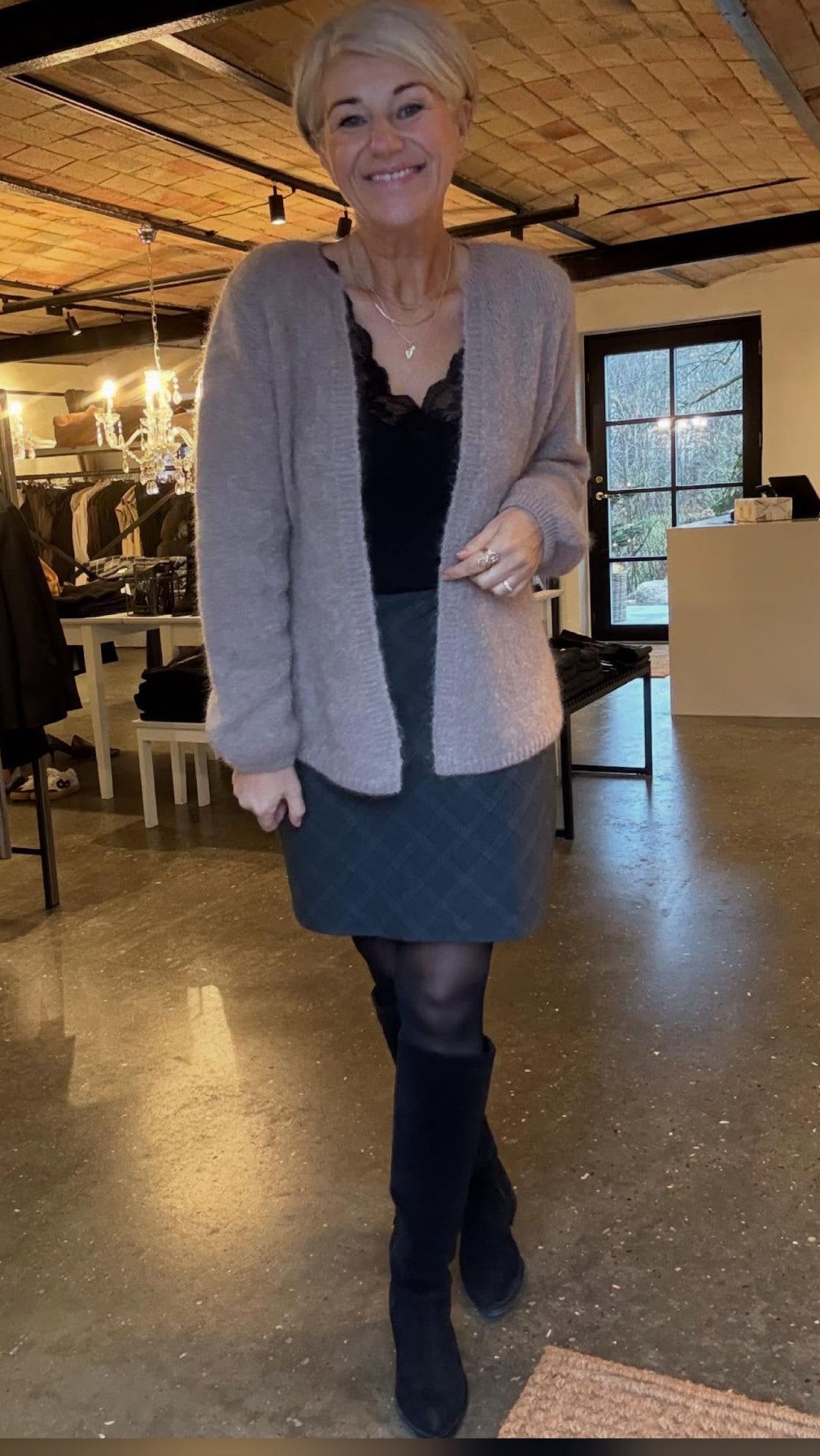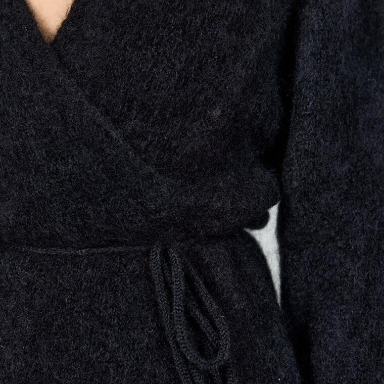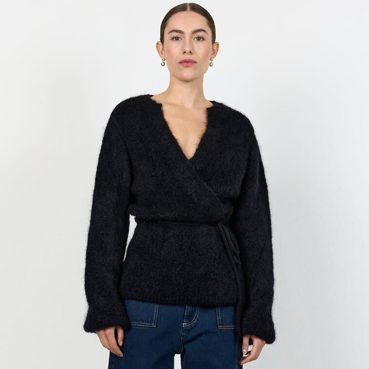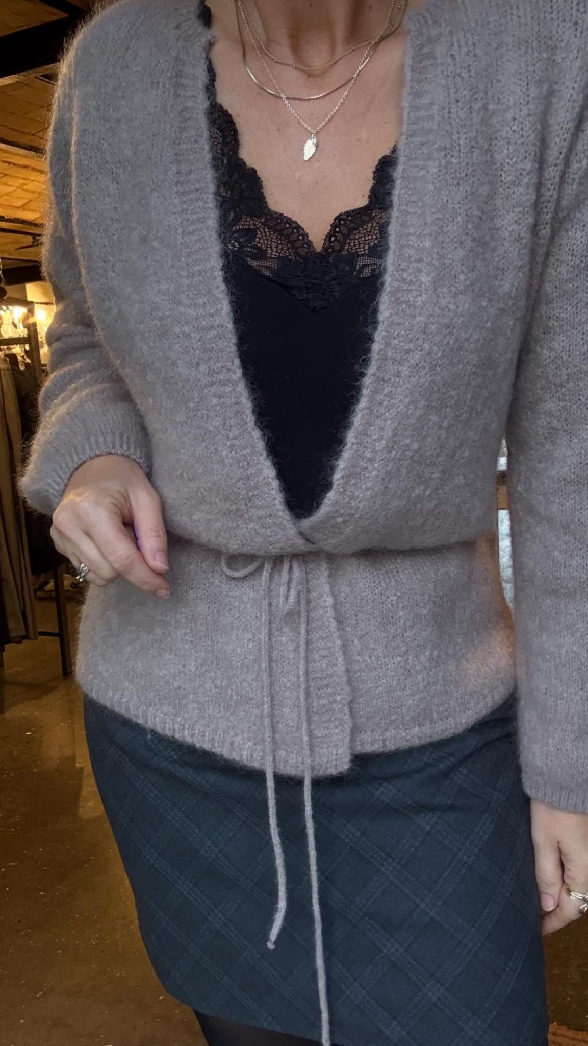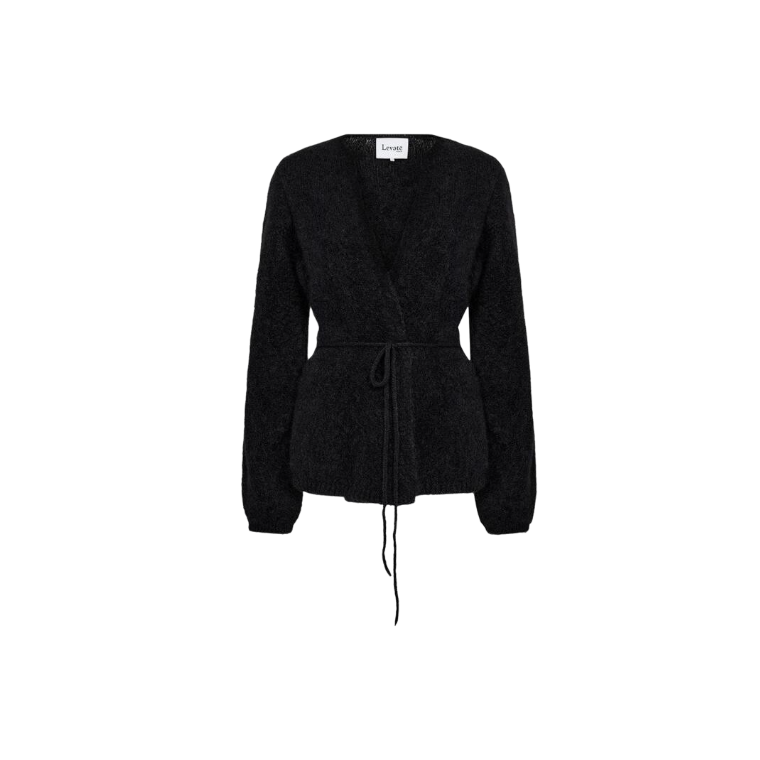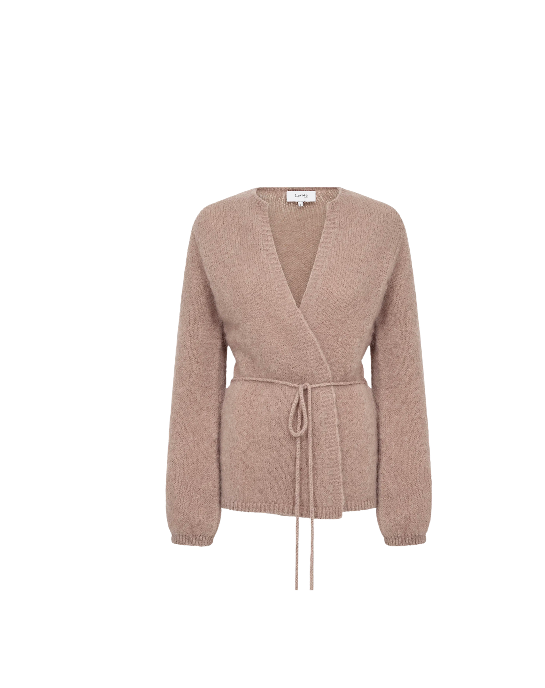 Elegant cardigan med bindebånd fra Levet'e Room. NOREEN 7 cardigan er strikket i den blødeste mohair blanding, med en børstet overflade. Den har v-hals og lukkes med et strikbindebånd i taljen og lange ærmer afsluttet med en ribkant. Style den med et par suit bukser for et sofistikeret look.