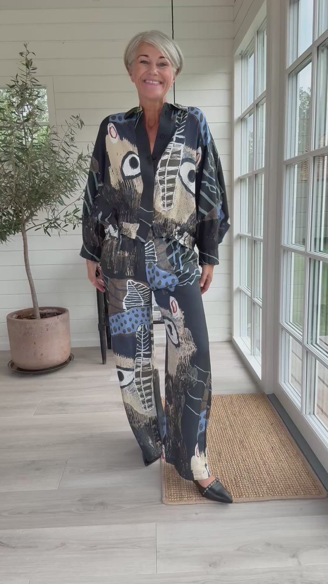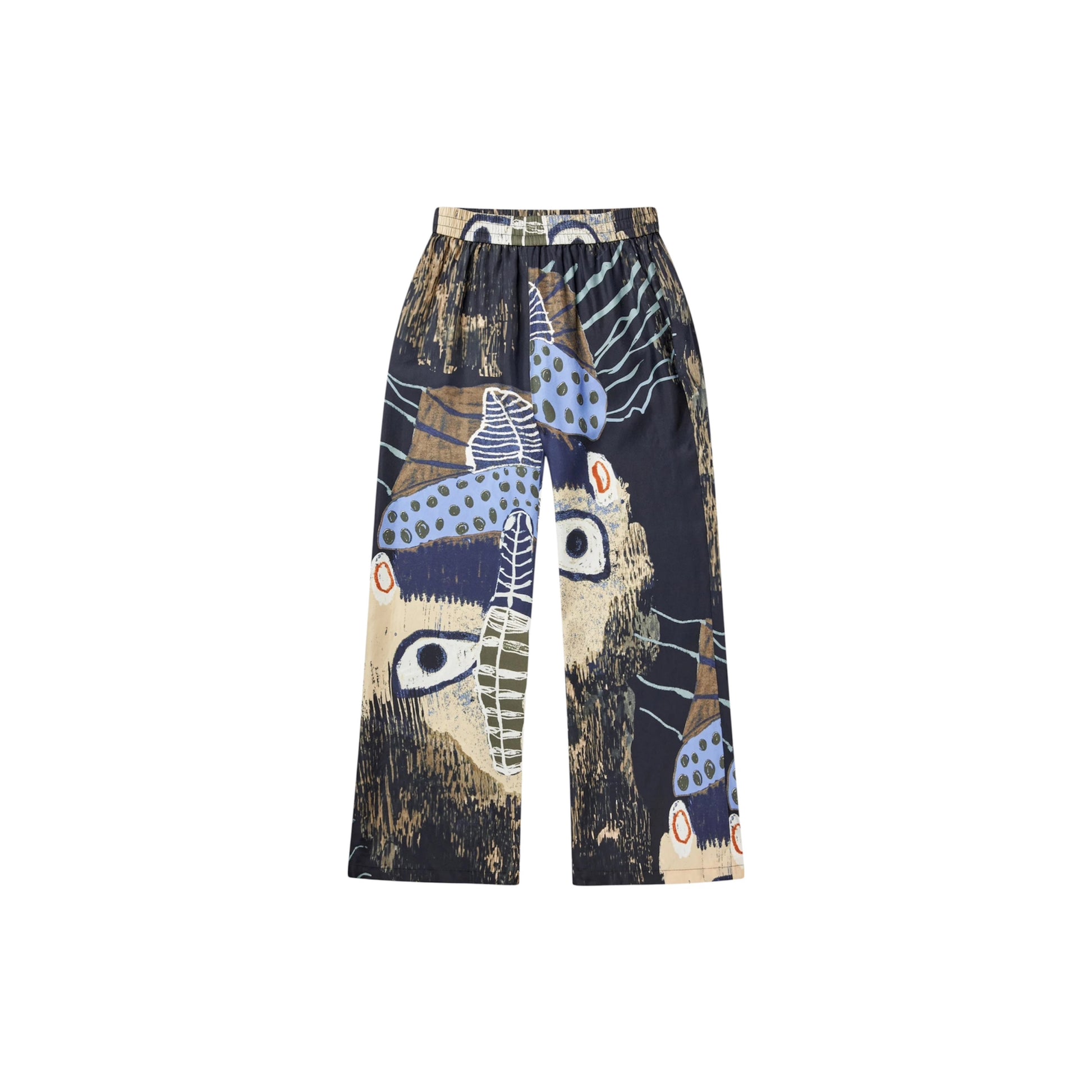 Bukser med et smukt all-over kunst print, lavet af 100% silke. Bukserne er designet med lommer og elastik i taljen. Fit: Loose/Long