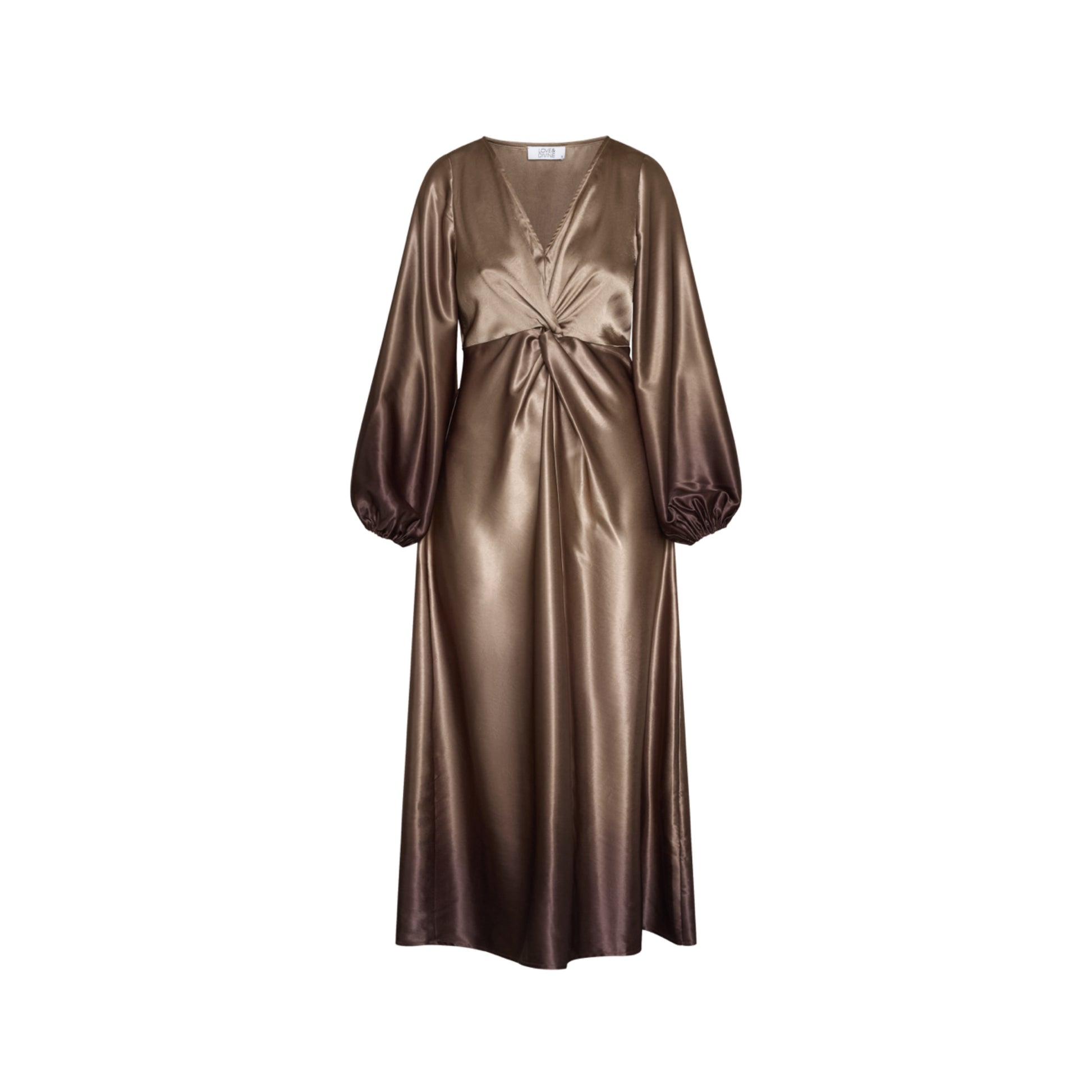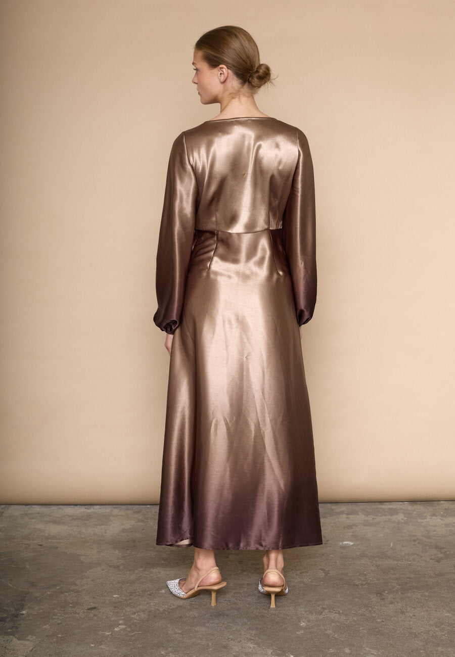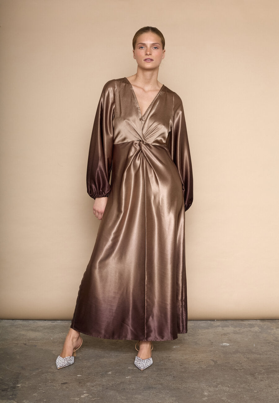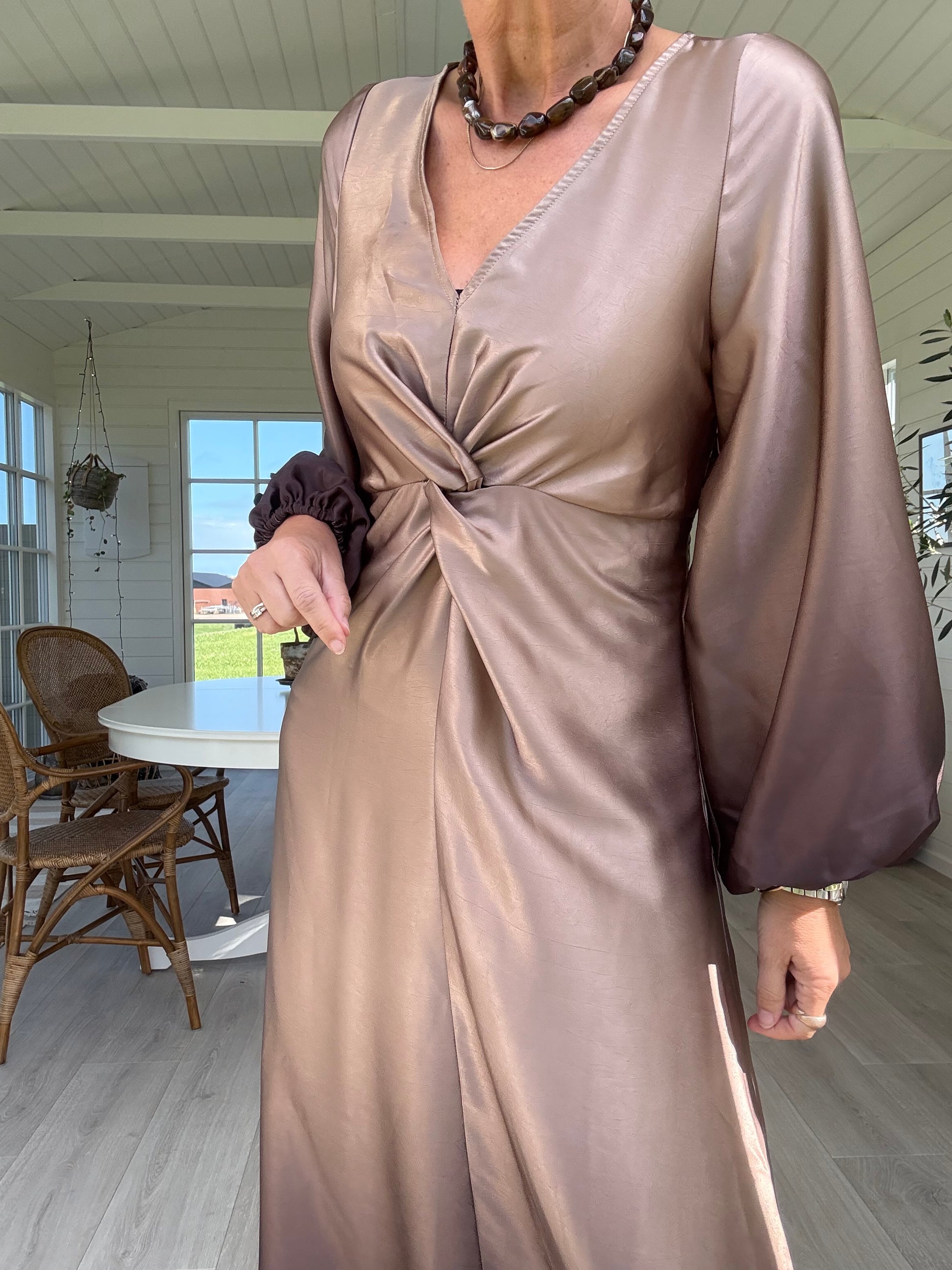 love1404 er en elegant, draperet kjole i et glat, skinnende materiale. kjolen har en v-halsudskæring, lange, voluminøse ærmer og en asymmetrisk slids i siden.