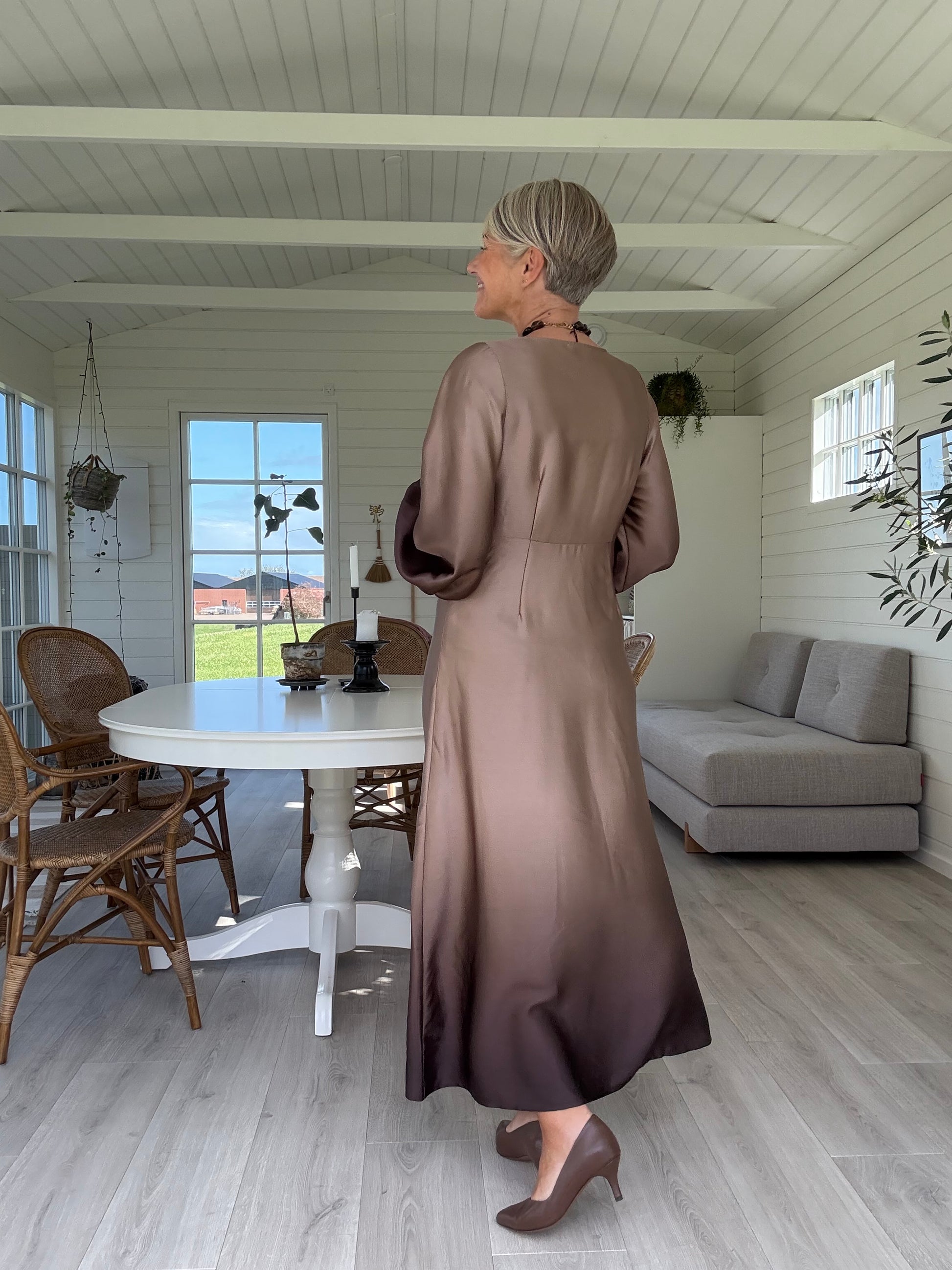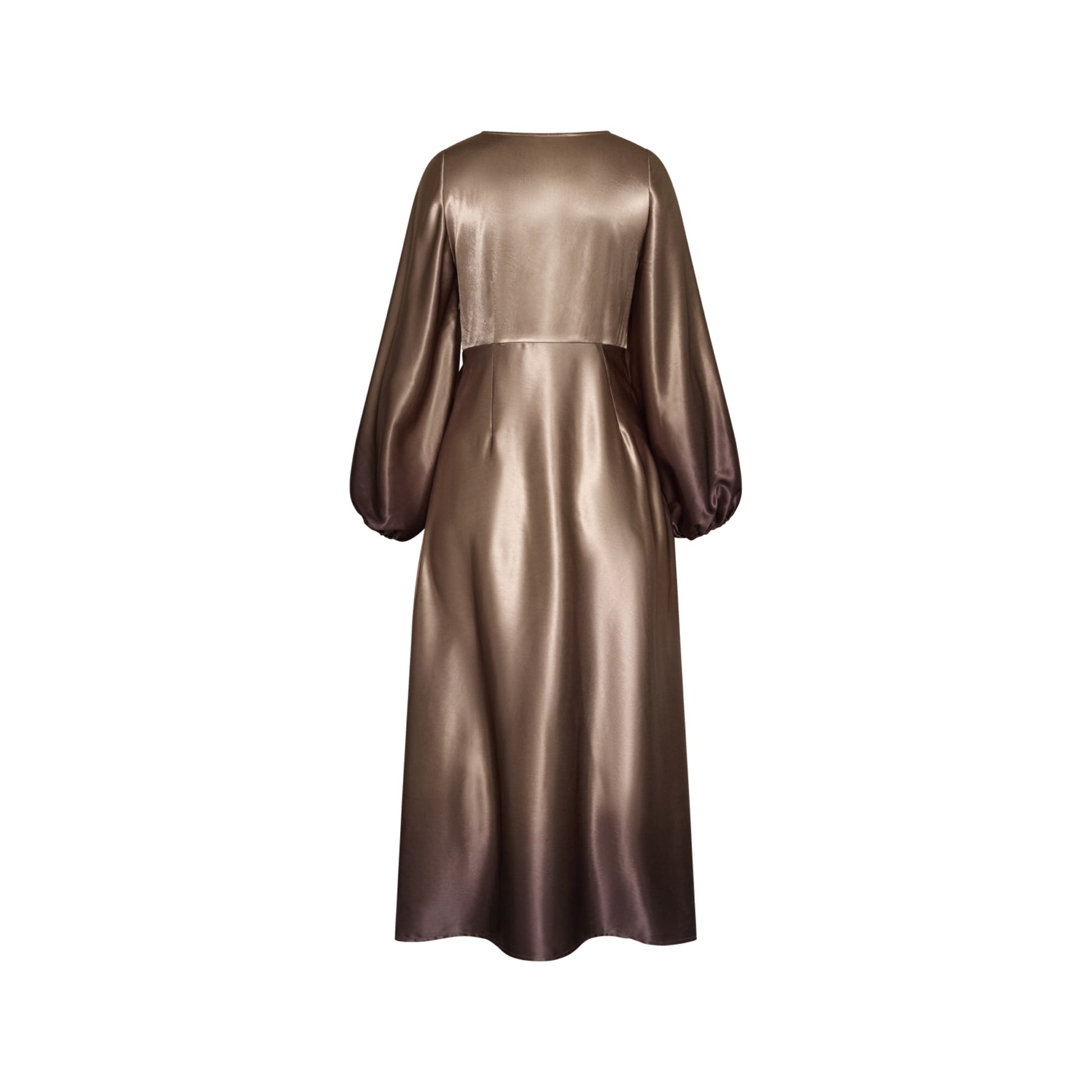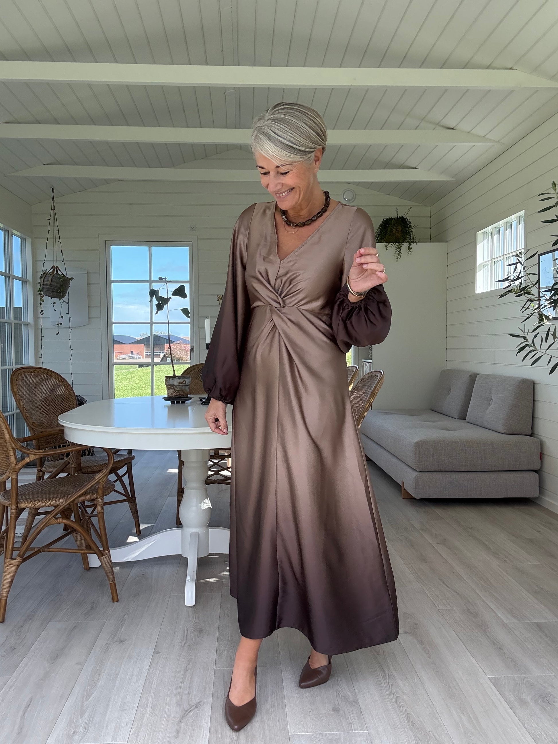 love1404 er en elegant, draperet kjole i et glat, skinnende materiale. kjolen har en v-halsudskæring, lange, voluminøse ærmer og en asymmetrisk slids i siden.