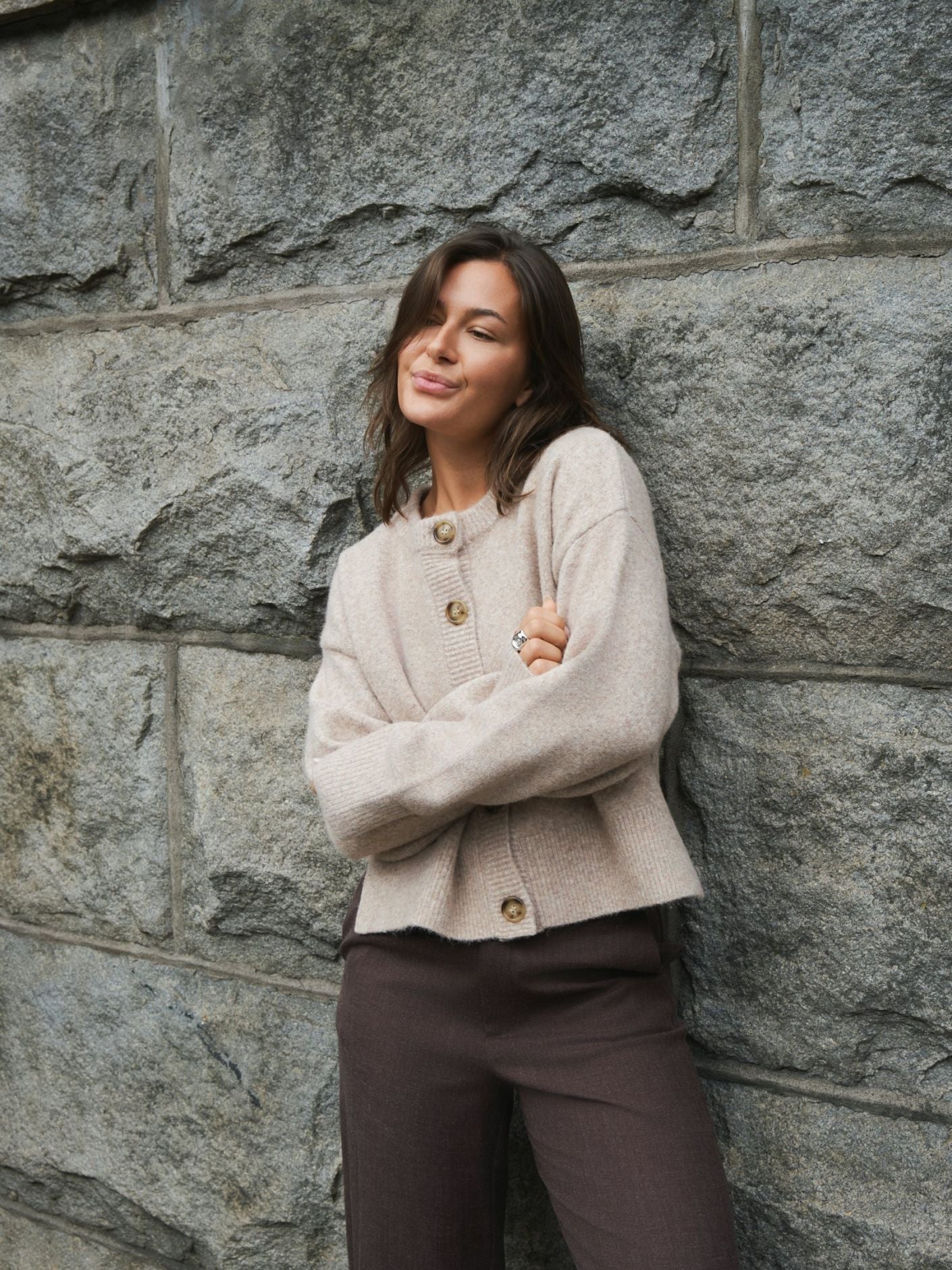 Fin strikket cardigan med boxy fit. Cardiganen er gennemknappet og har slids i siden