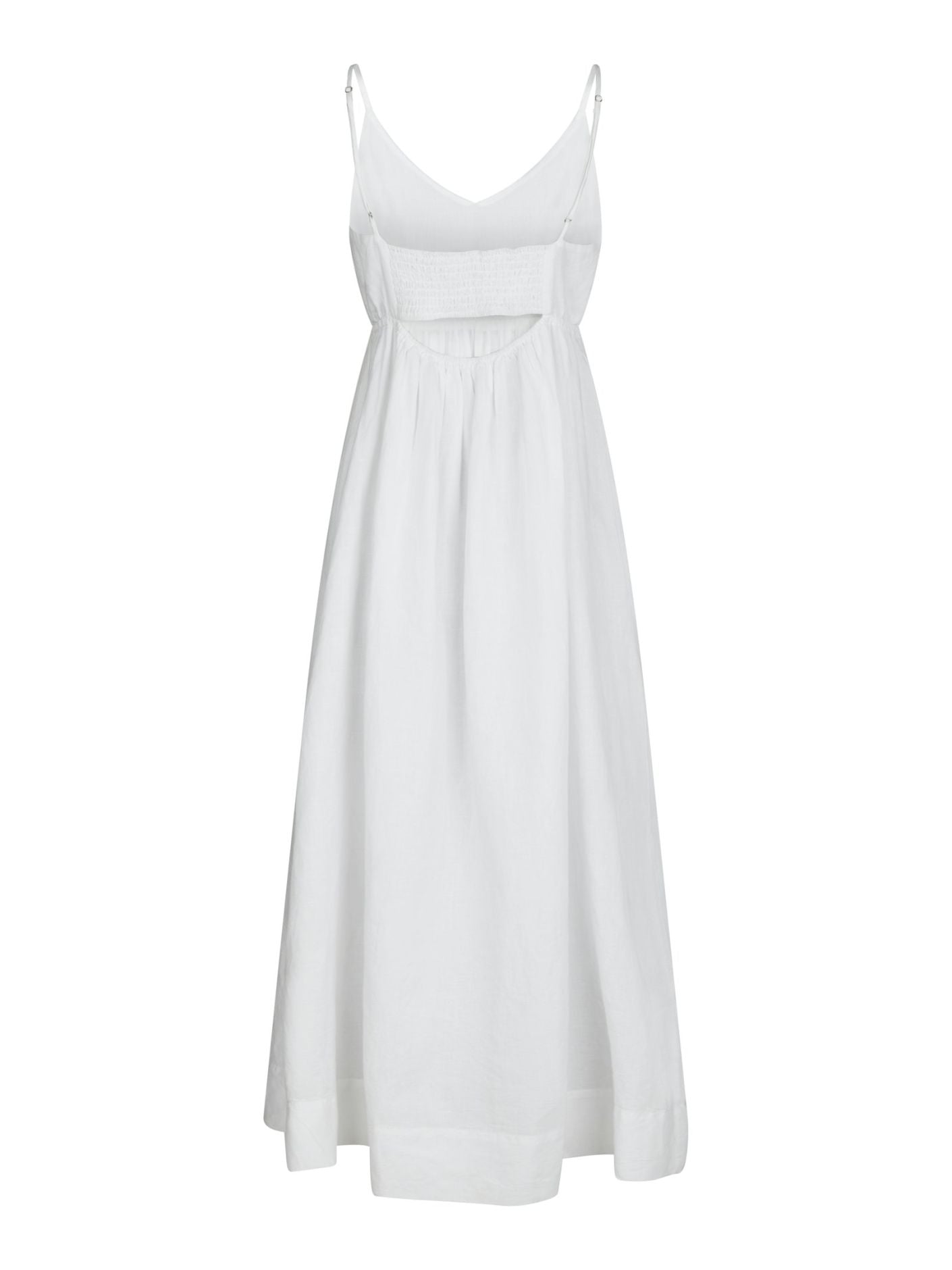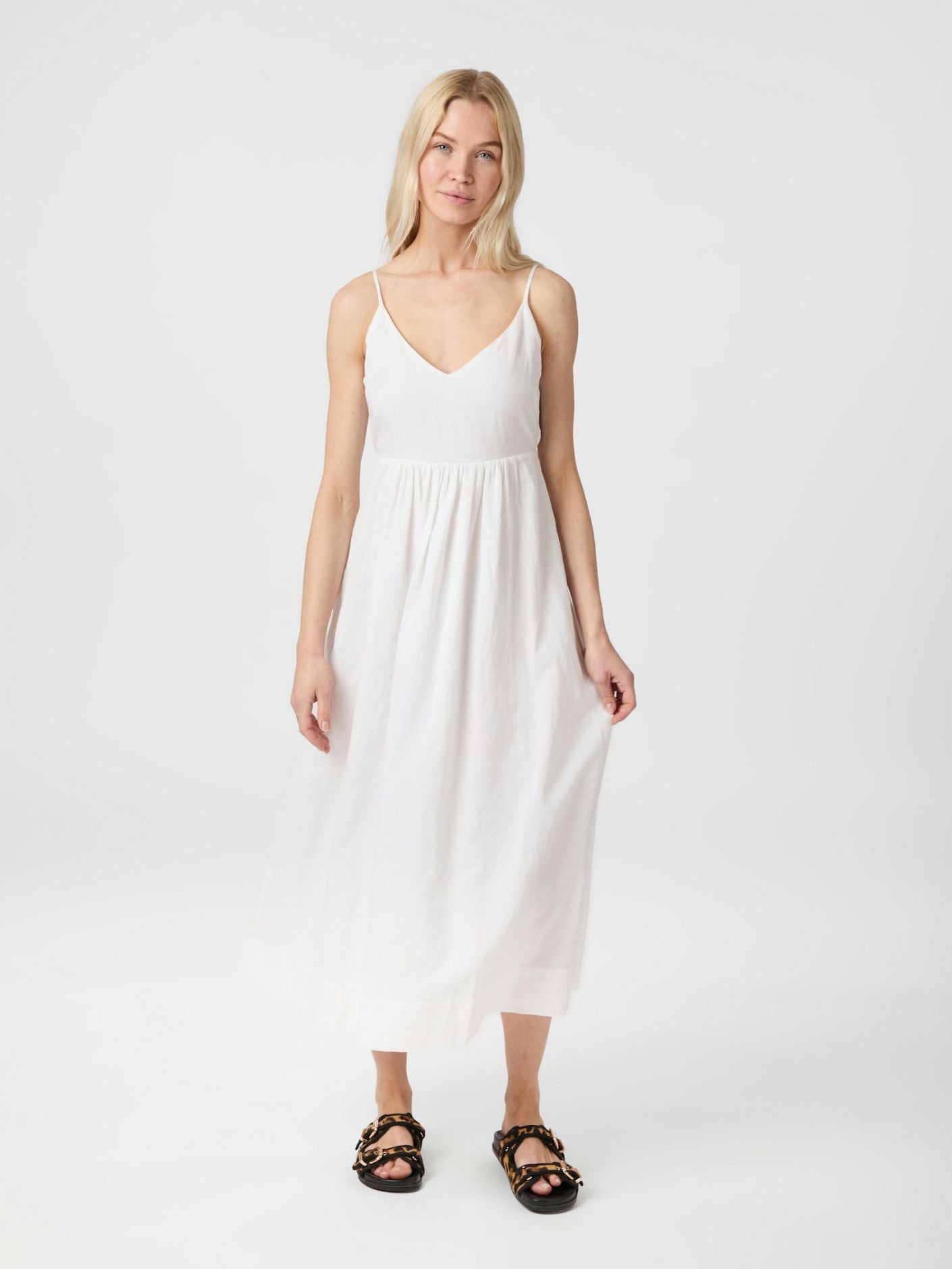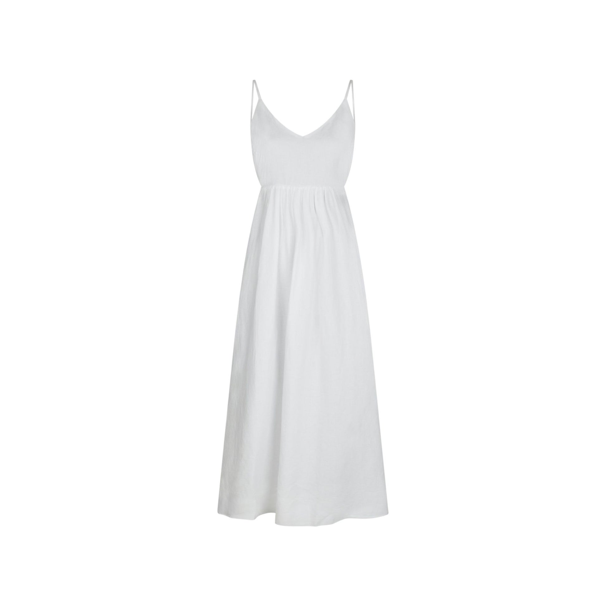 Flot lang stropkjole med v-halsudskæring. Kjolen kommer i en fin hør kvalitet.