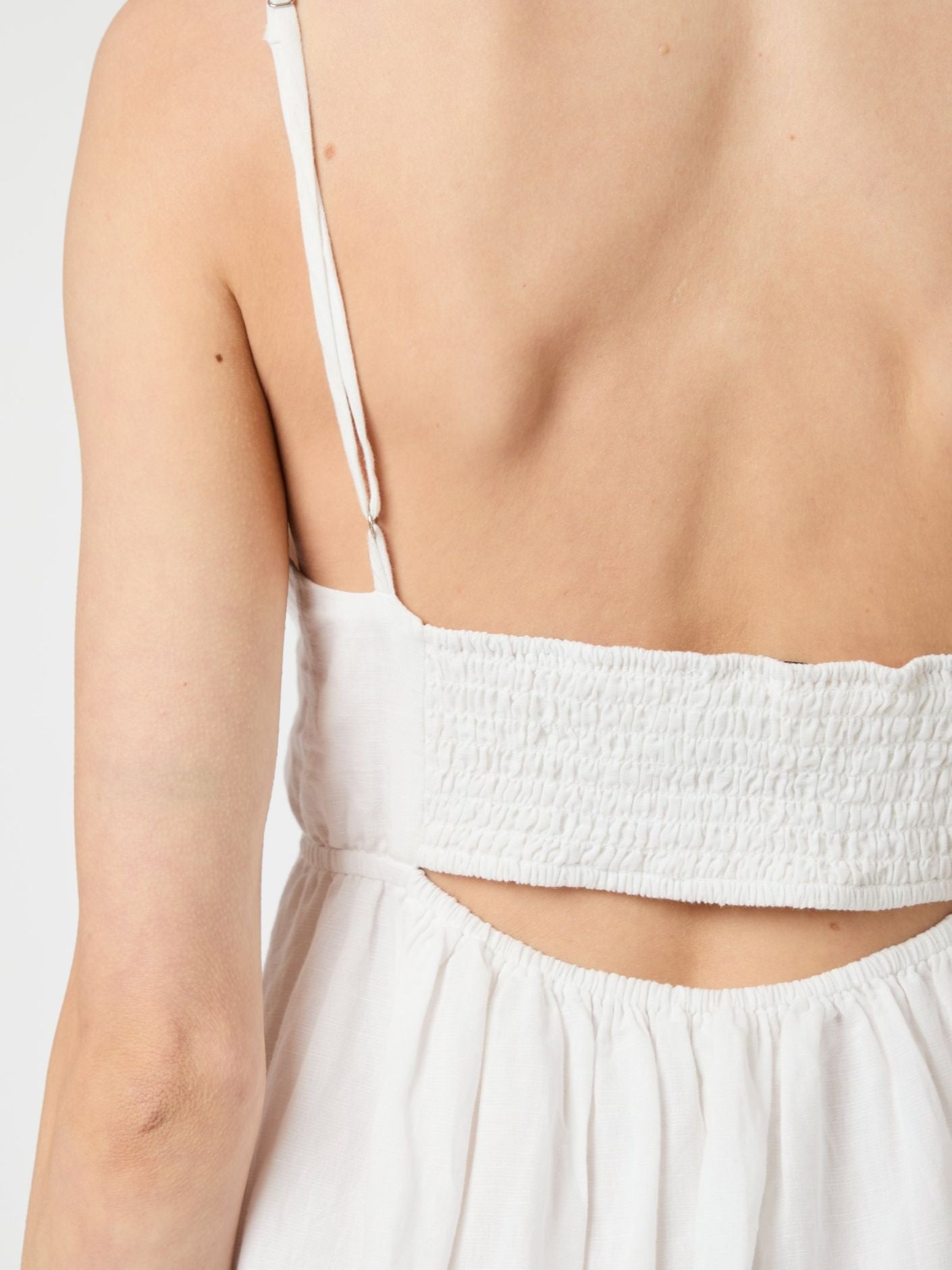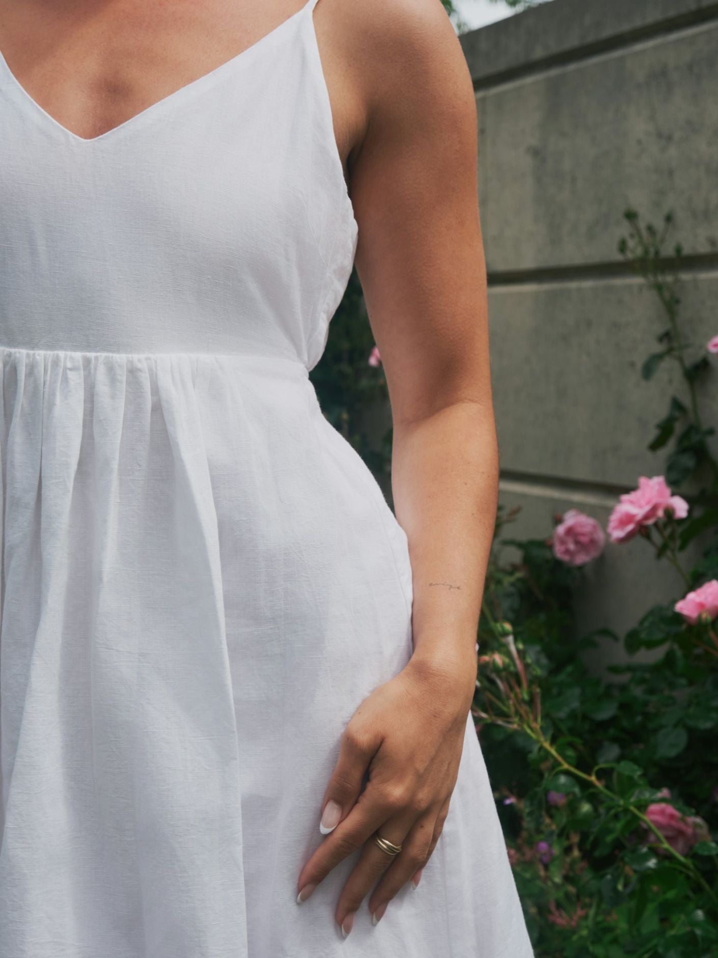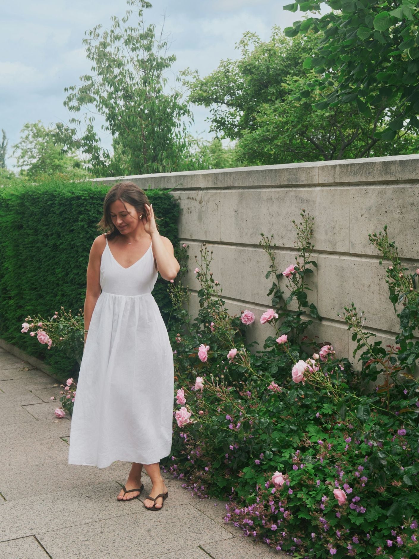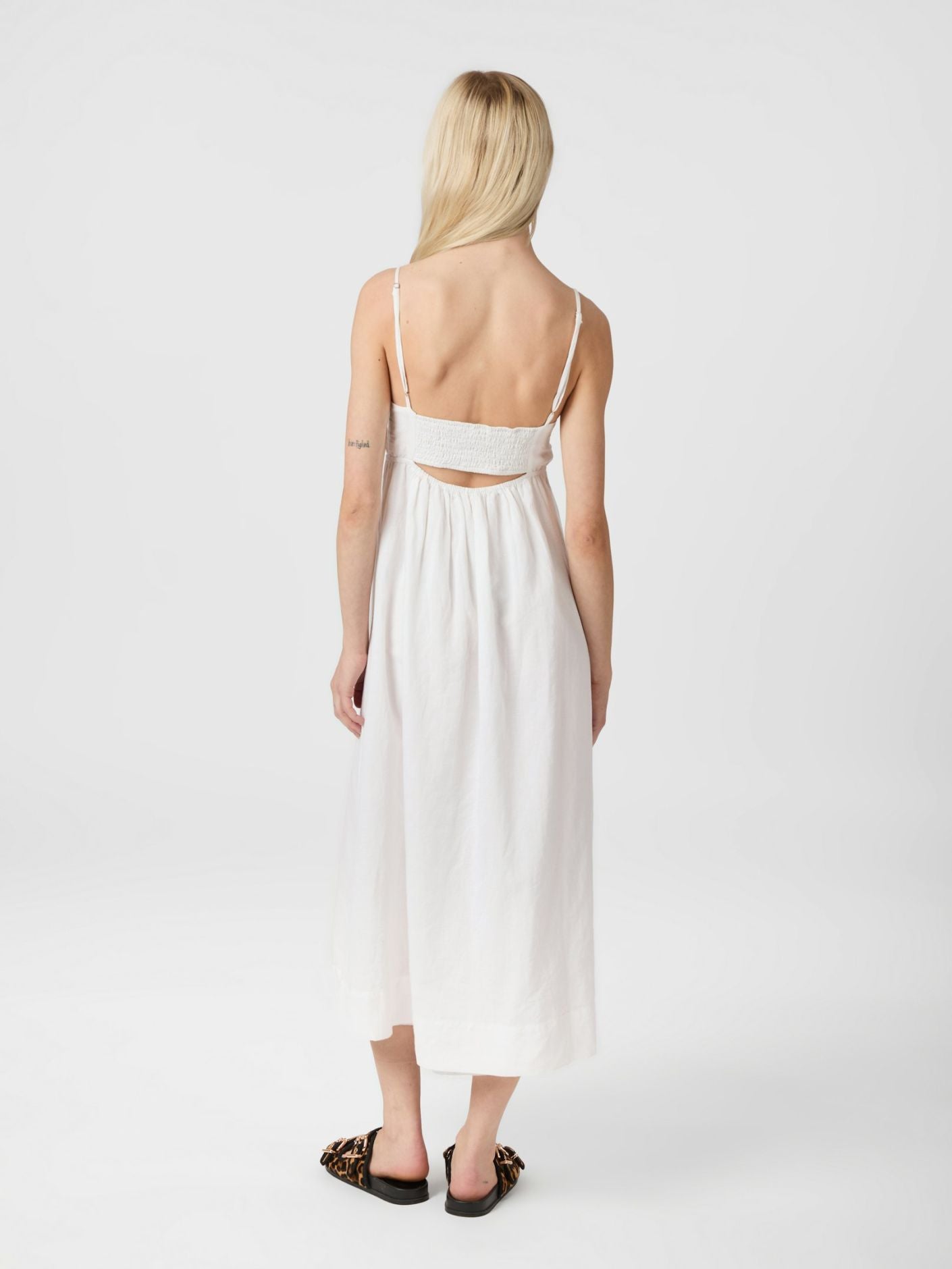 Flot lang stropkjole med v-halsudskæring. Kjolen kommer i en fin hør kvalitet.