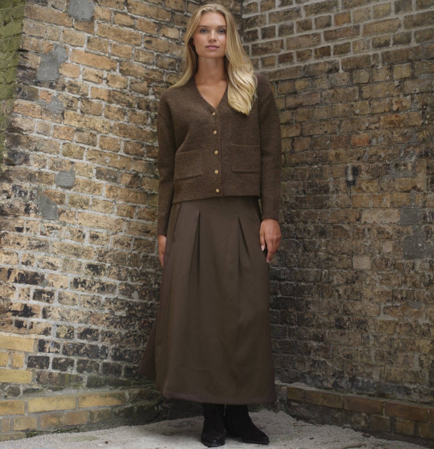 Cardiganen har to påsyede lommer, lukkes med fem fine guldknapper foran og har ribafslutninger på ærmer og i bunden.