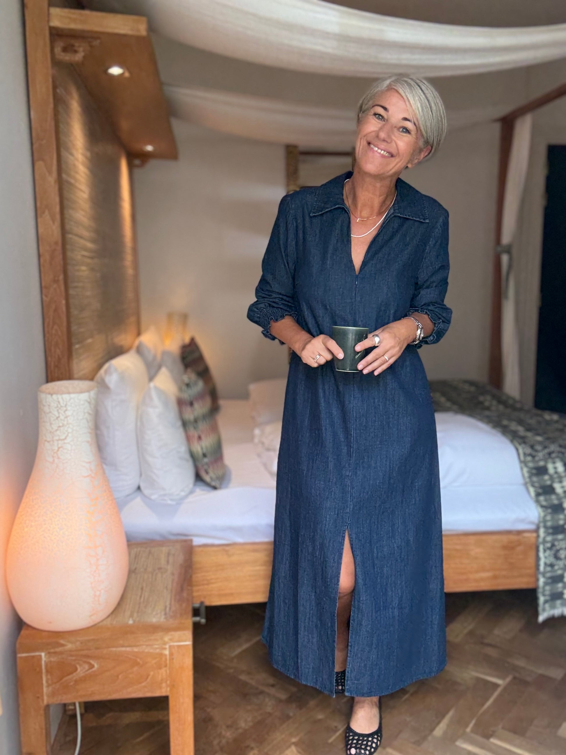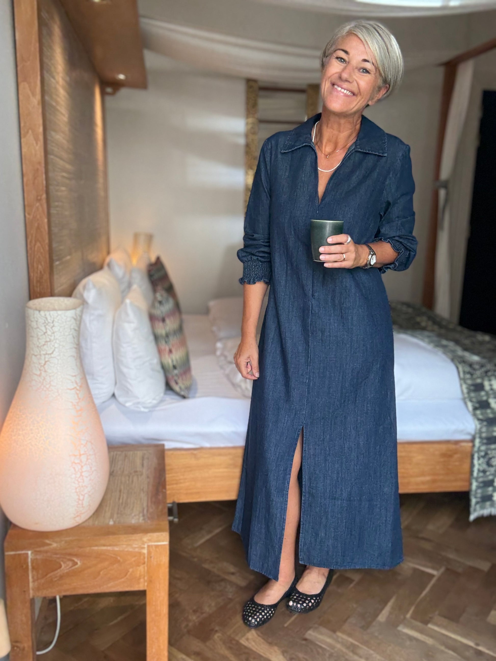 Love1392 er en lang denimkjole i et mørkeblåt vasket look. Kjolen har en klassisk krave, V-halsudskæring og lange ærmer med smock-detalje ved ærmegabene. Den er designet med en slids midt foran. Modellen har en str. S på.