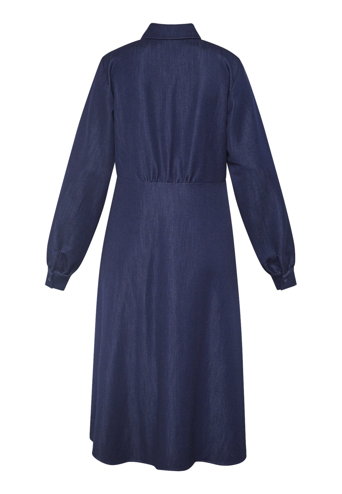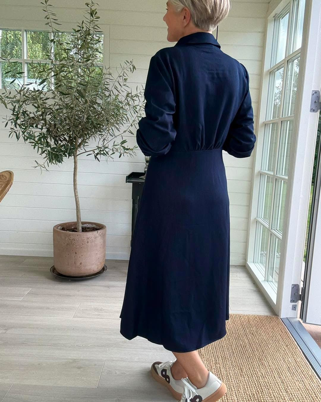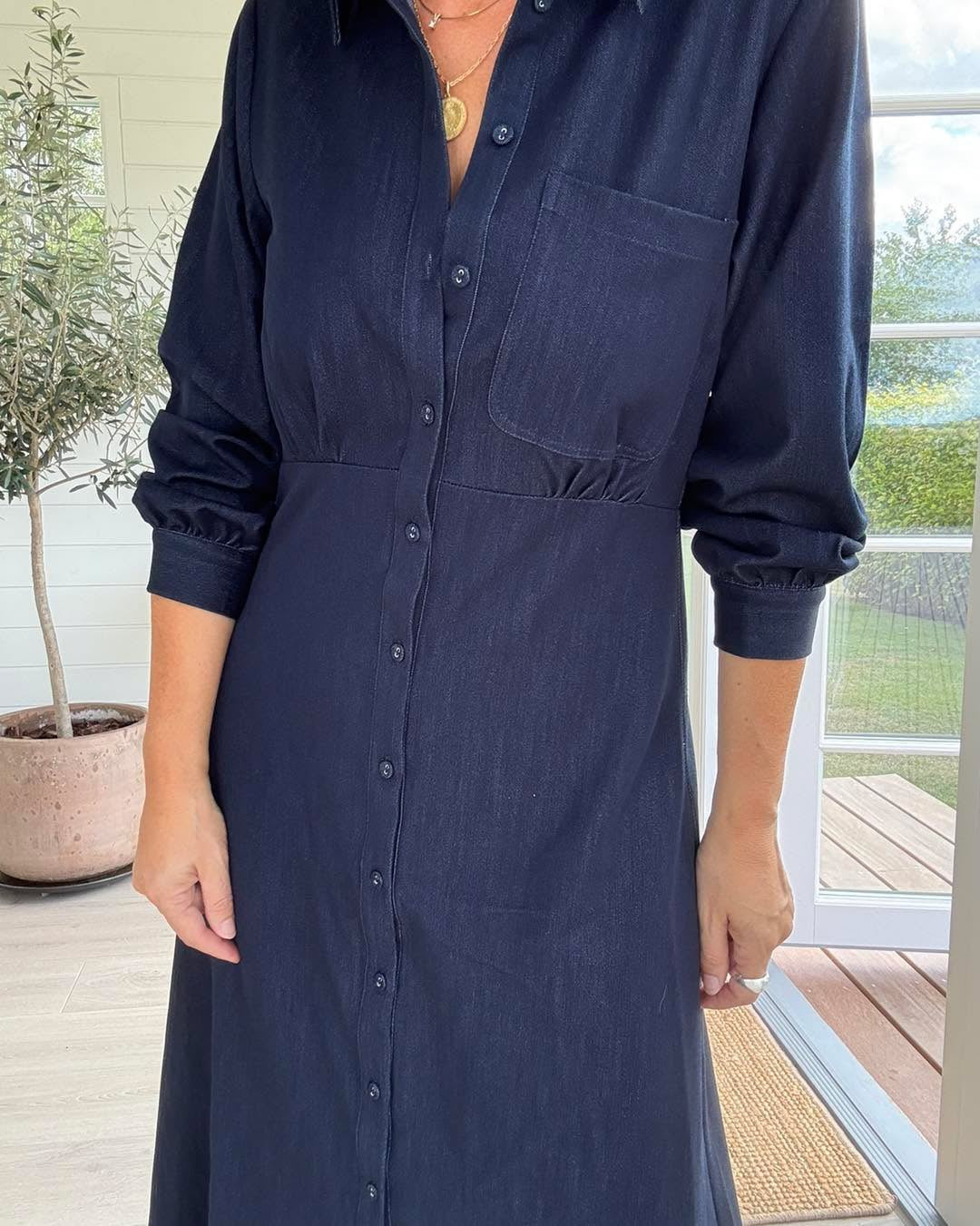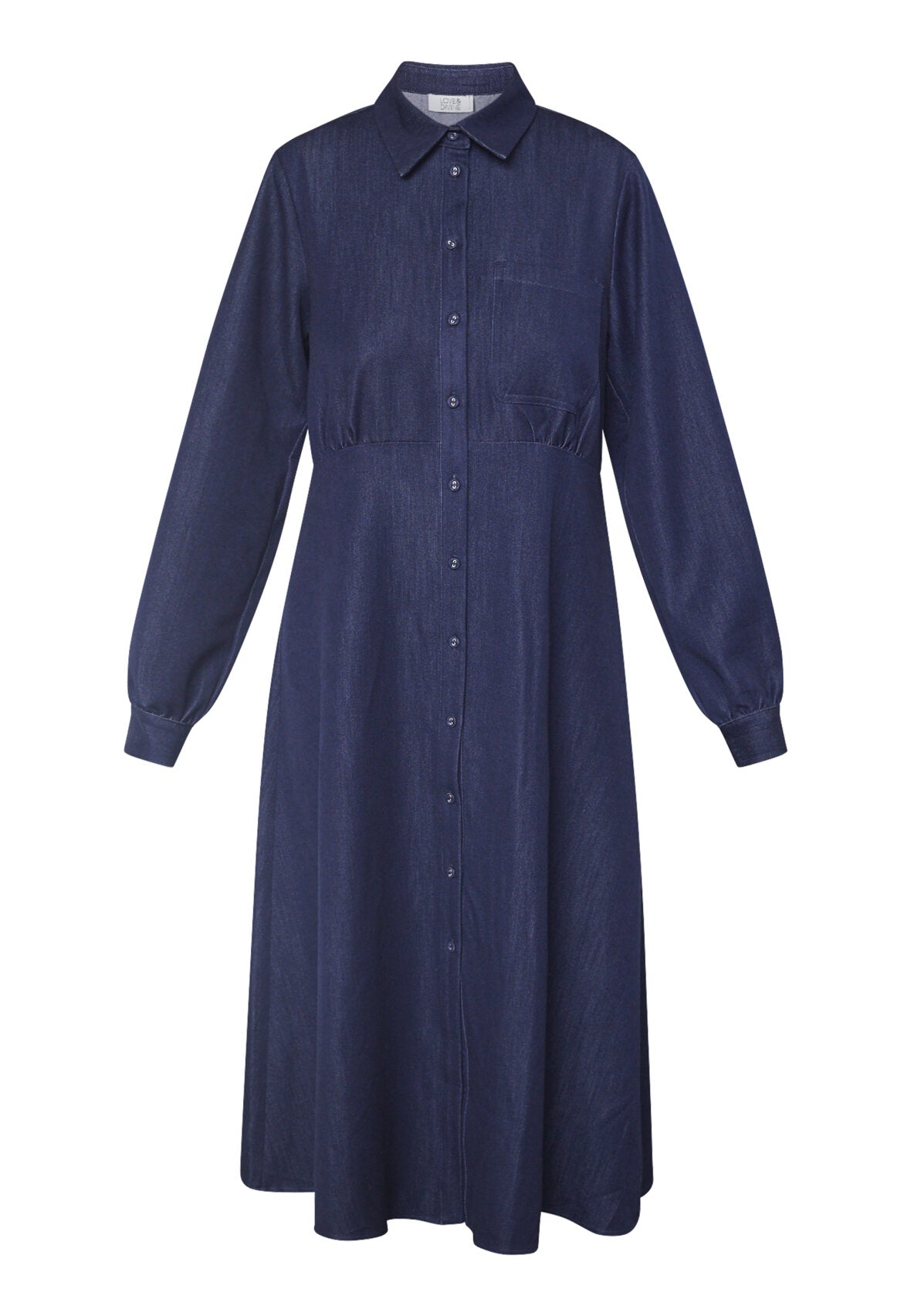 Love1420 er en super elegant lang denimkjole med klassisk skjortekrave, smuk knaplukning, brystlomme og en flatterende pasform i taljen.