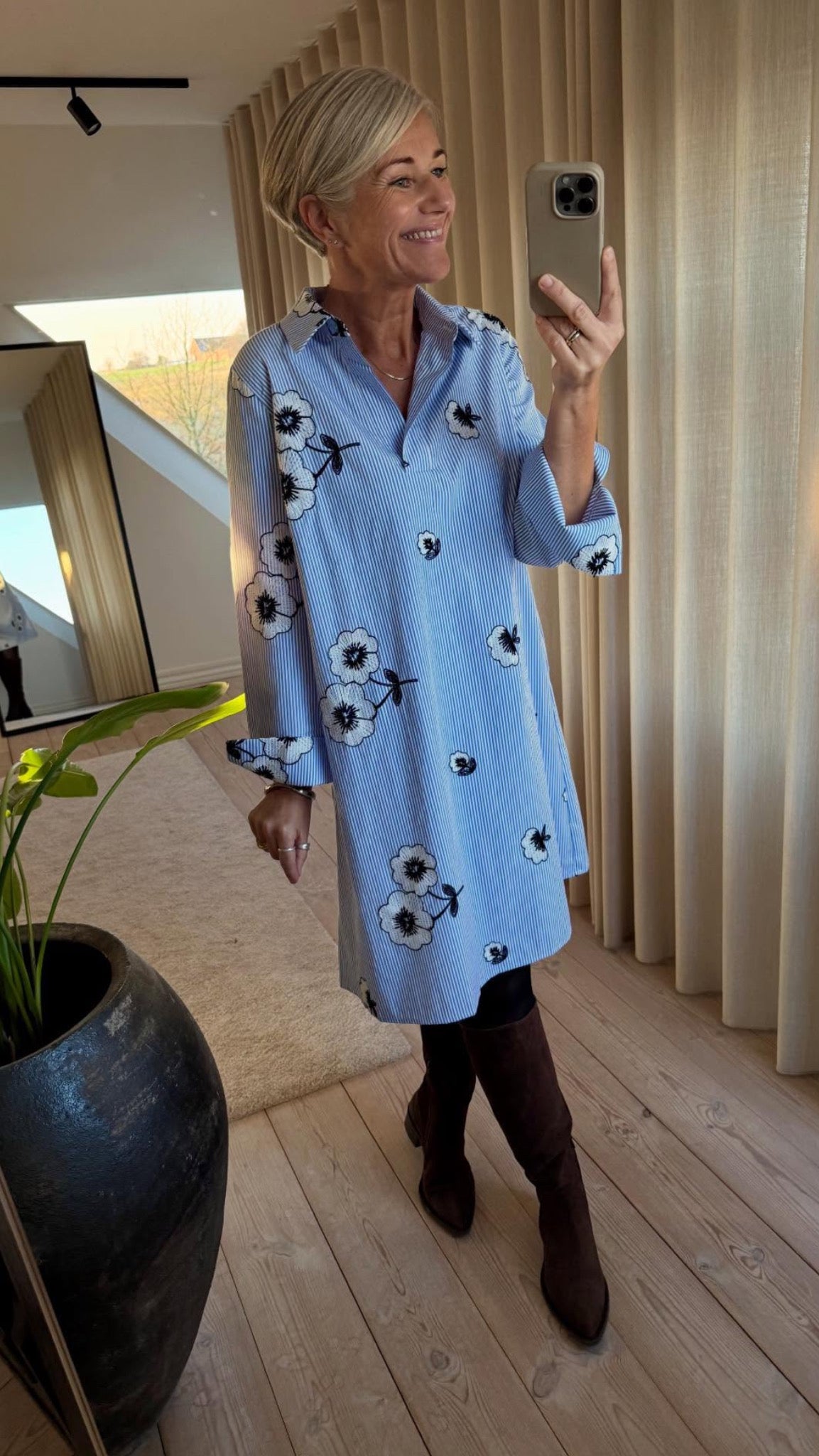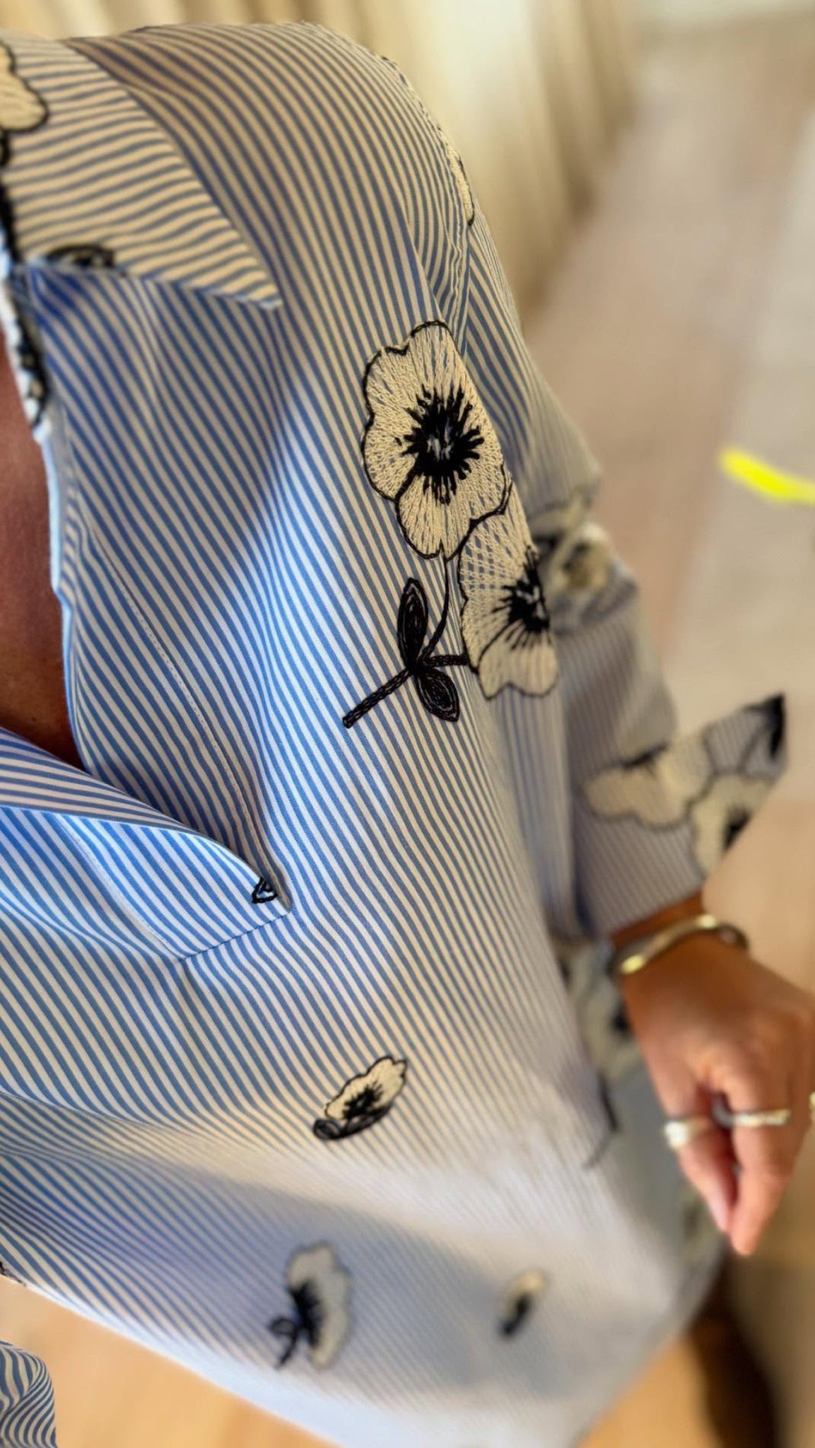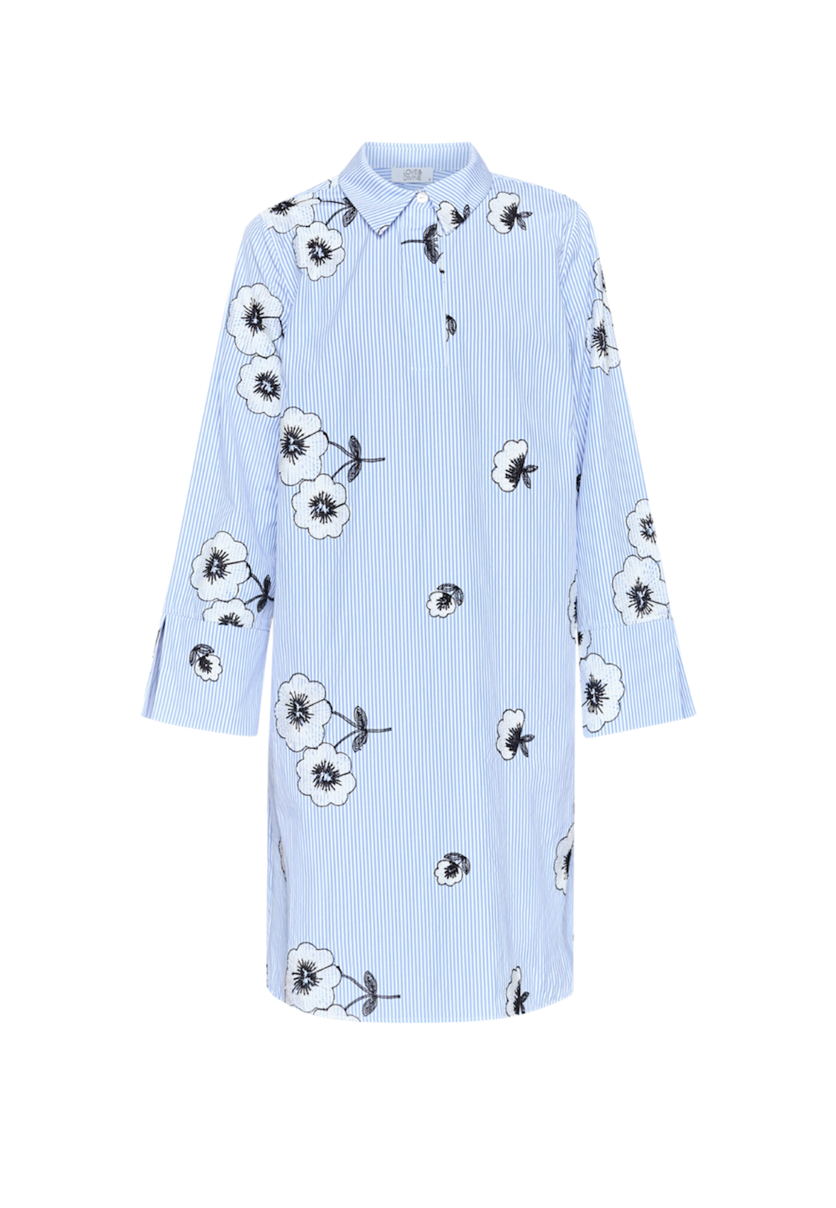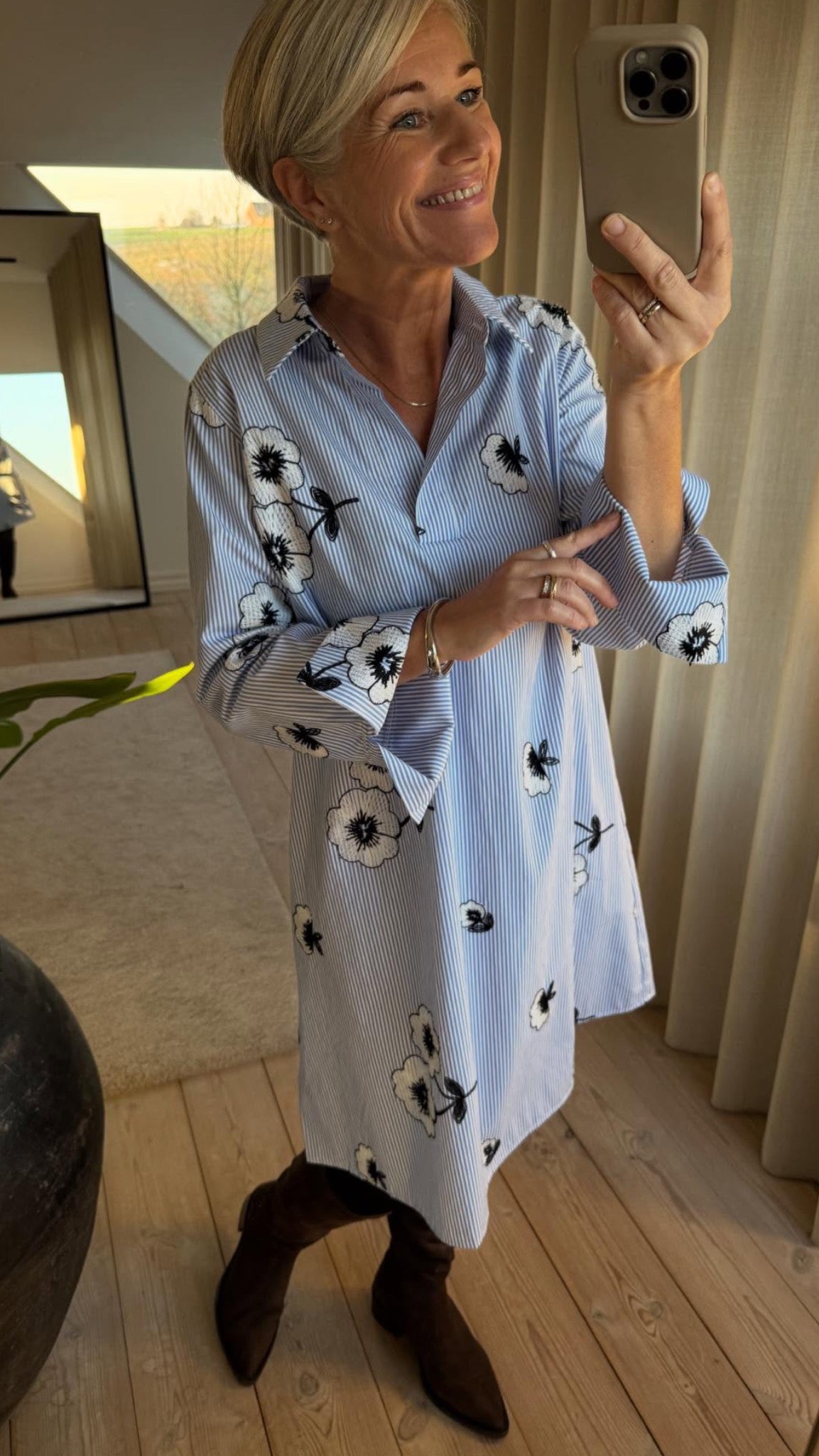 love1476 er en stribet skjortekjole med et unikt blomster broderi. Kjolen har lange voluminøse ærmer, klassisk krave og knaplukning.
