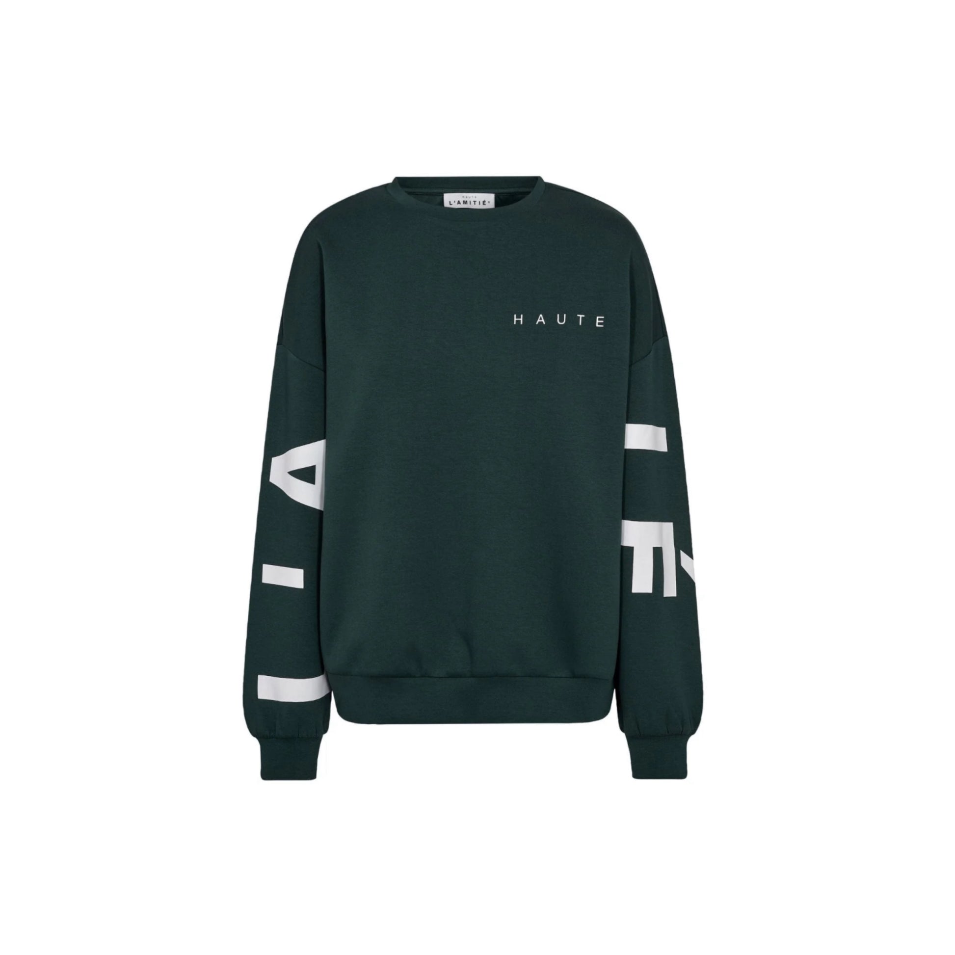 Super lækker beigefarvet sweatshirt fra Haute L'Amitie, designet i et enkelt klassisk snit med rund hals, lave skuldersømme og lange ærmer. Sweatshirten har logoprint på brystet og store logobogstaver på ærmerne, der giver et flot grafisk udtryk.