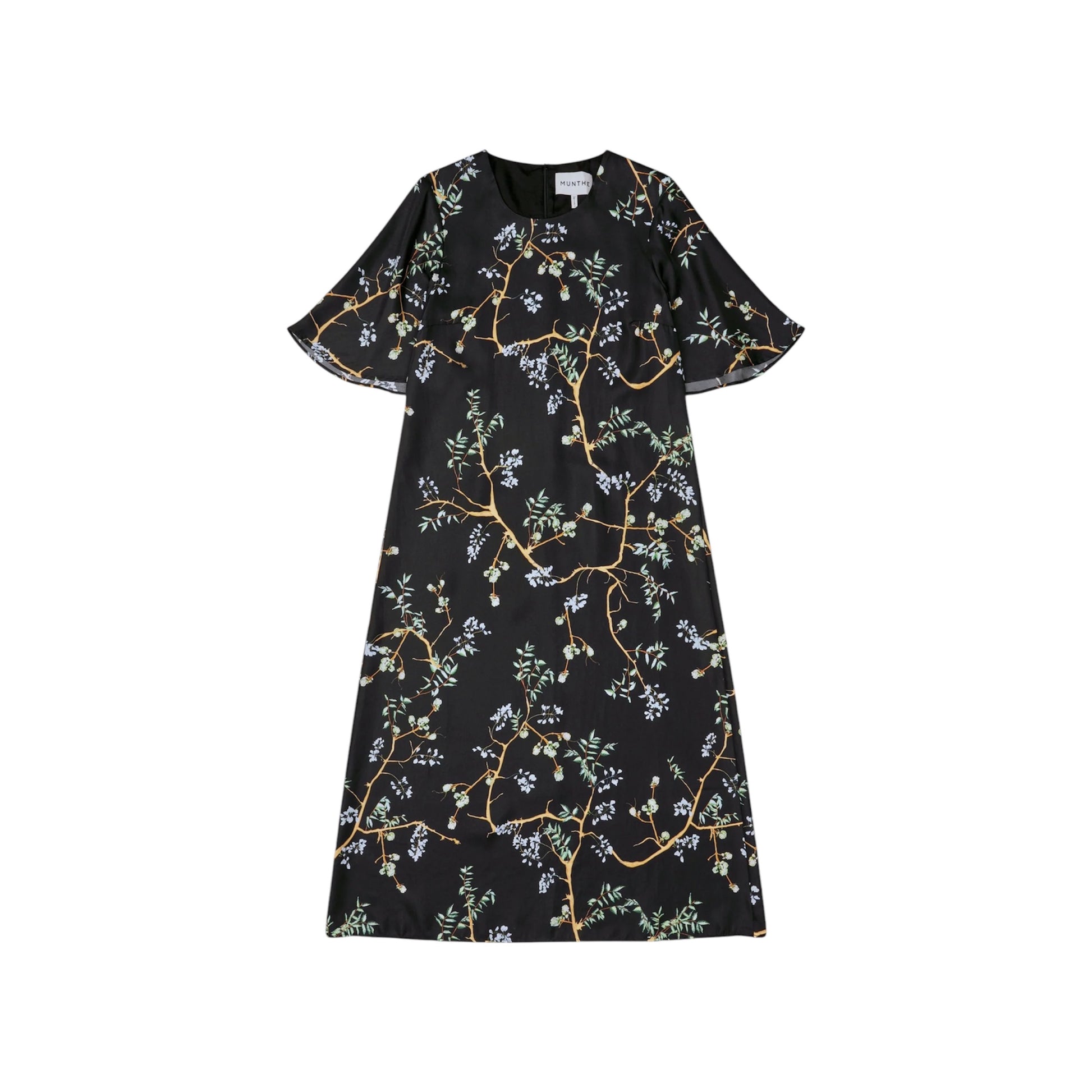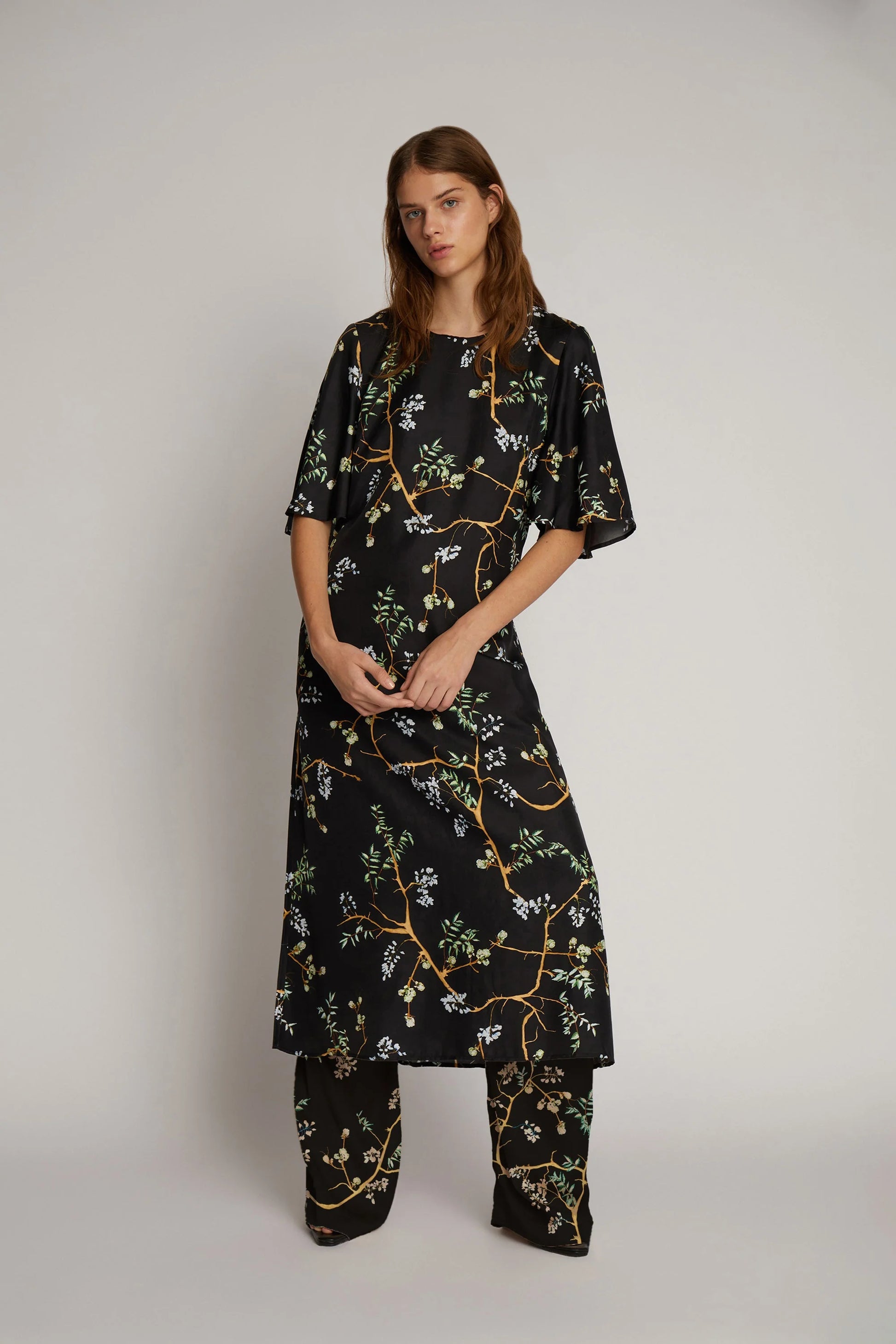 Lang kjole med flot all-over print lavet af 100% silke. Kjolen har korte, løse ærmer, elegant v-udskæring og lukkes med en lyslås bagpå.