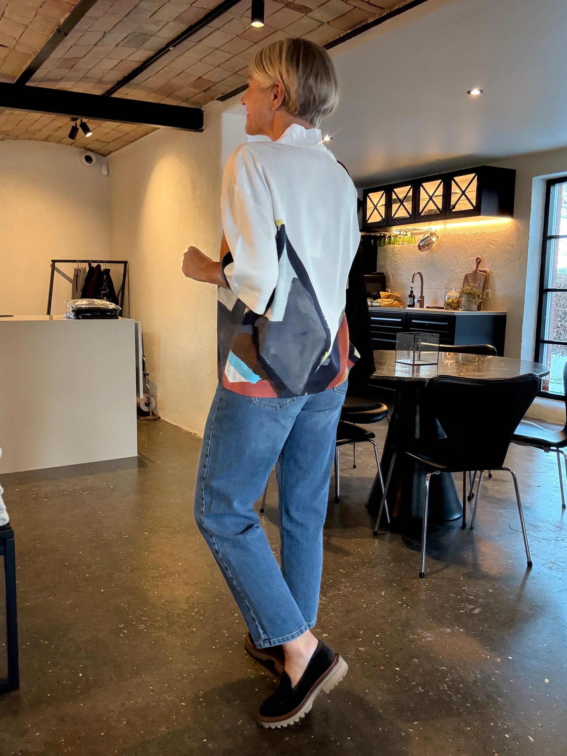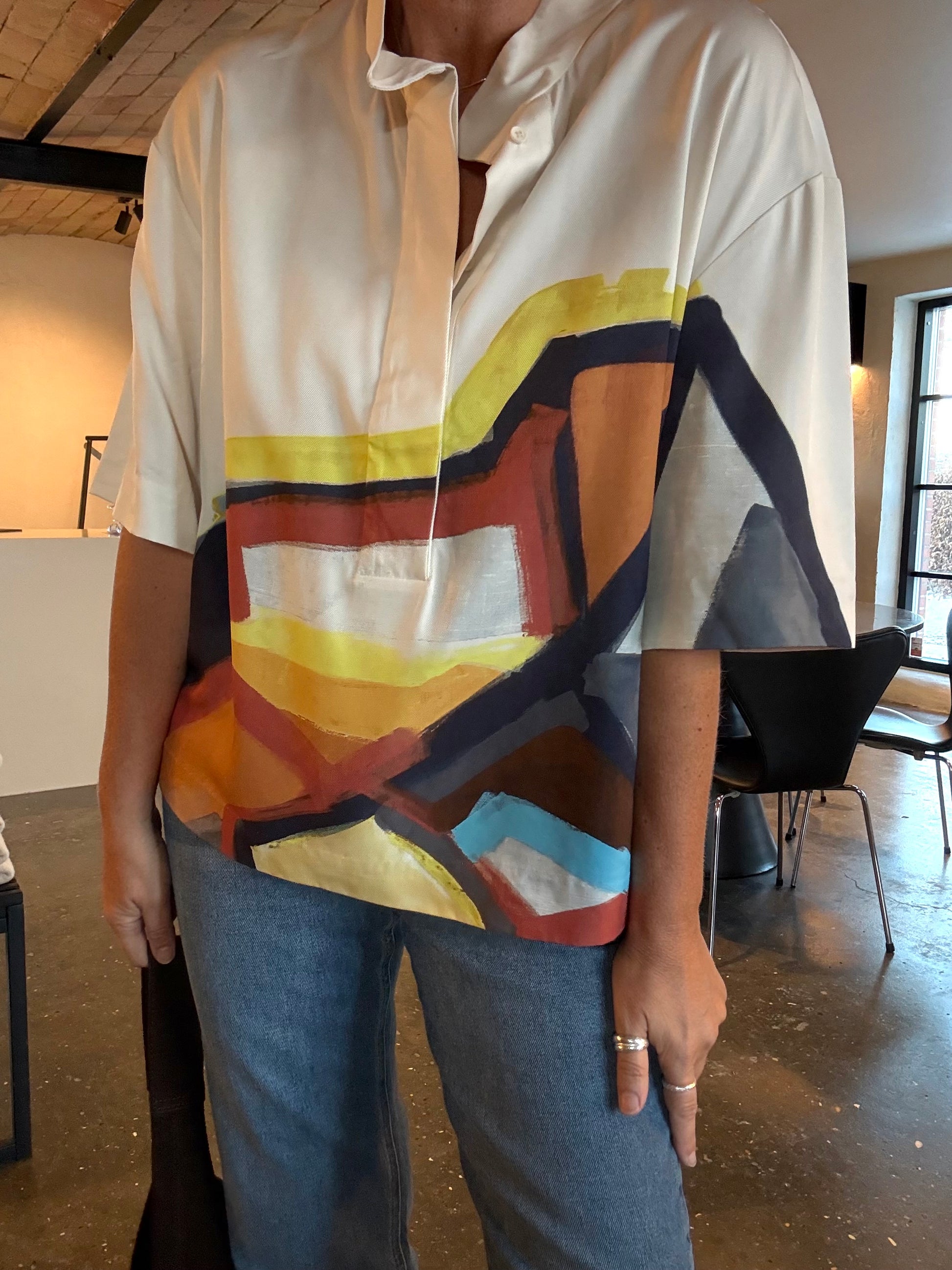 En smuk skjortebluse med et elegant kunstprint. Den er designet med korte ærmer, kan åbnes halvvejs ned og har en lille krave med en fin knaplukningsdetalje. Skjorteblusen har et løst fit.