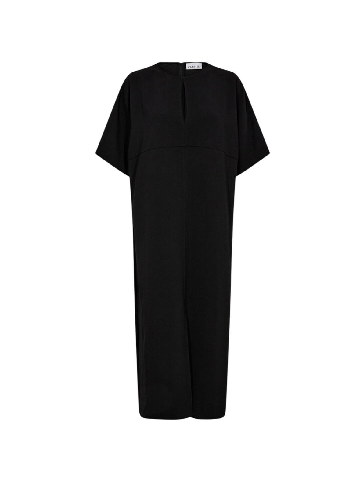 Smuk kjole fra Haute L'amitié i en løs pasform, som falder pænt. Satari kjolen har korte brede ærmer, samt slids foran ved den runde hals. Den lukkes bagpå nakken med skjult lynlås.