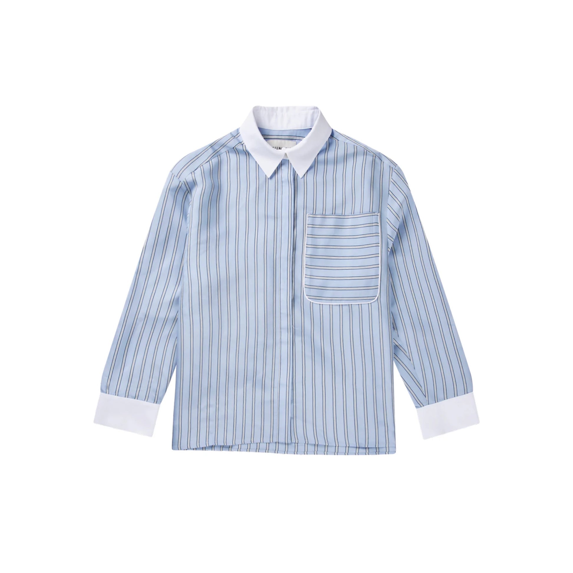 Cool og klassisk løs skjorte med tynde striber fra Munthe. Med oversize brystlomme og smukke hvide manchetter og krave. Løs pasform.