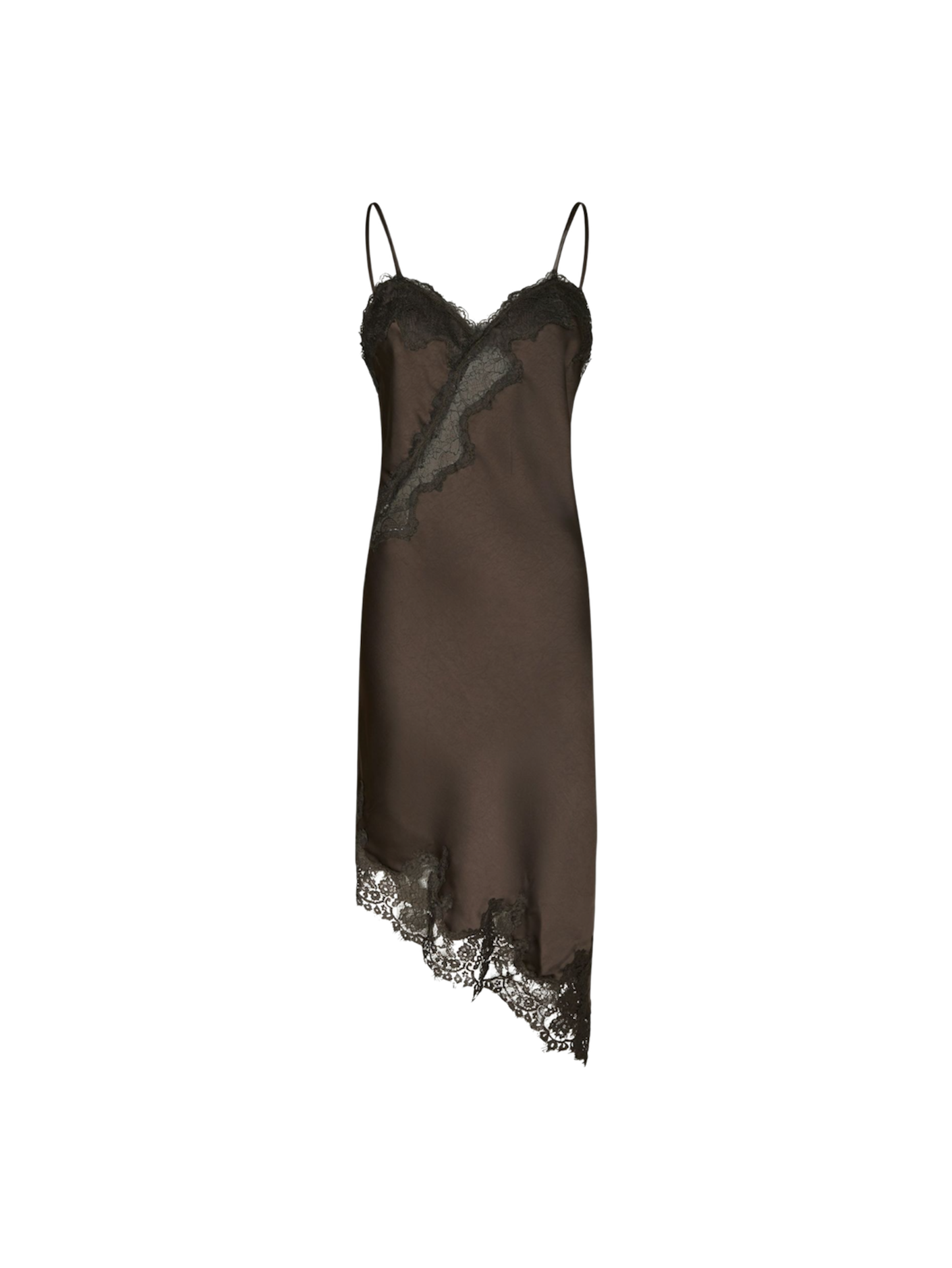 Feminint kjole med blonder detaljer i asymmetrisk form. Kjolen kommer i en lækker satin kvalitet.
